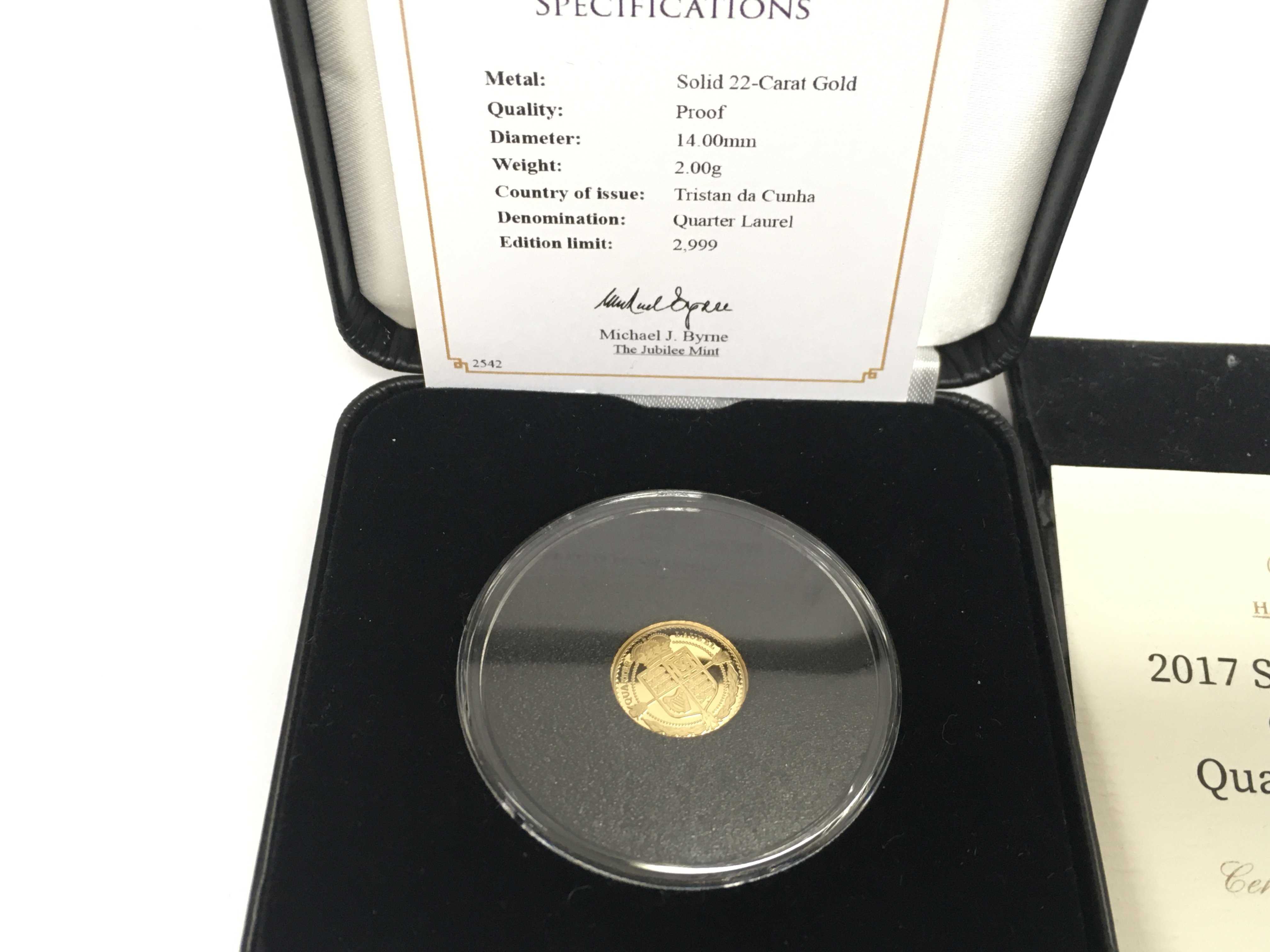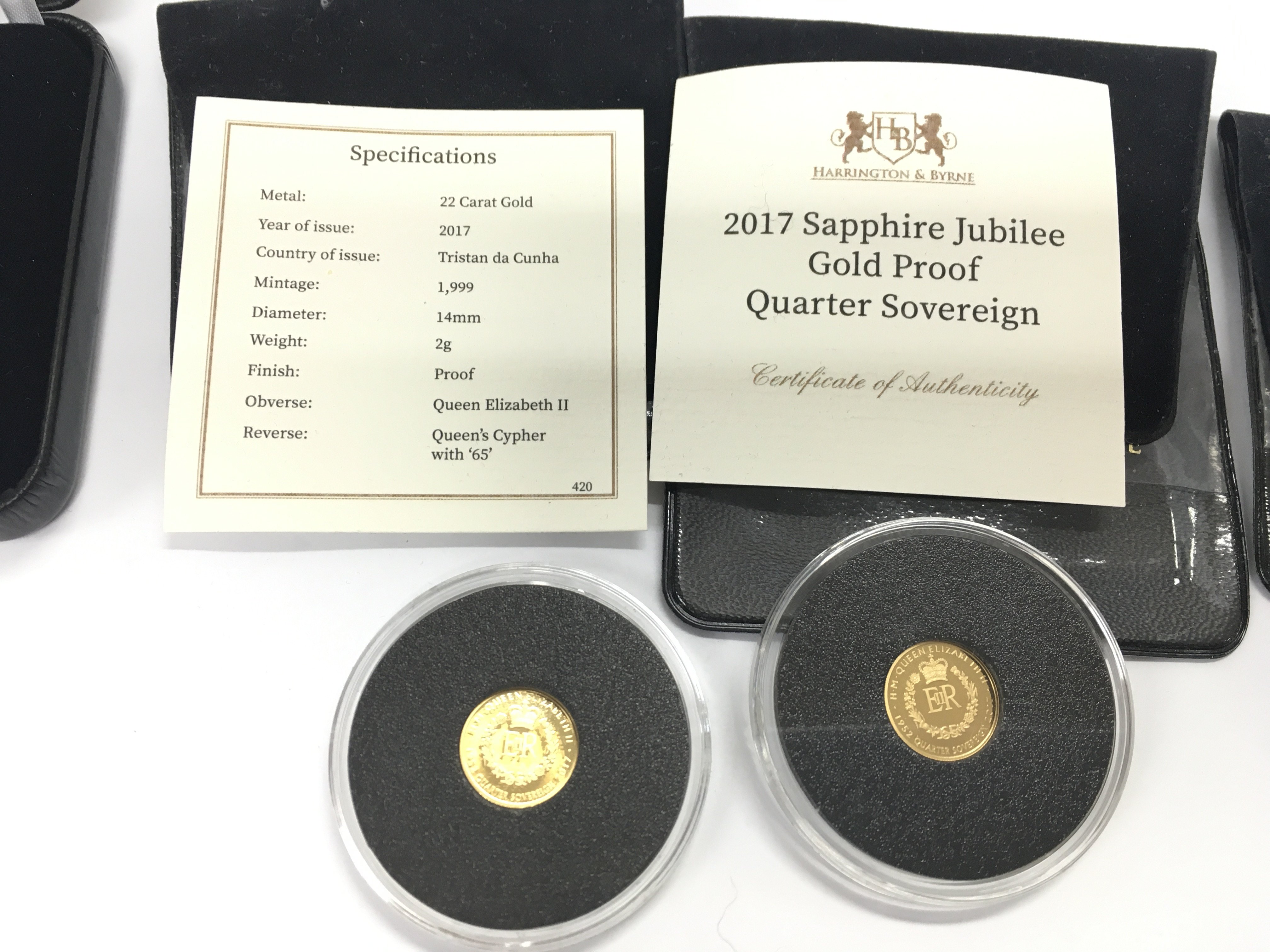 Collection of small gold coins including 2 x 2017 gold proof Quarter Sovereigns with COAs. 6g of 22ct and 1g of 9ct total. Postage B