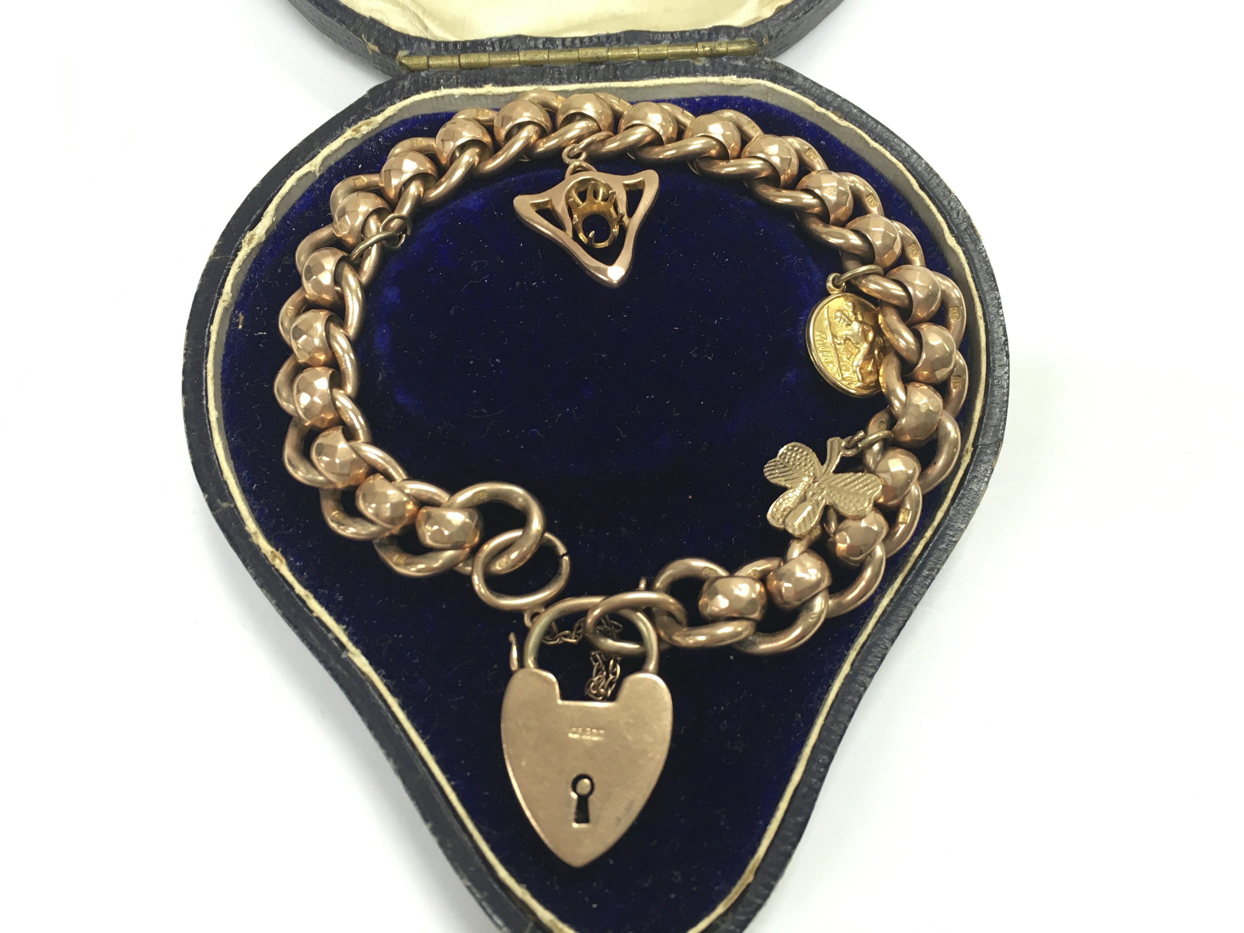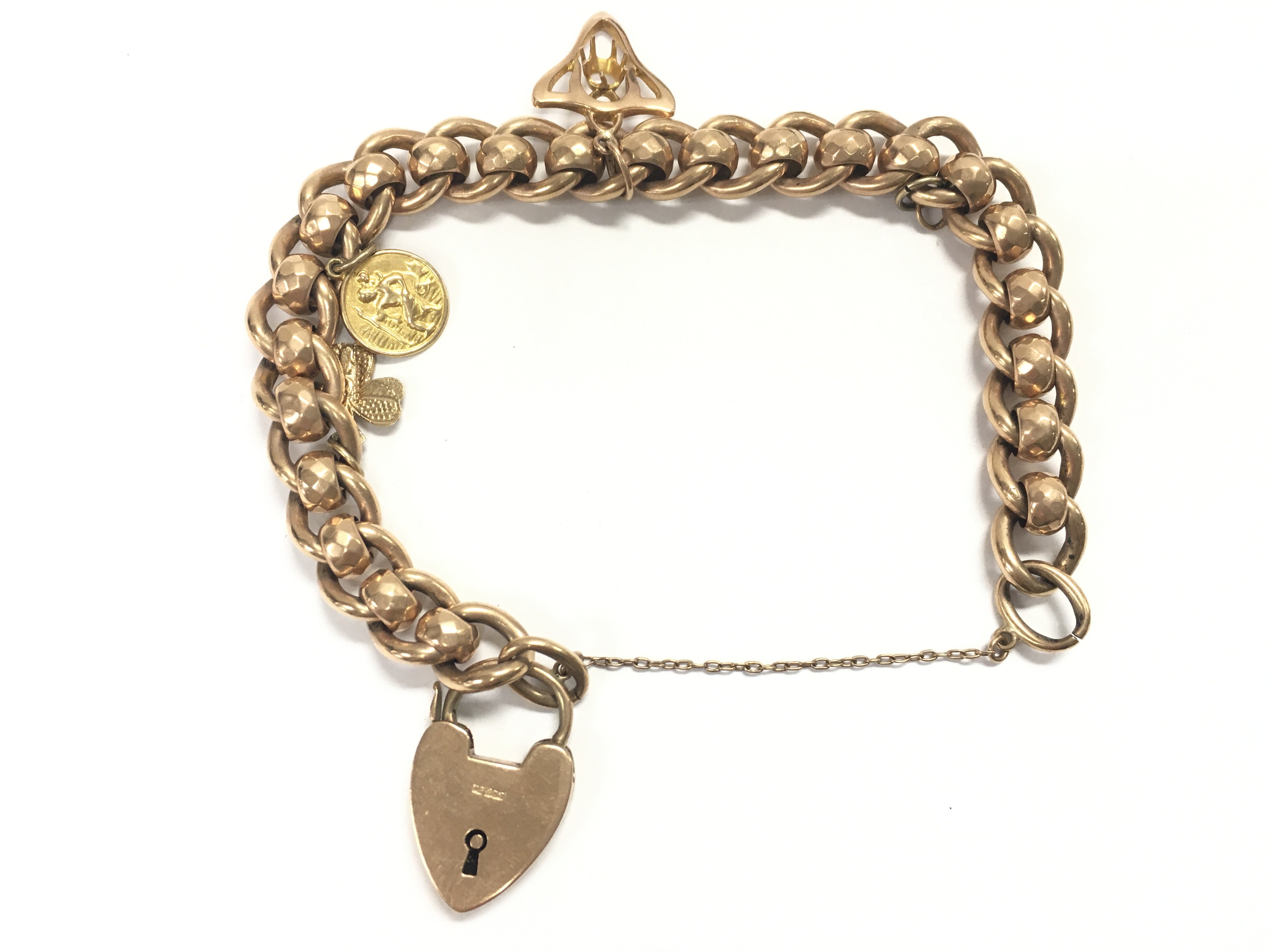 A 9ct gold bracelet with charms and a padlock heart. 23.82g Postage B