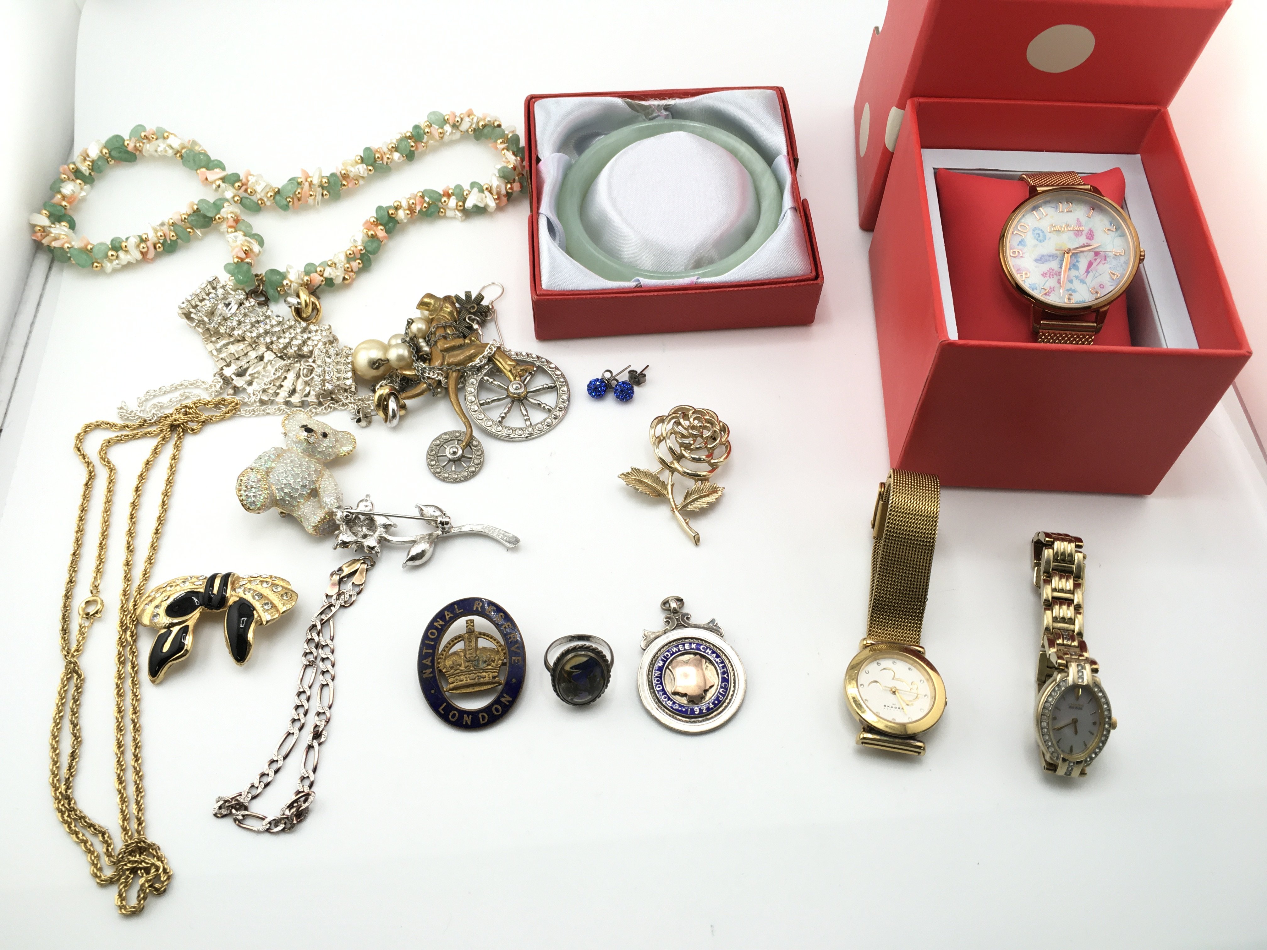 A collection of costume jewellery including a jade bangle and a cath kidston watch. Postage B. NO RESERVE