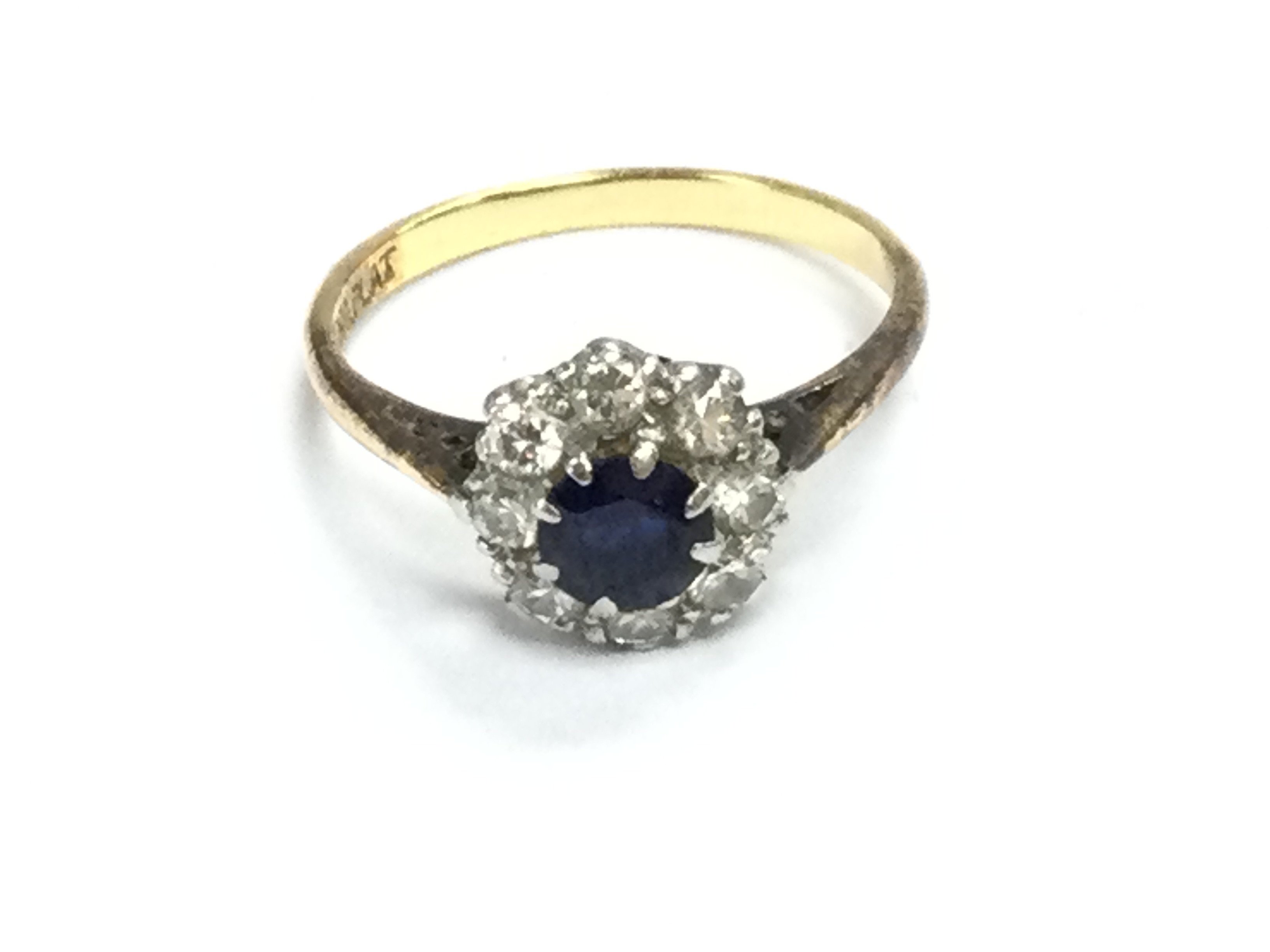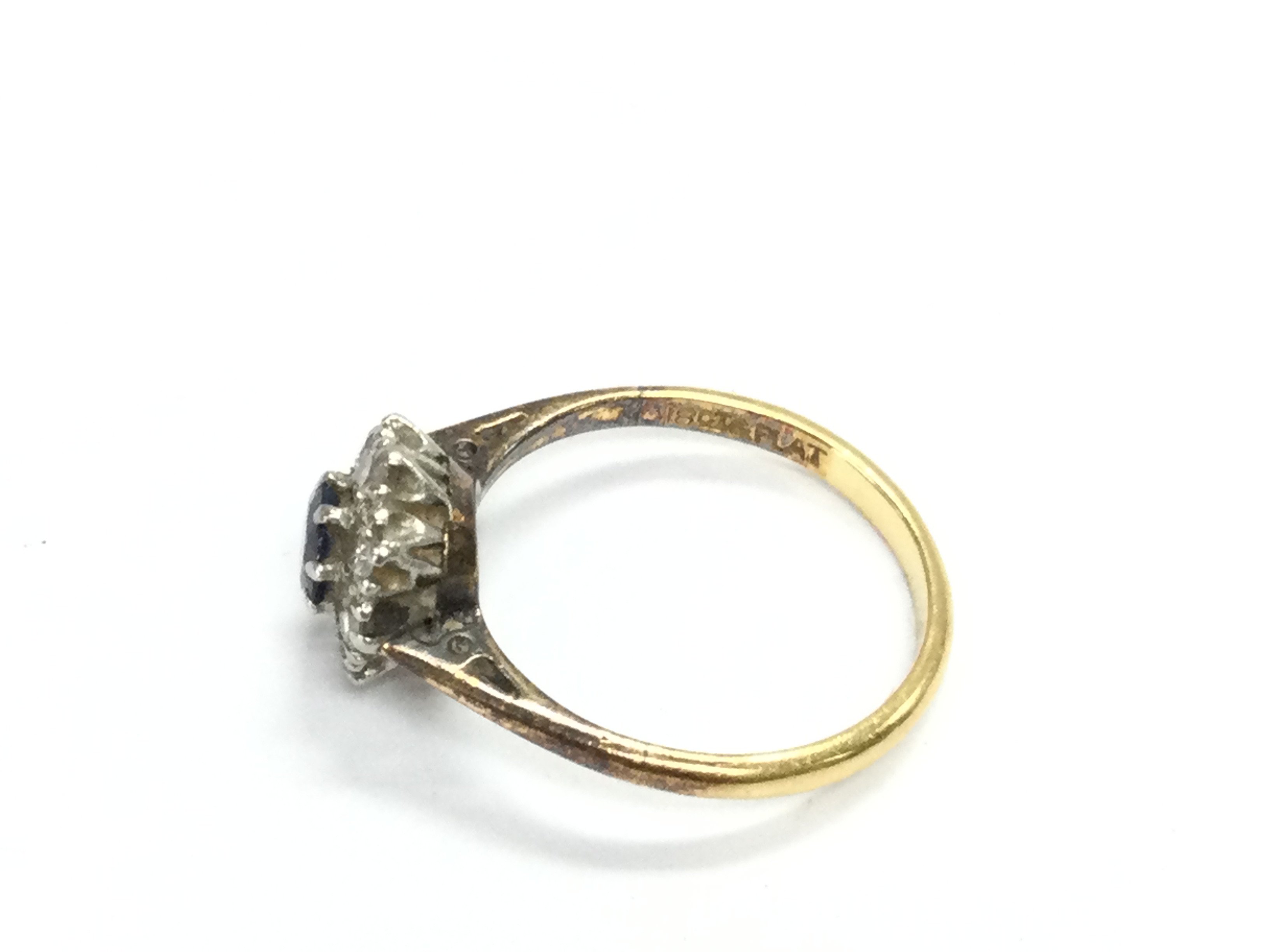 An 18ct gold and platinum ring set with central sapphire flanked by diamonds. Size M and 3.16g