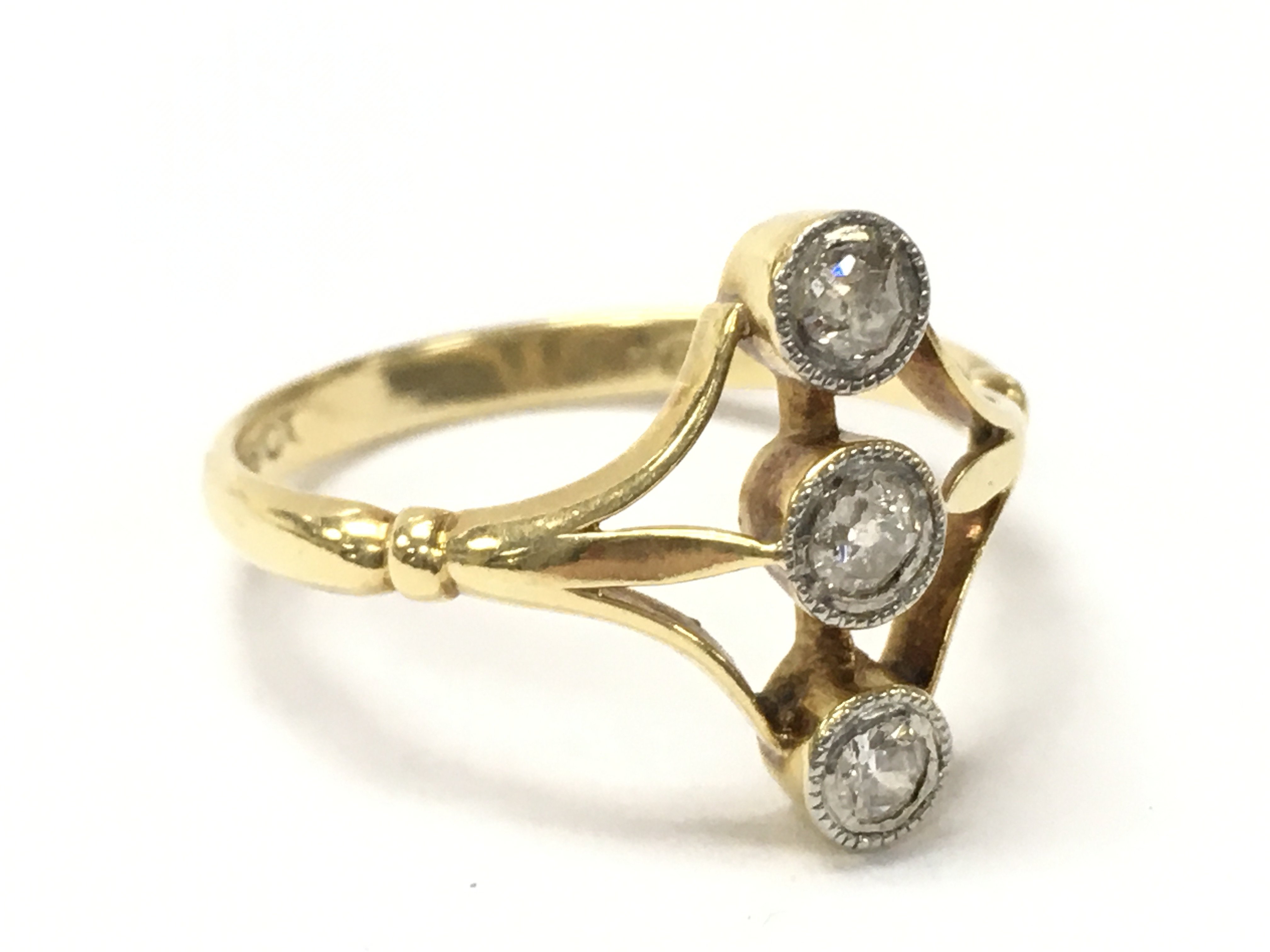 An 18ct gold and platinum 3 stone diamond ring, ring size N/M. Total weight 2.3g Postage category A