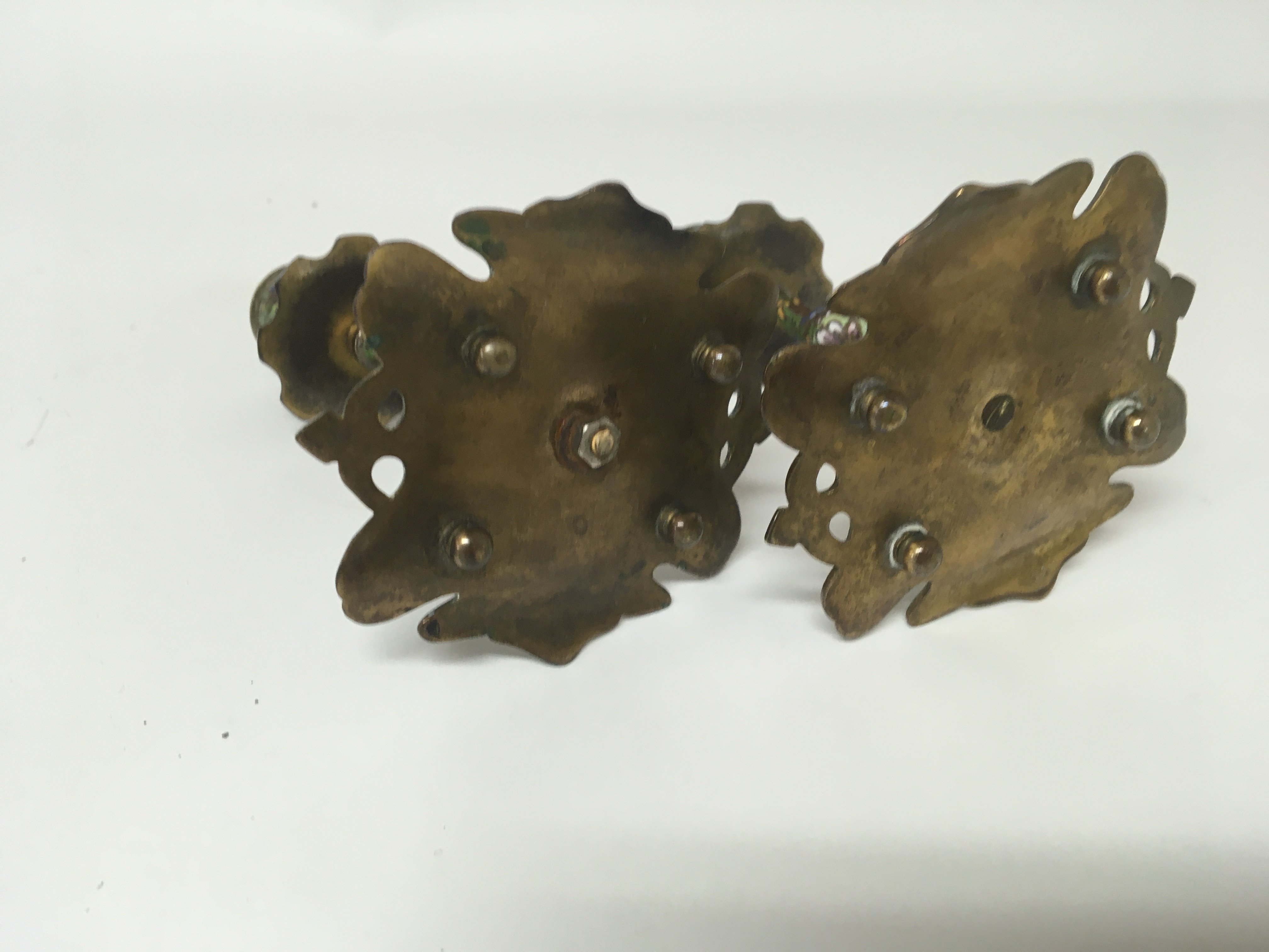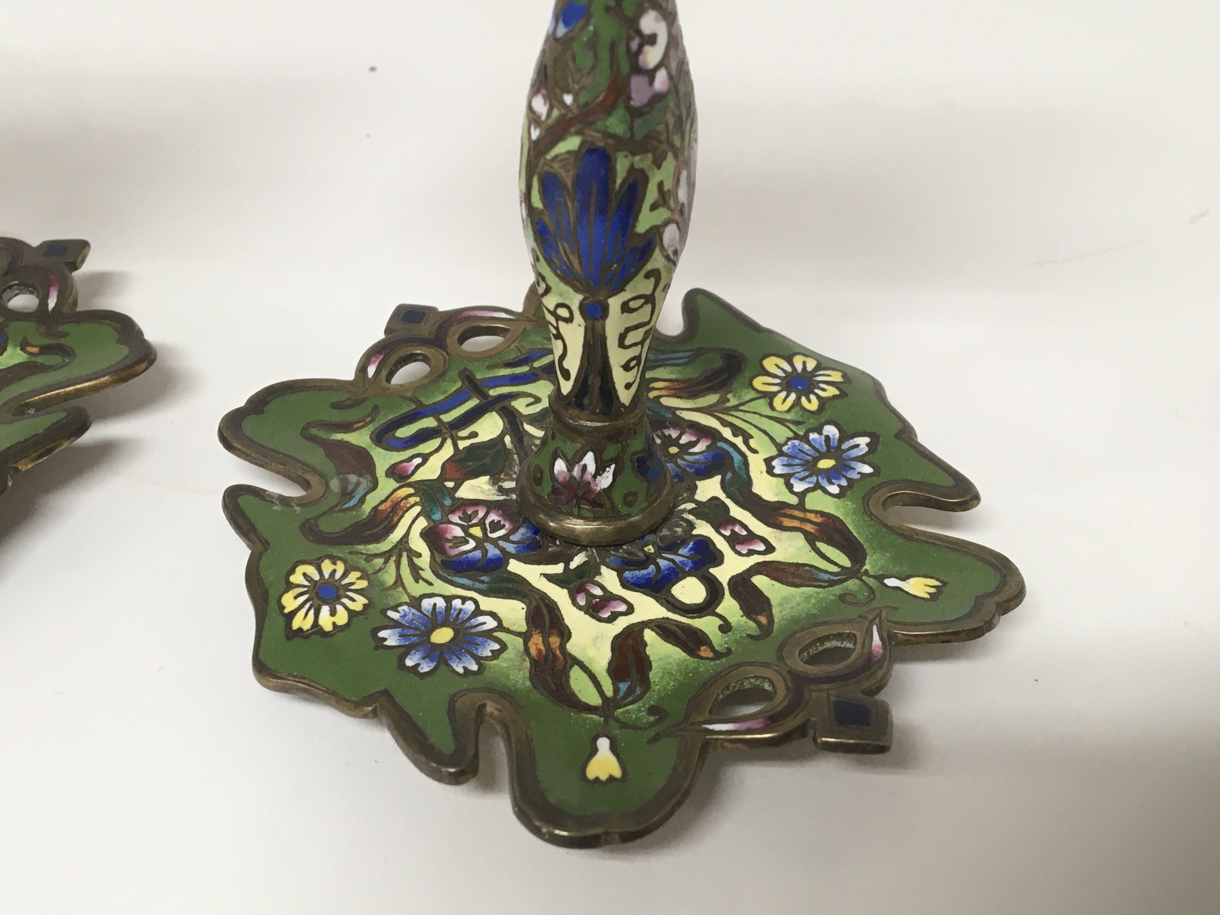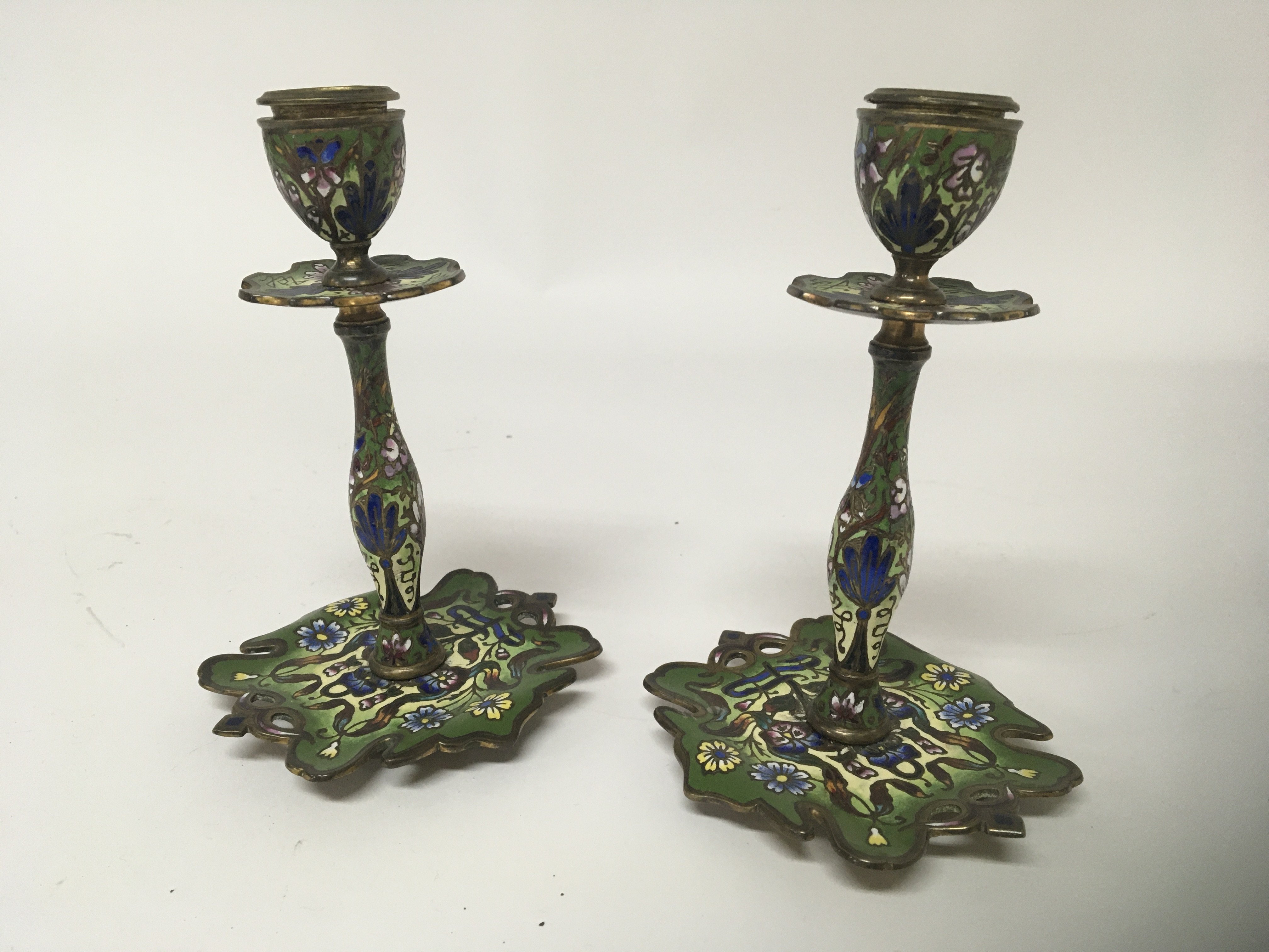 A pair of early 20th century enamel candle sticks with shaped bases. decorated with flowers and foliage. Hight 15cm