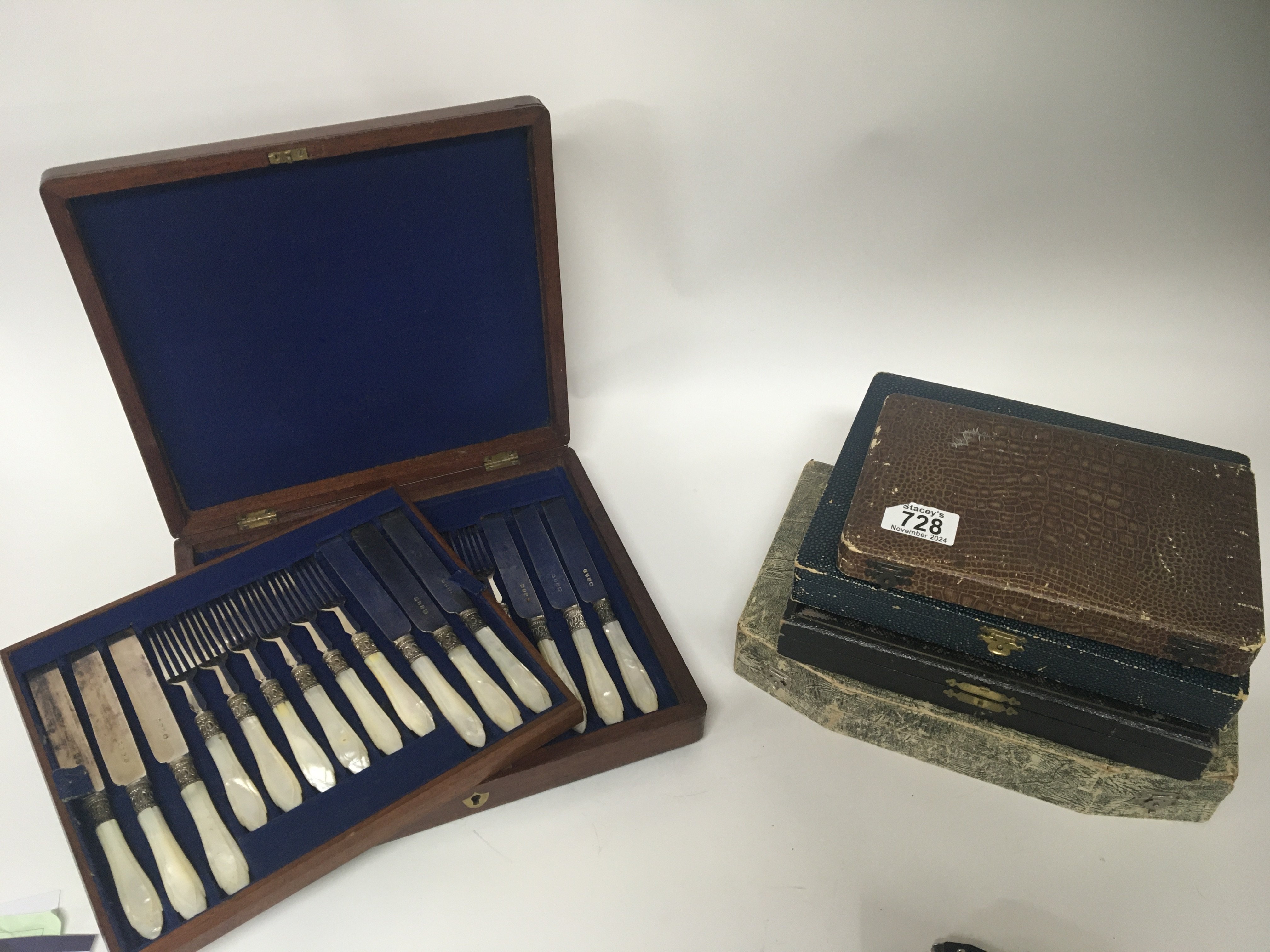 A mahogany cased set of silver plated and mother of pearl handled knifes and folks twelve place setting and four other cases of plated cutlery.