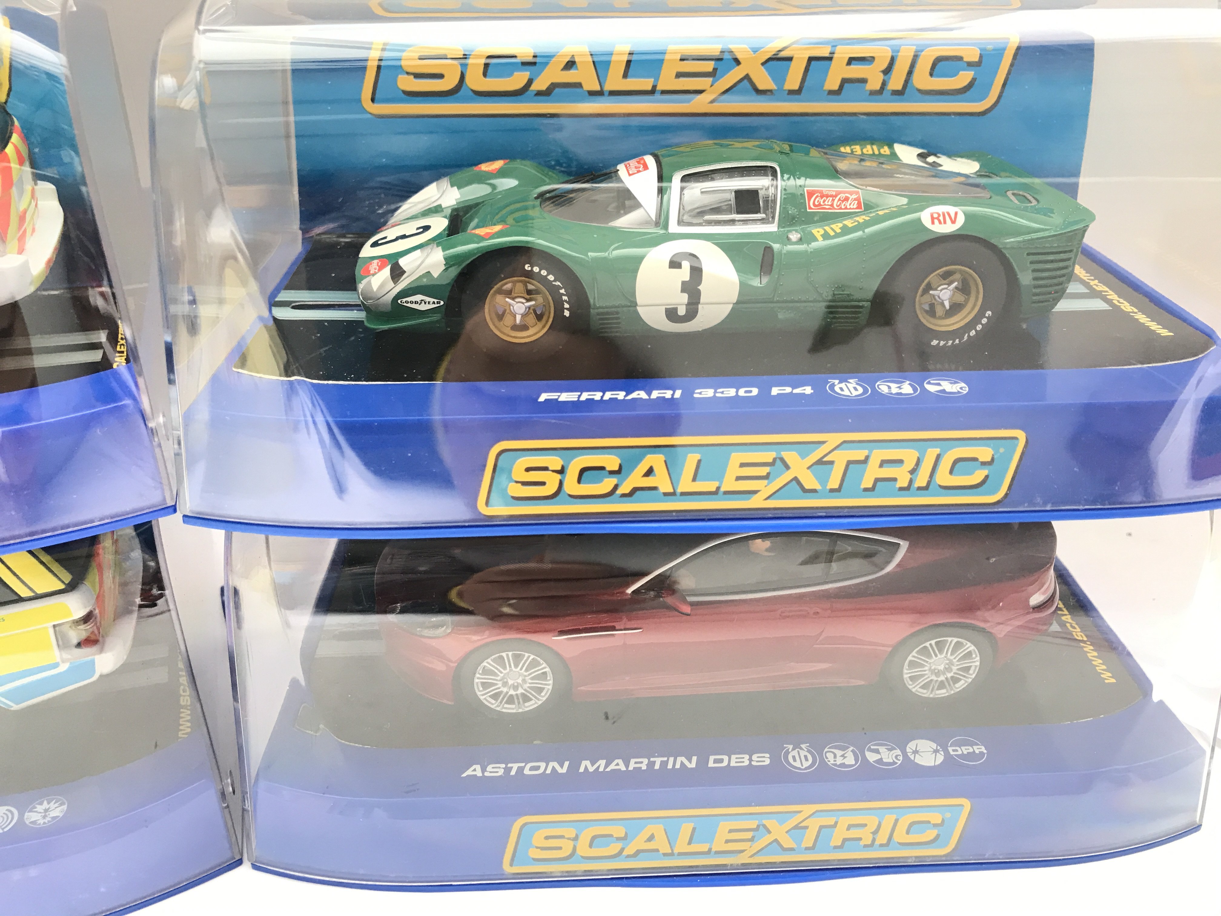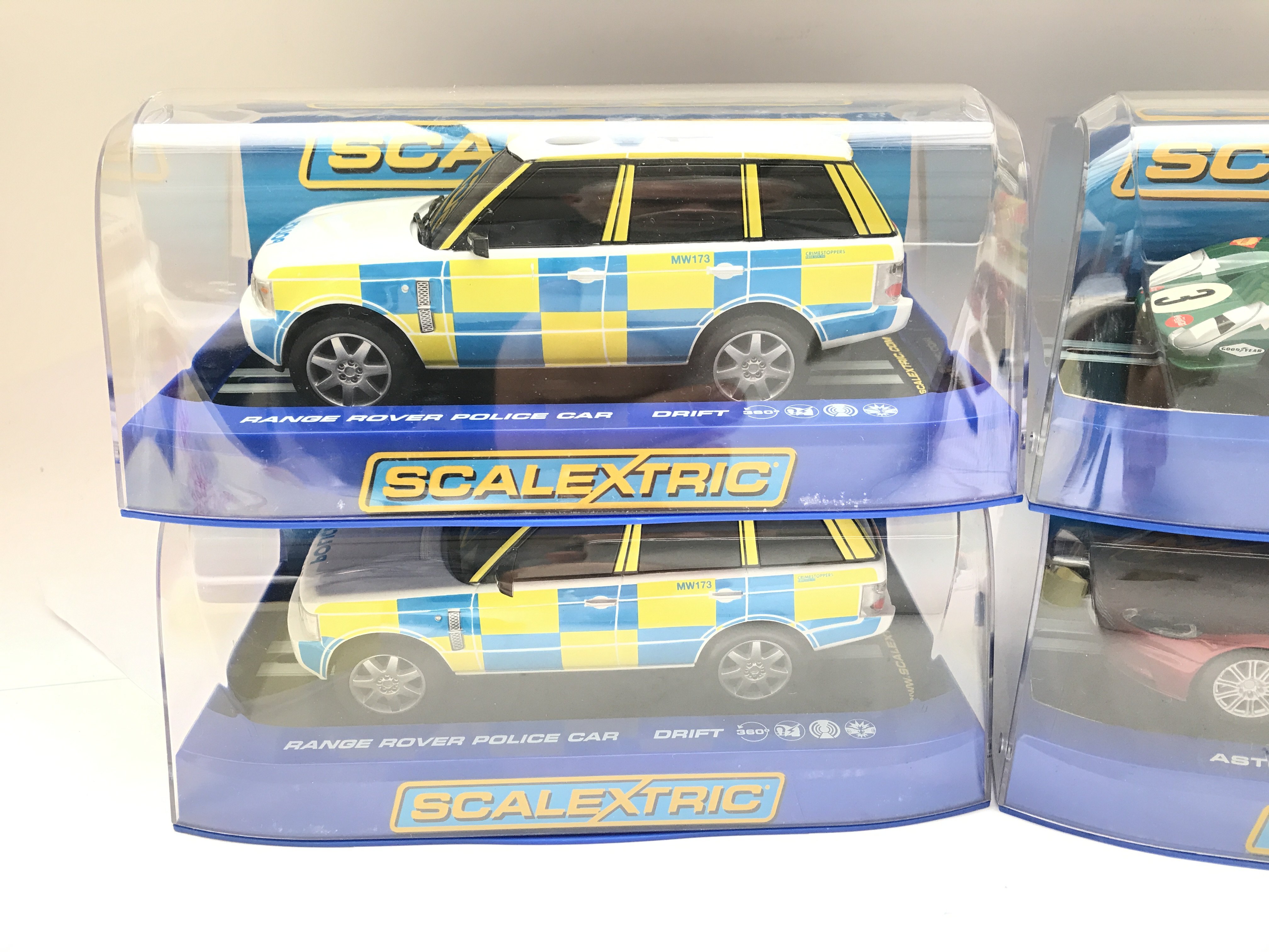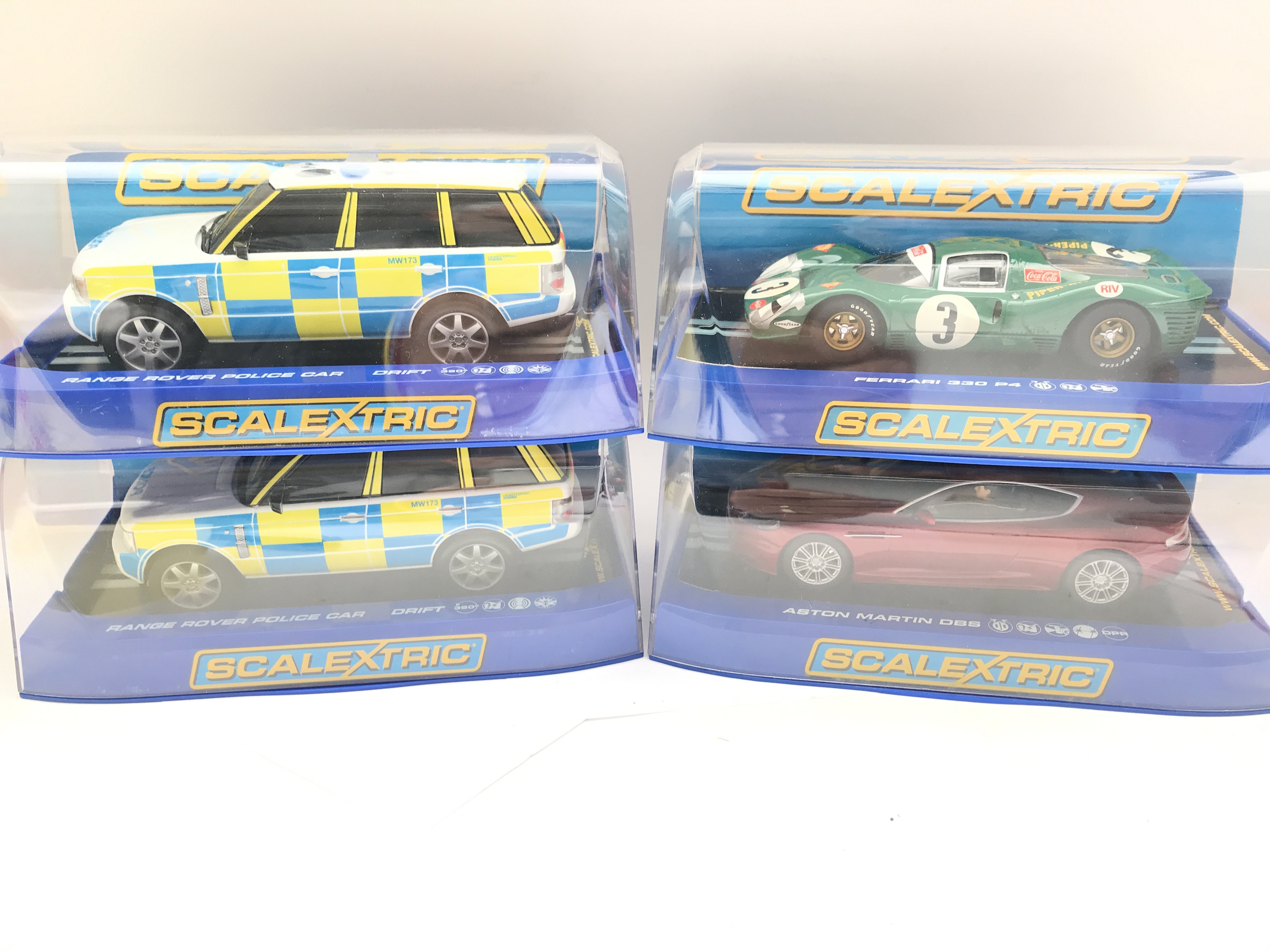 4 x Boxed Scalextric Cars 2 X Range Rover Police Cars. A Ferrari 330 P4 and a Aston Martin DB5.
