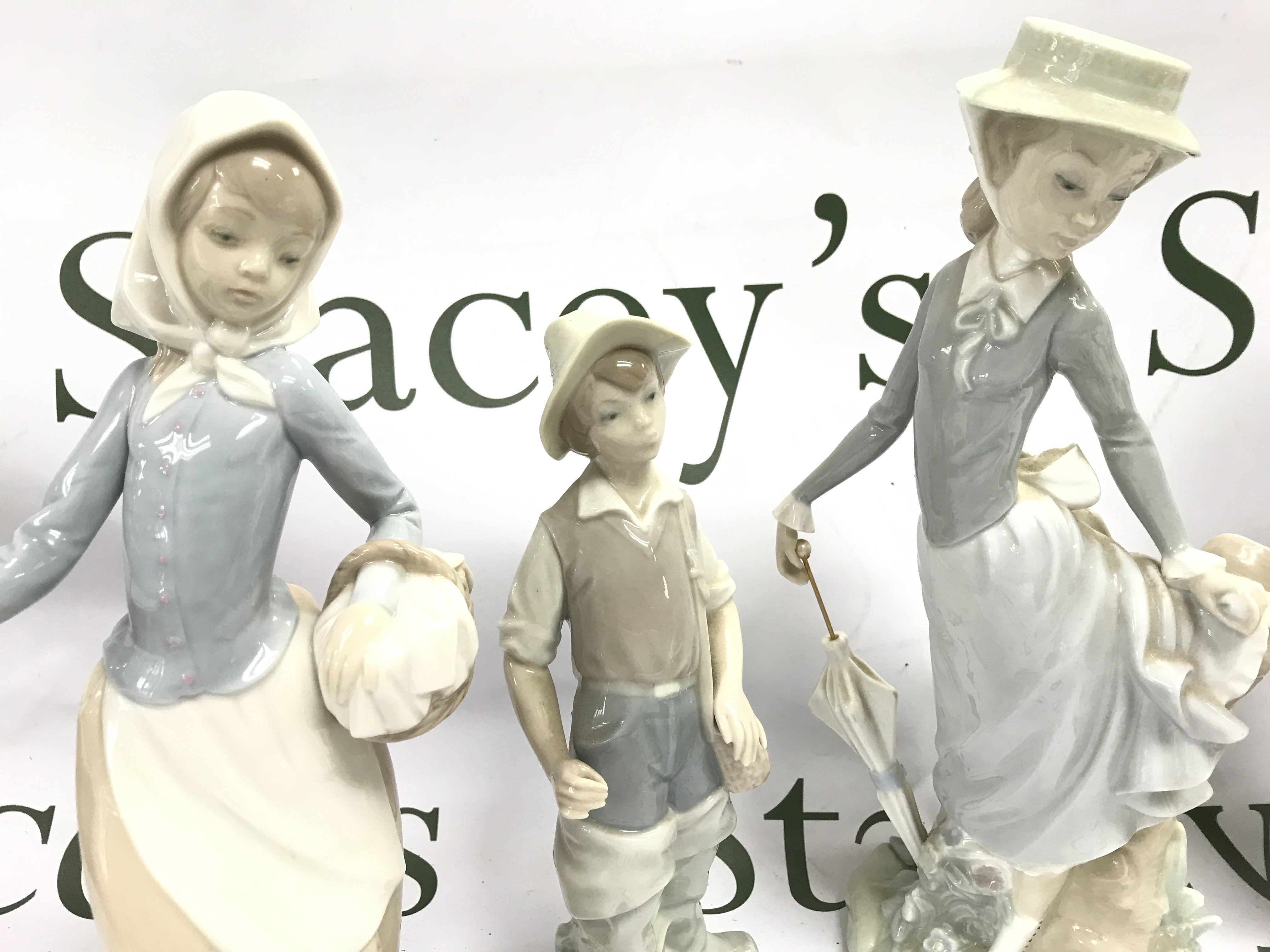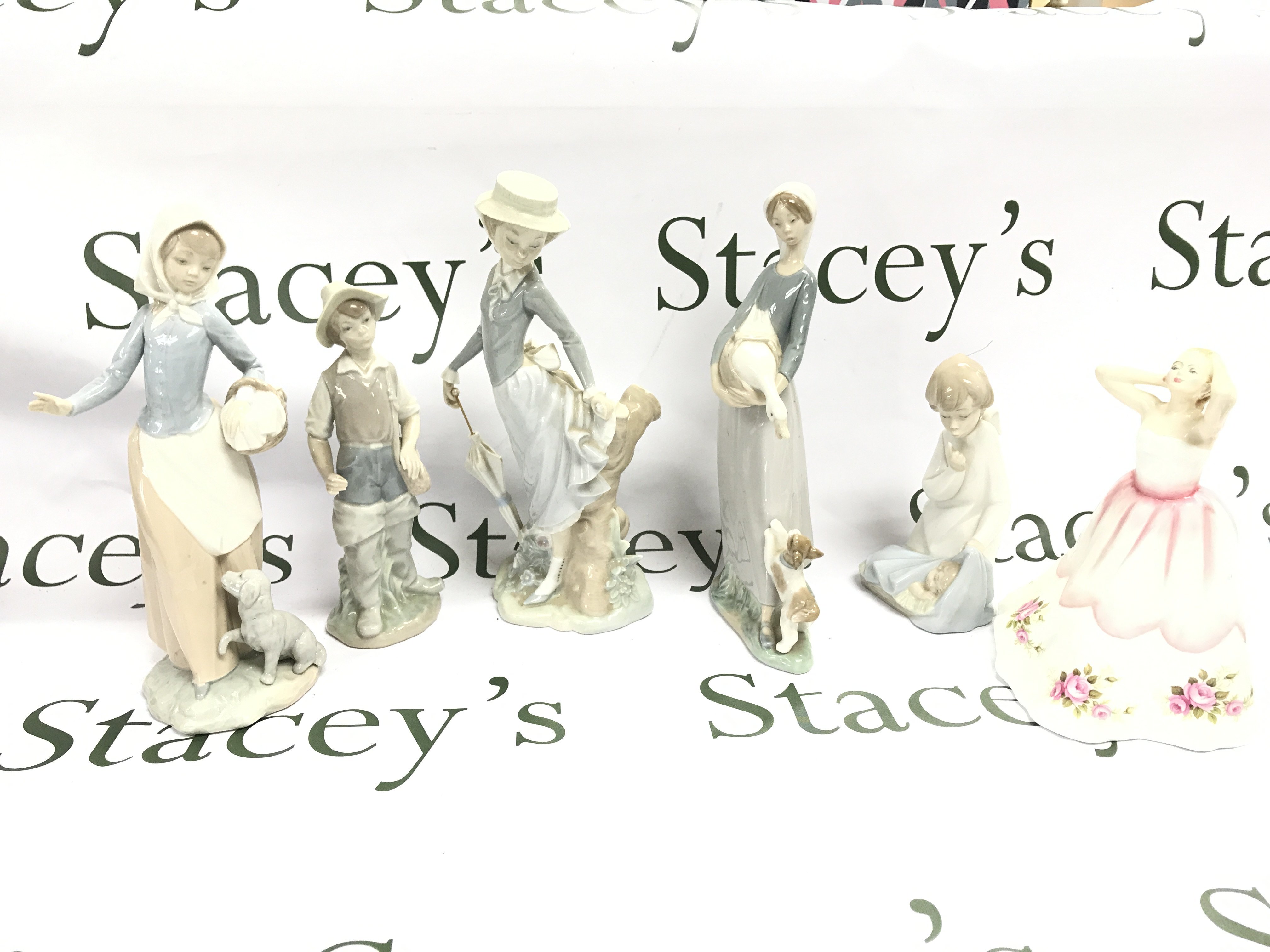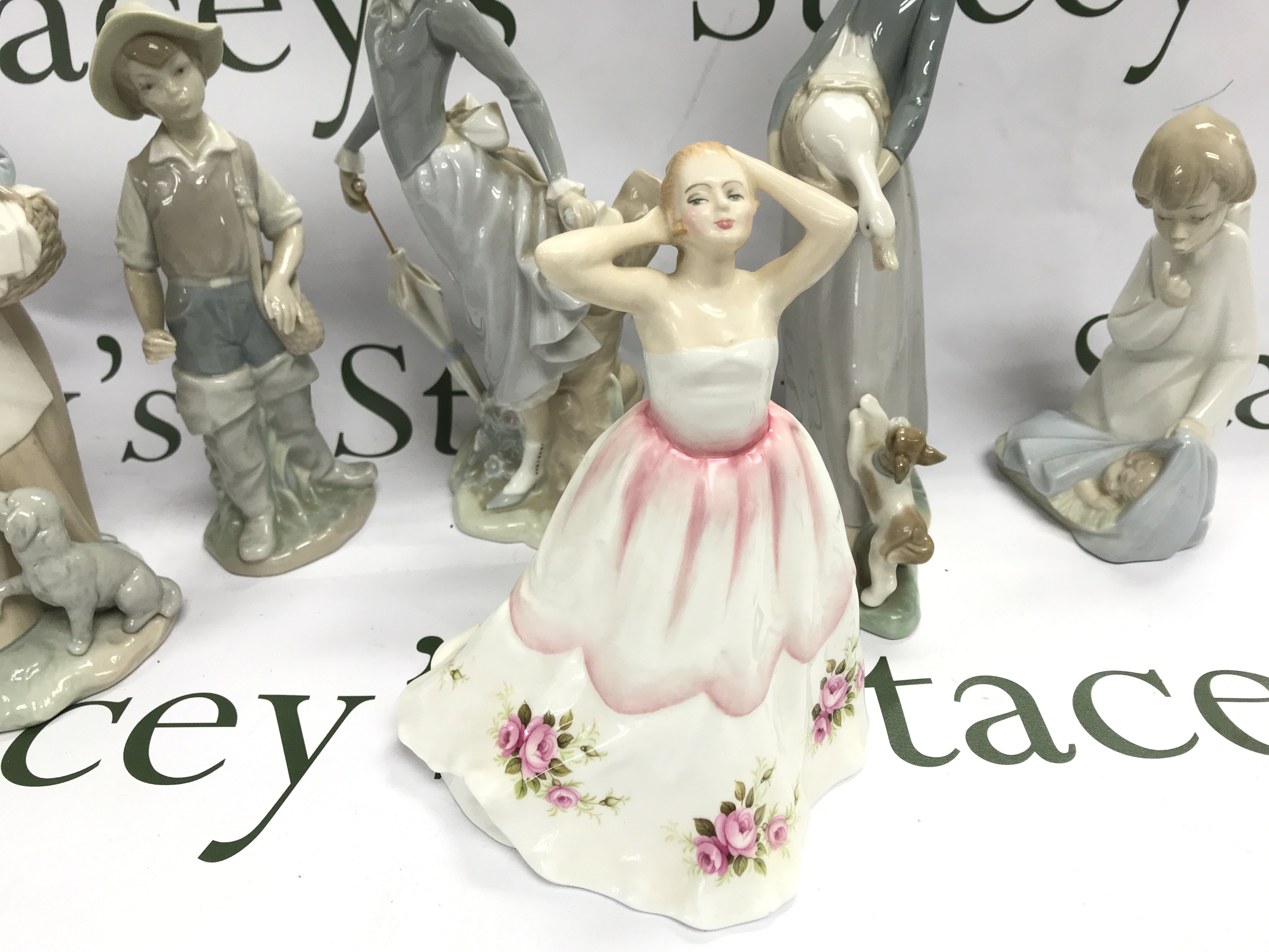 A Collection of porcelain figures including Lladro, Nao and a Royal Doulton figure, Claire HN3209. 8 to 28cm tall approximately. No obvious large damage or restoration. This lot cannot be posted
