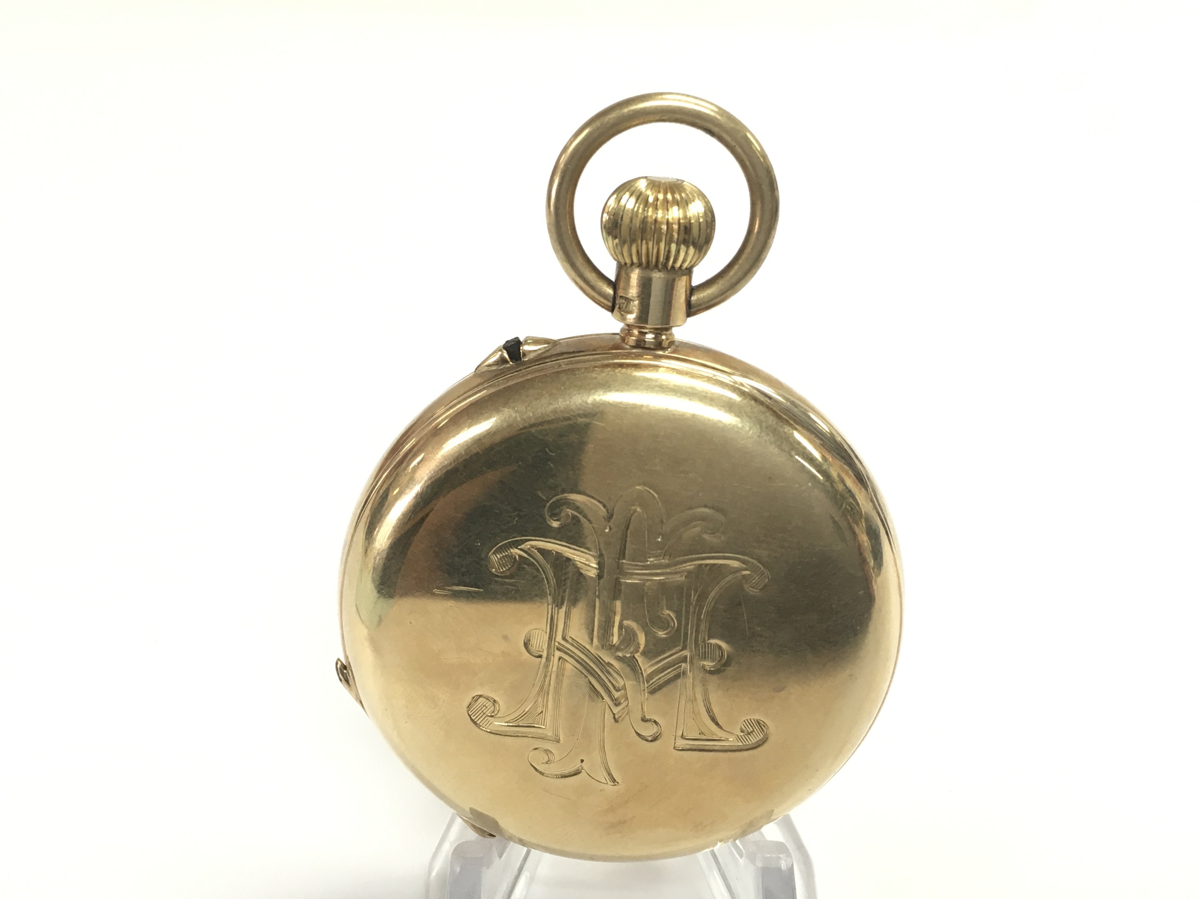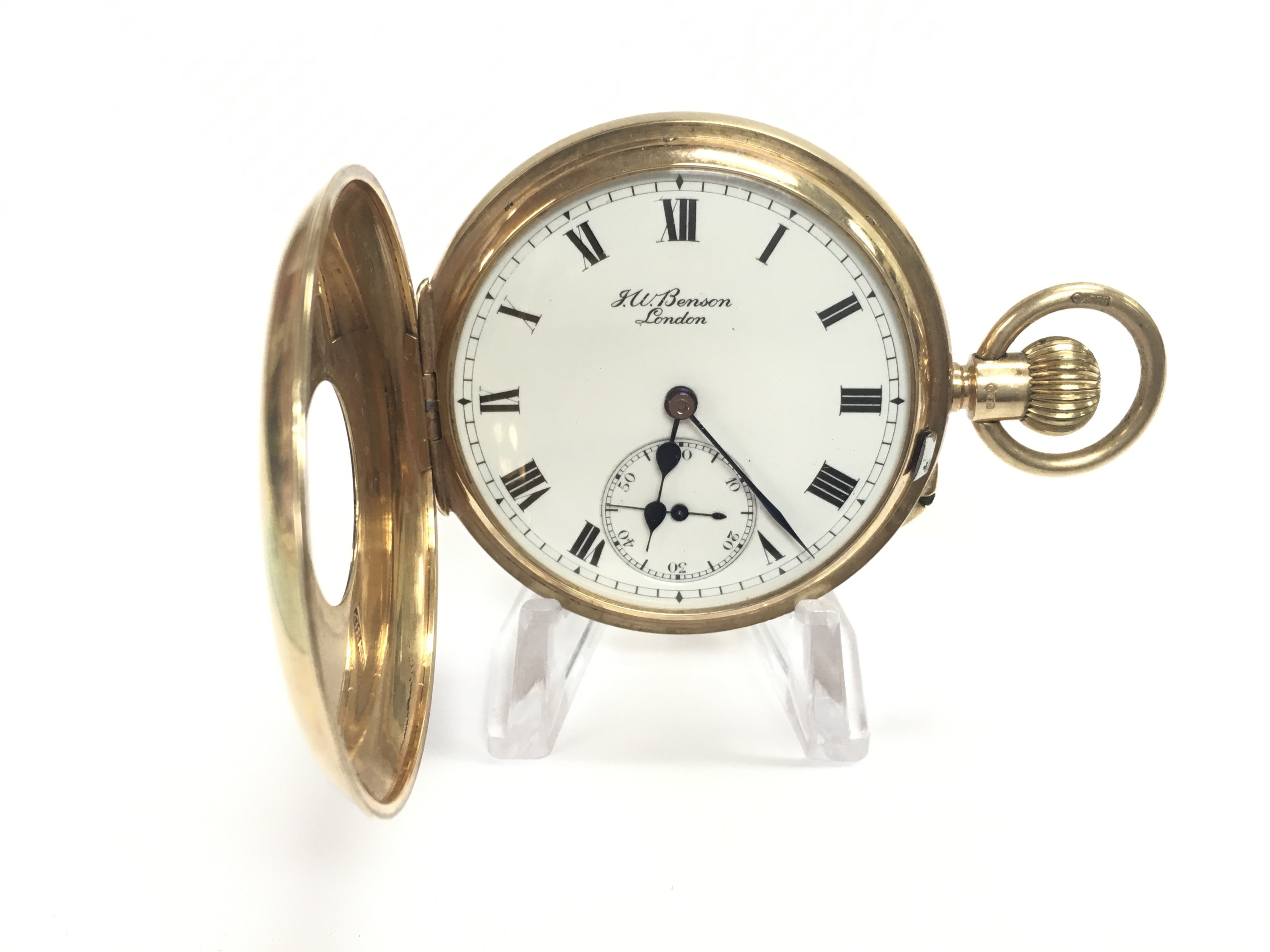 A 9ct gold half hunter pocket J W Benson. Winds and runs. Total weight 95.28gApproximately 46mm case.Postage B