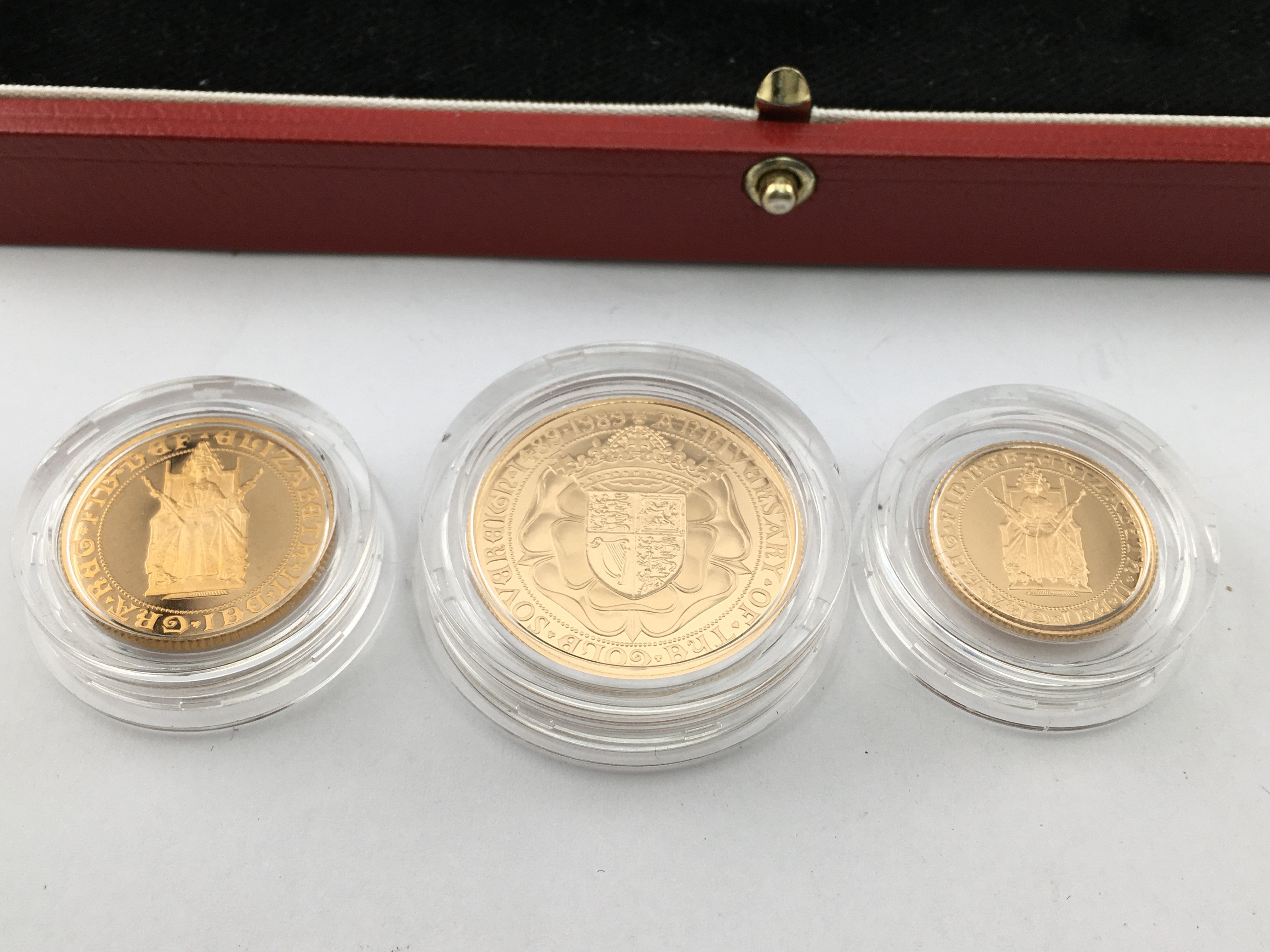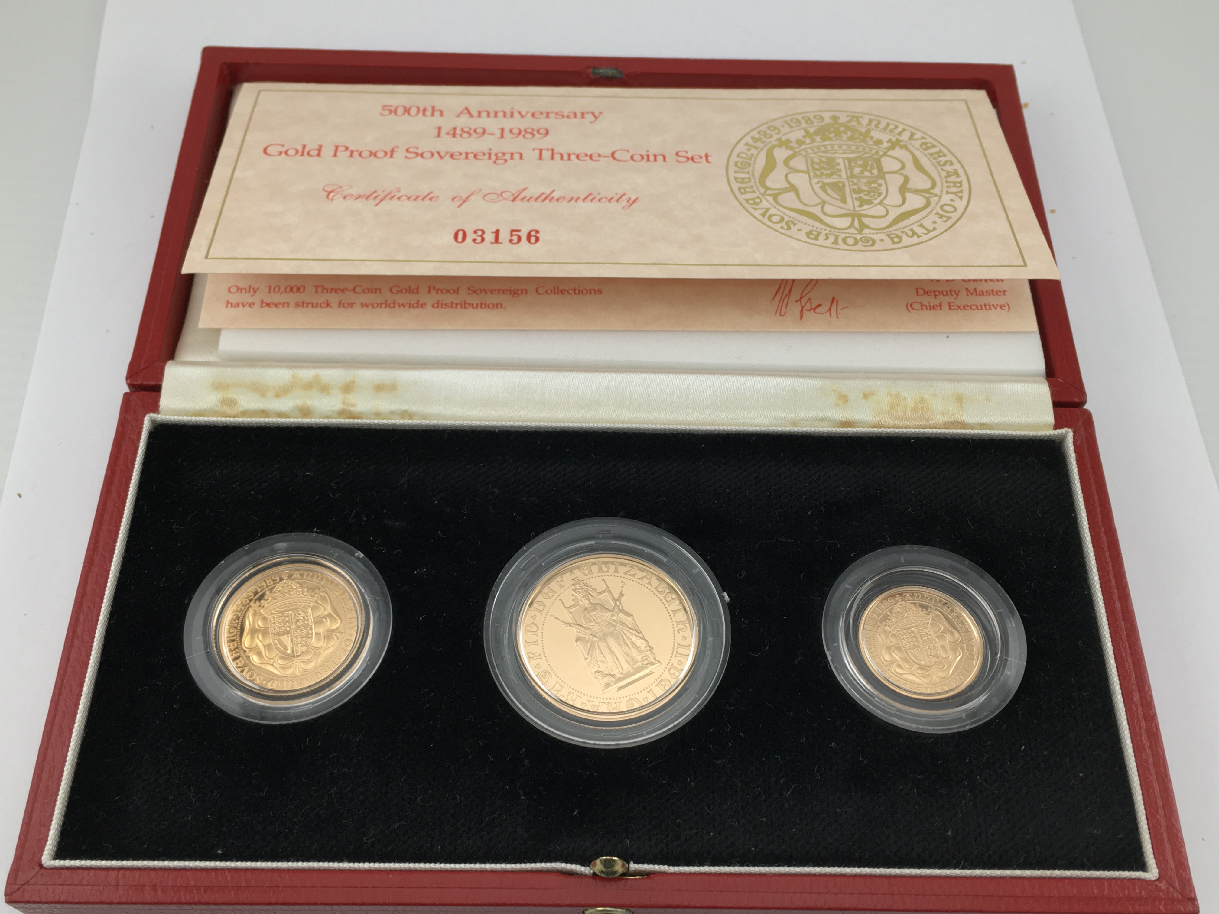 500th anniversary gold proof three coin set including a double, full and half sovereign. With COA.Postage B