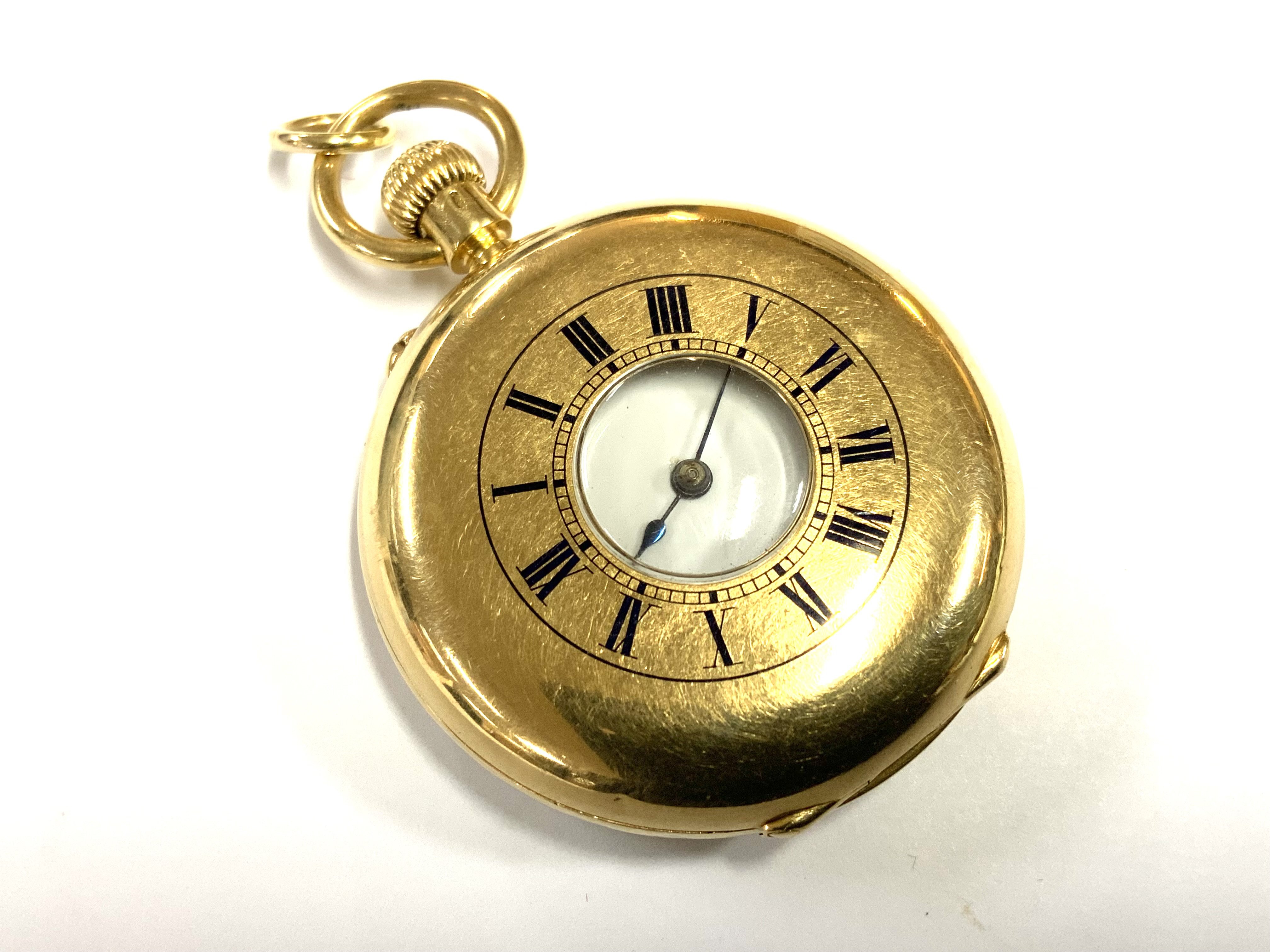 18ct gold ladies half hunter pocket watch with blue enamel chapter outer ring, total weight 48.35g (A)
