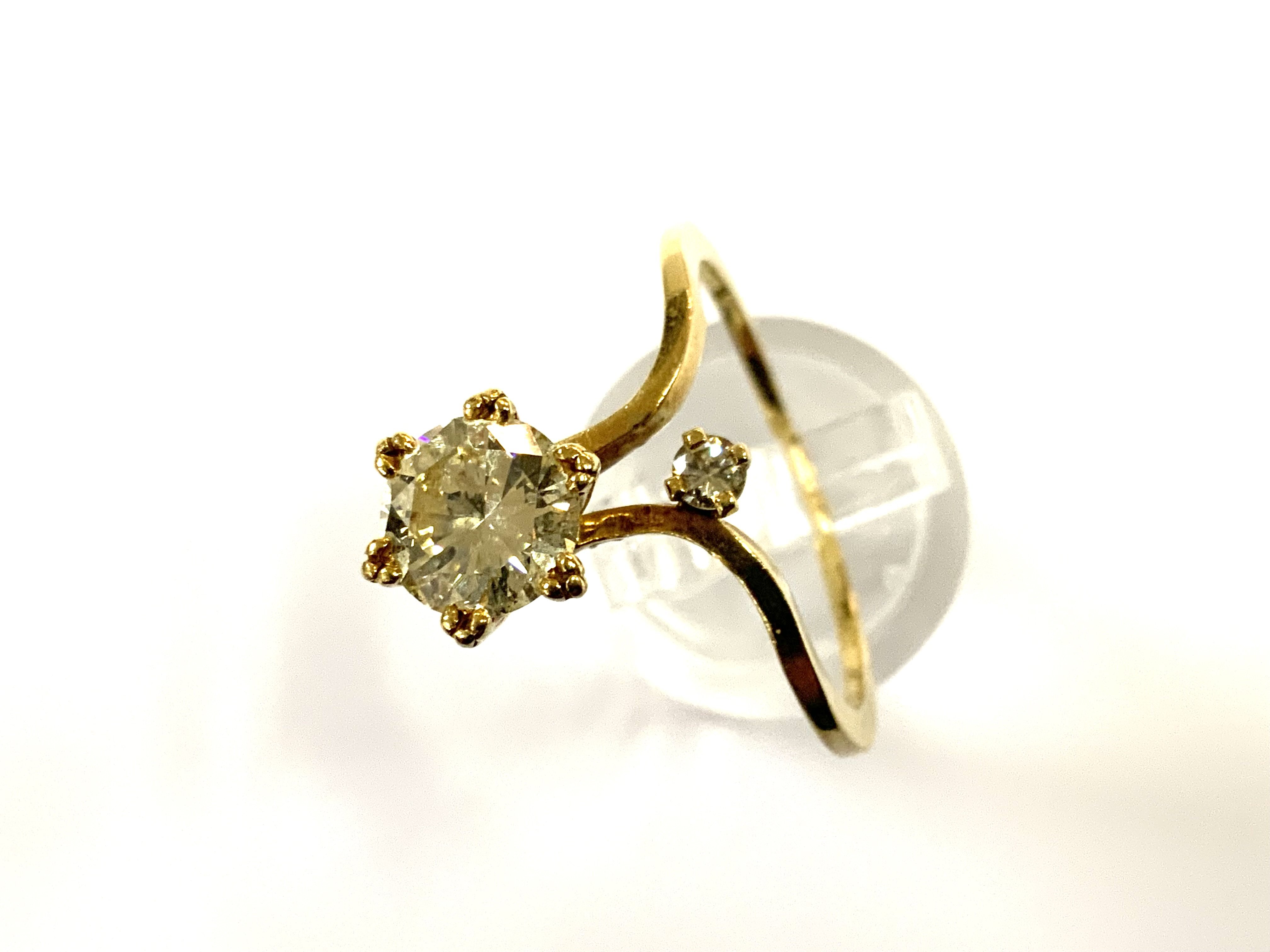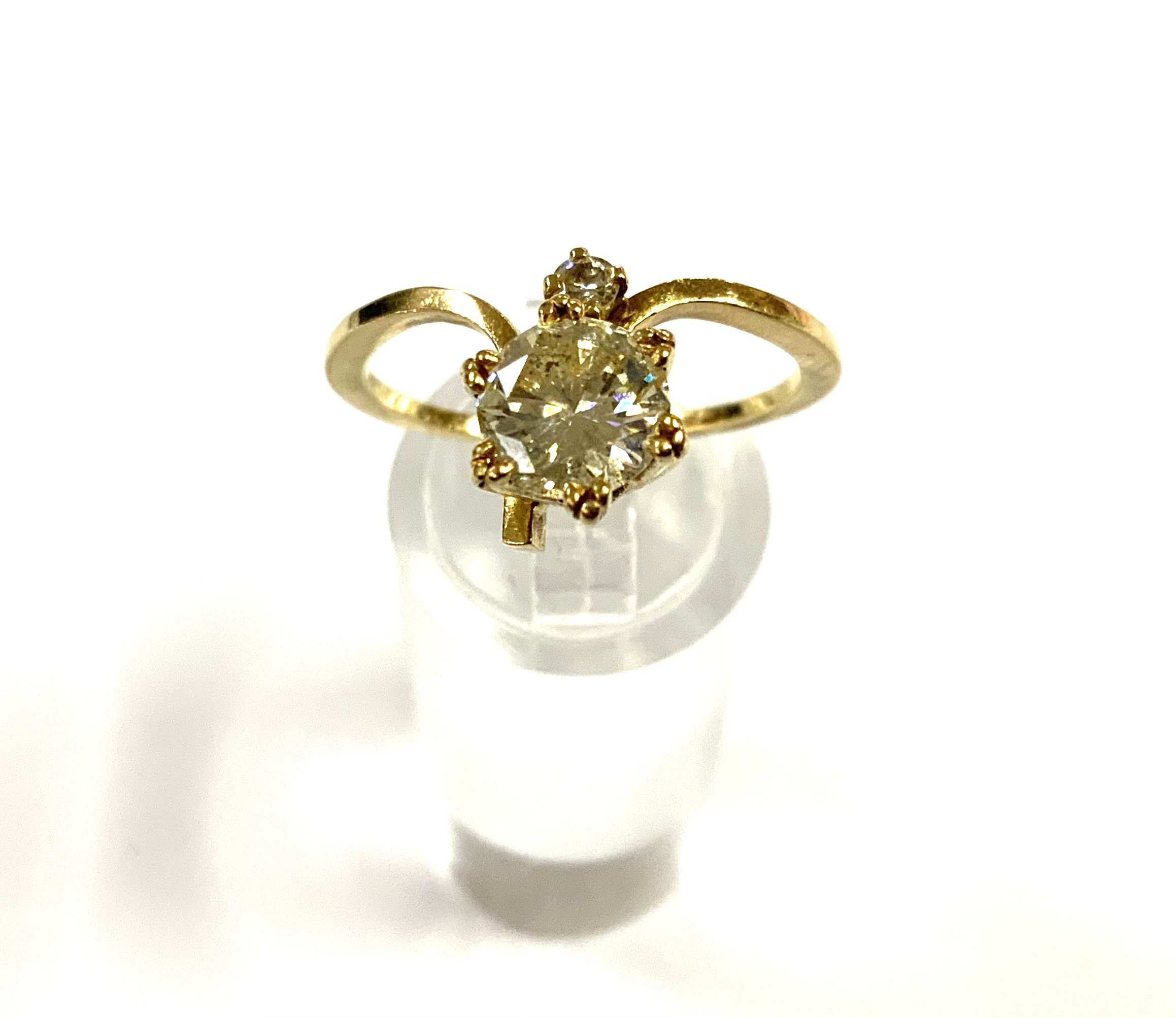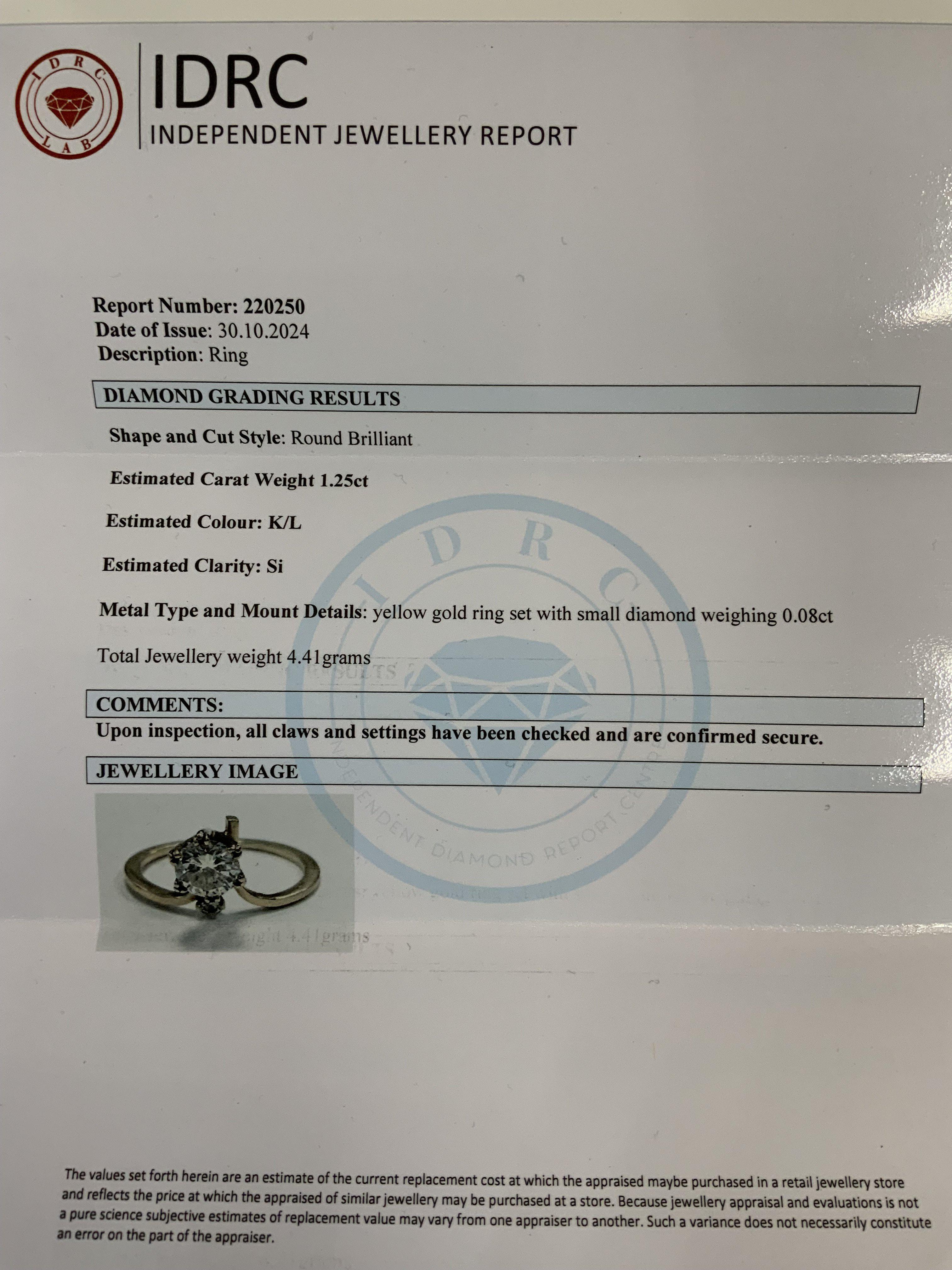 A yellow gold ring inset with a 1.25ct round brilliant cut solitaire diamond, estimated colour K/L, clarity Si, surmounted with a small 0.8ct , (A) complete with Independent jewellery report. (A)