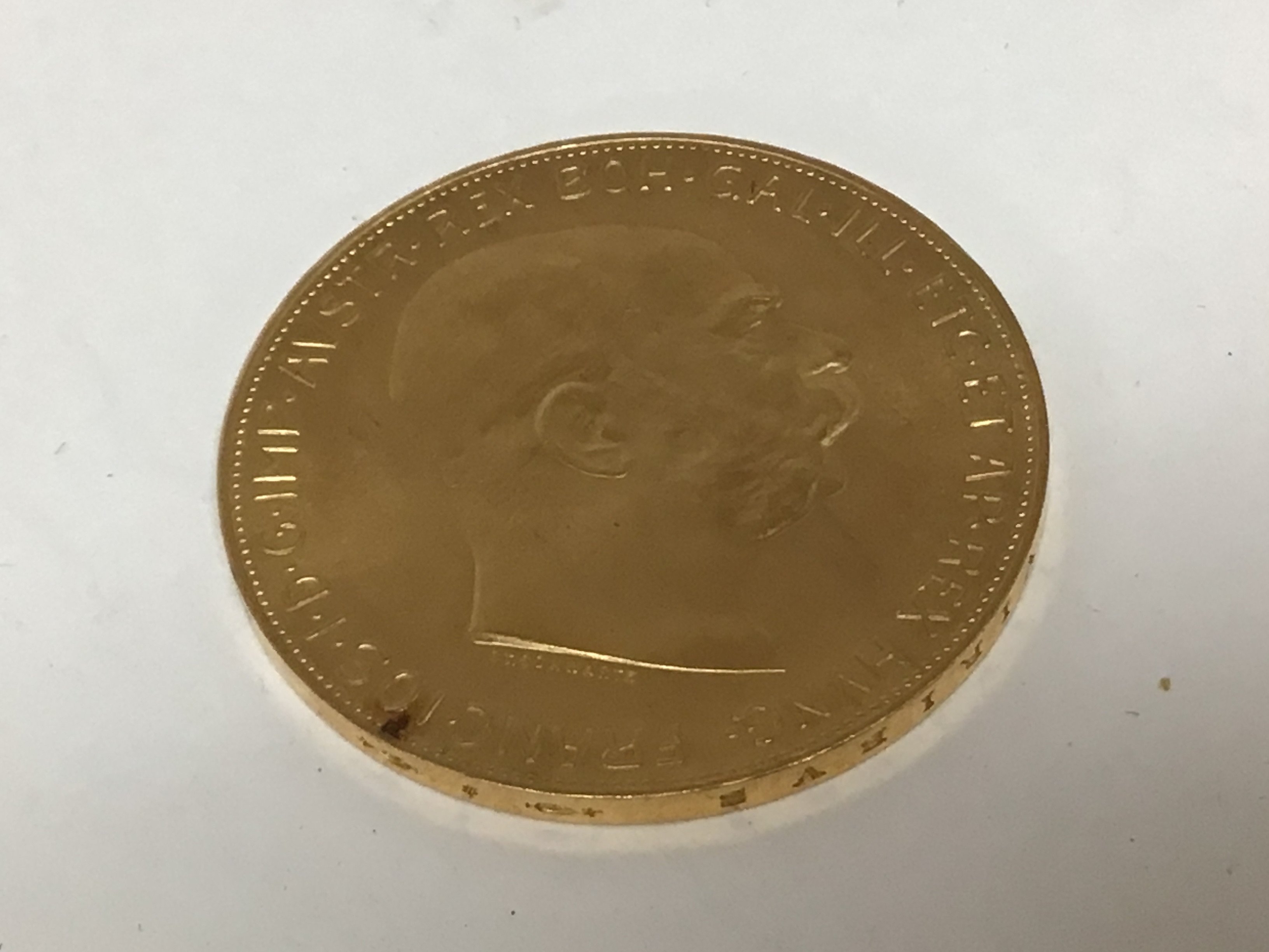 A 1915 gold Austrian 100 Corona coin with the side profile of Francis Joseph I.weight 33.9g