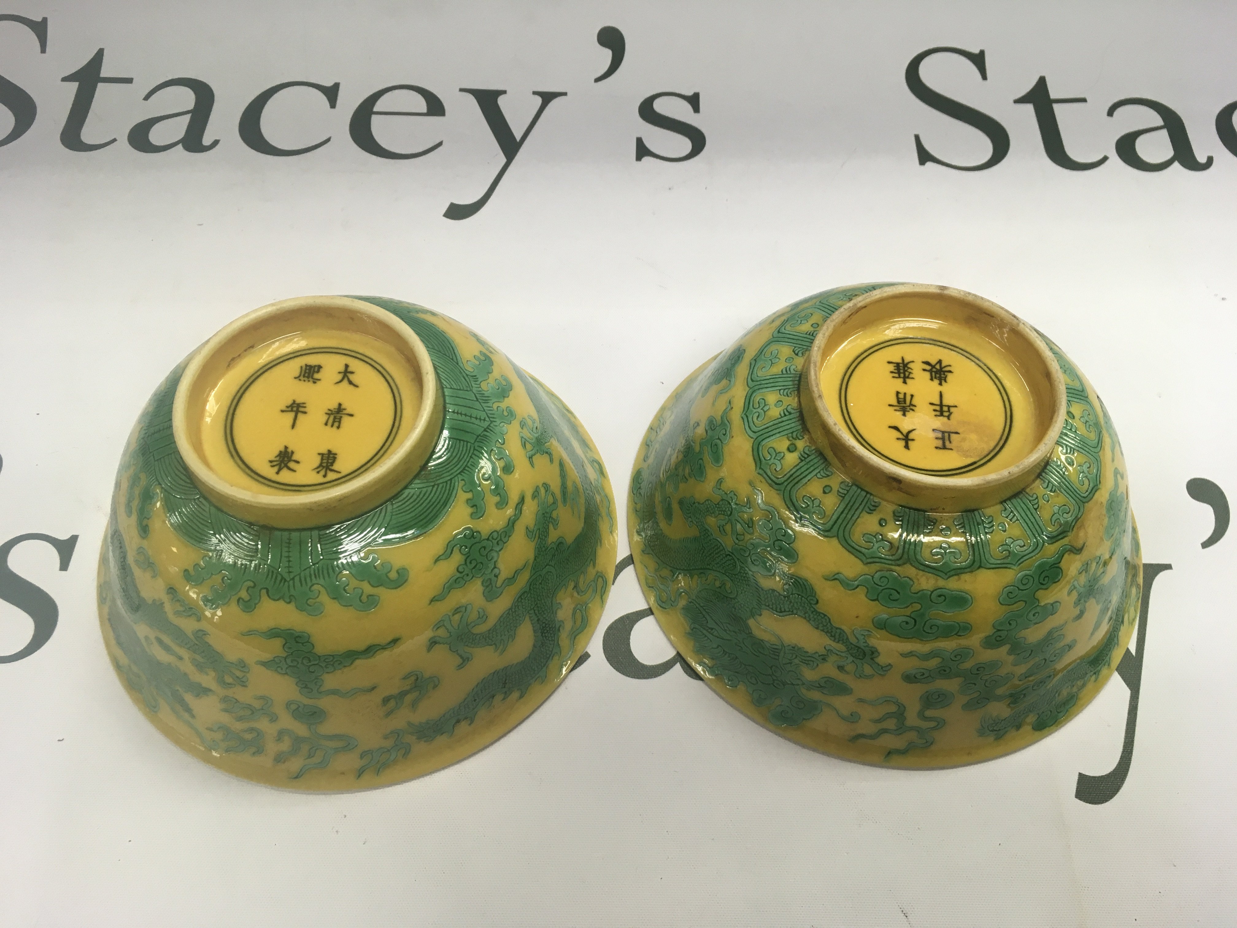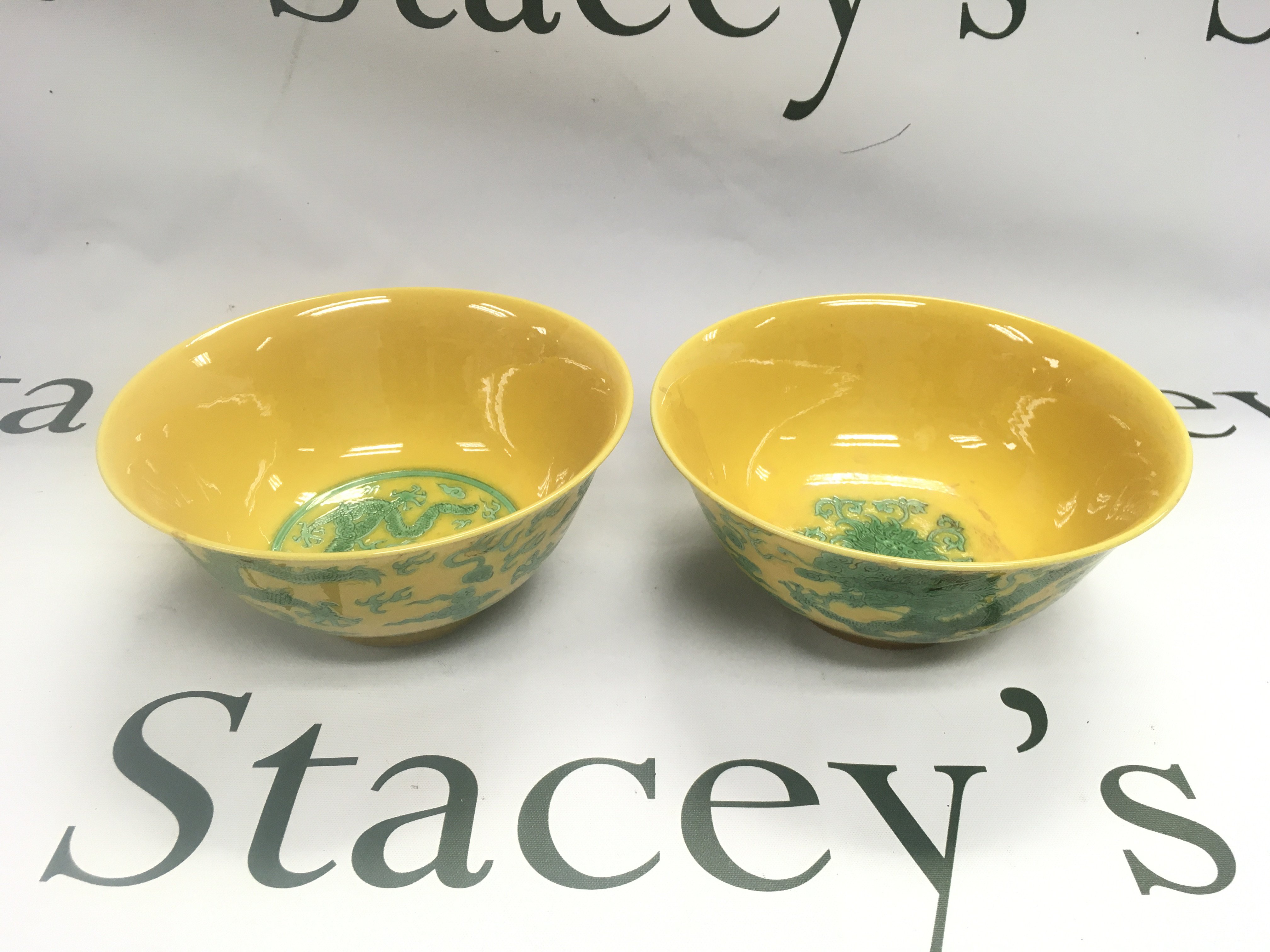 Two yellow glazed Oriental bowls decorated with dragons and six character marks to base, approx diameter 15cm. Shipping category D.