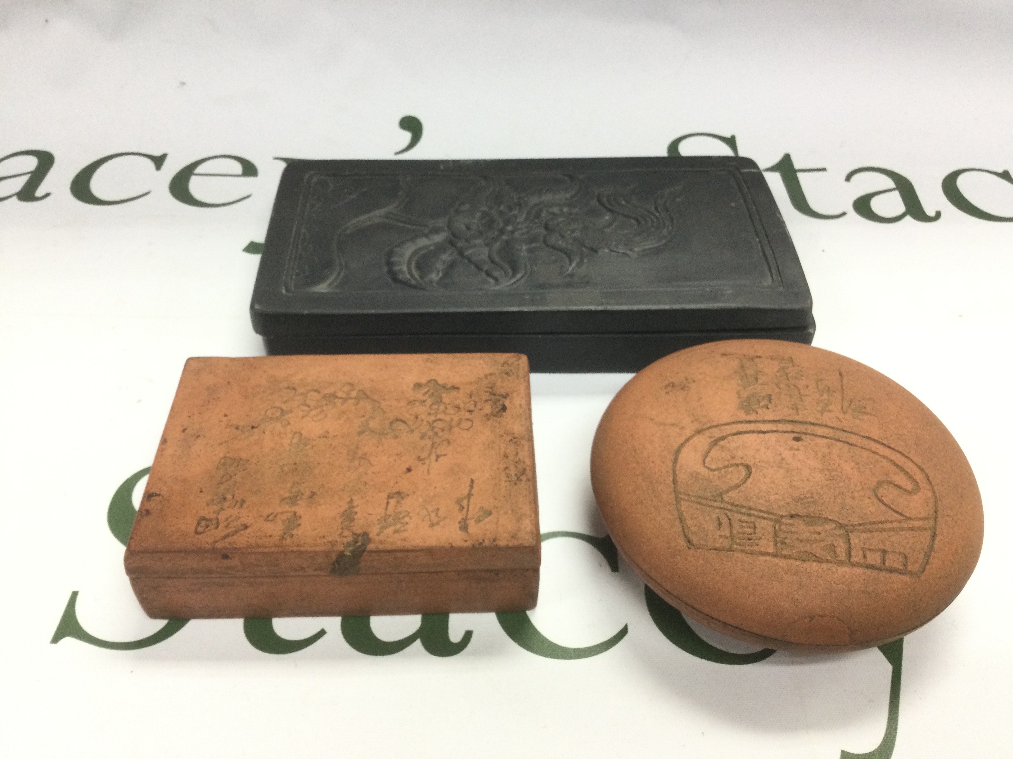 Three Oriental boxes comprising two terracotta examples and other. Shipping category D.