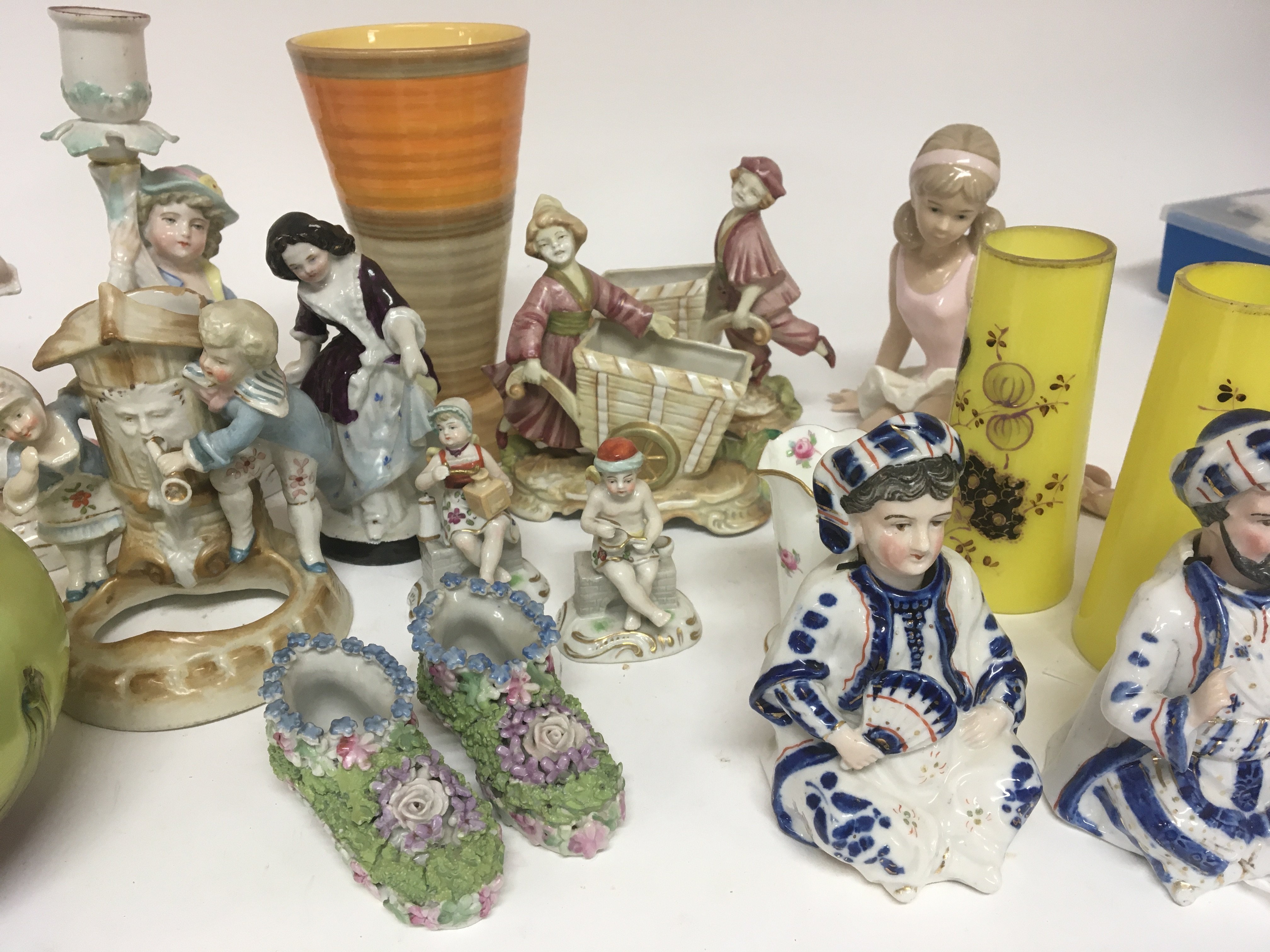A collection of late 19th and early 20th century ceramics and glass including two Victorian nodding head seated figures art glass and a Shelley vase. NO RESERVE