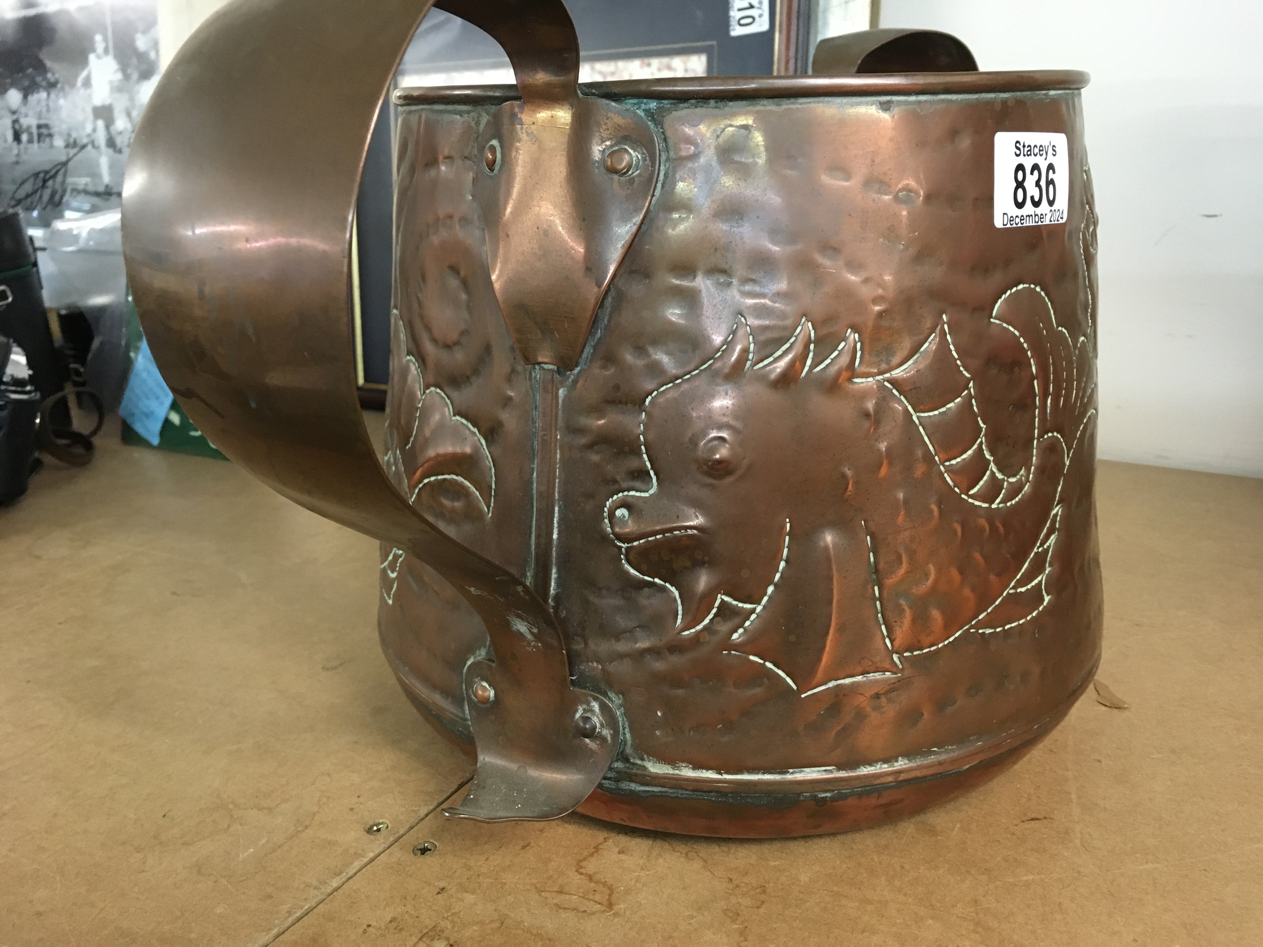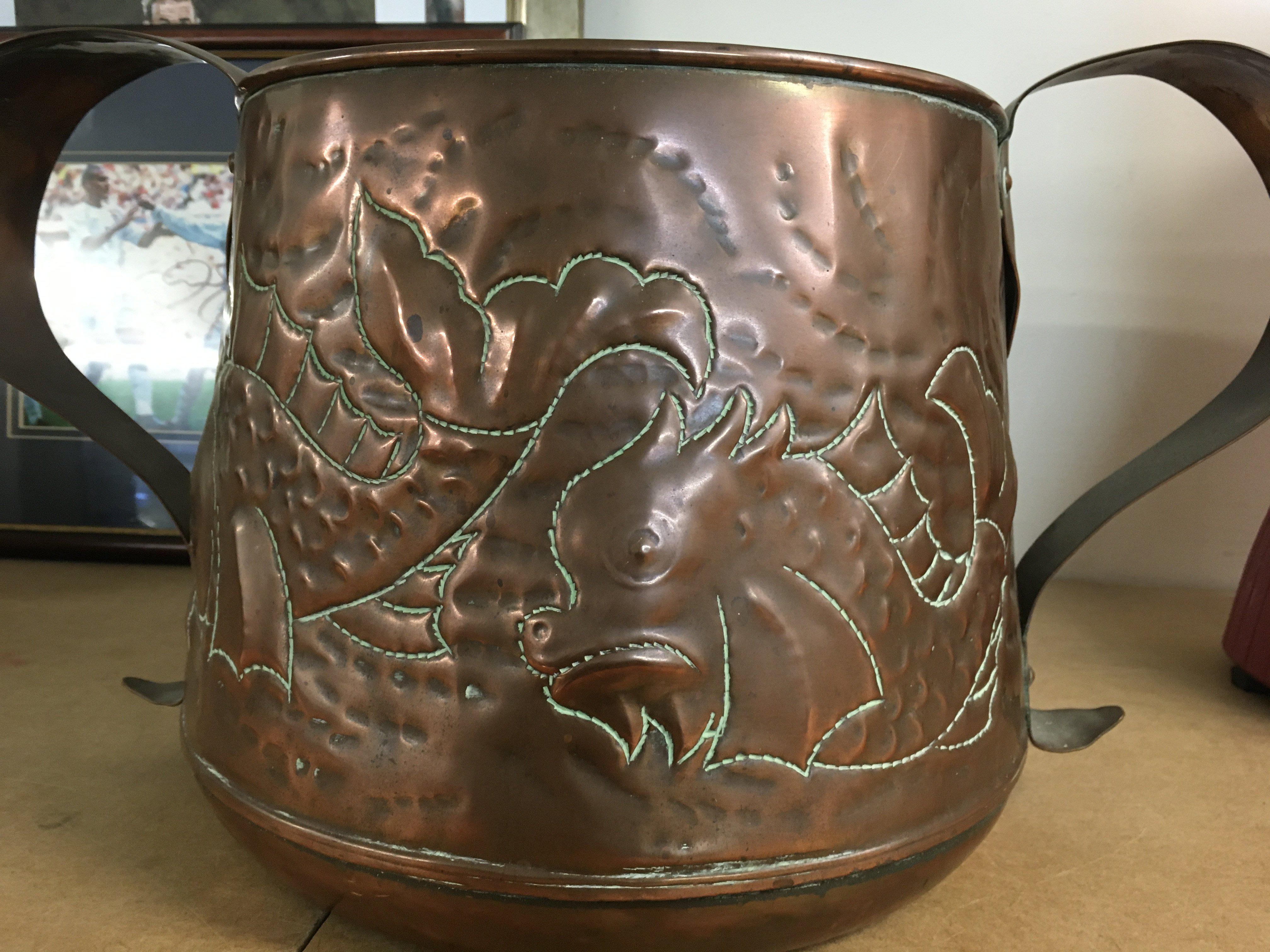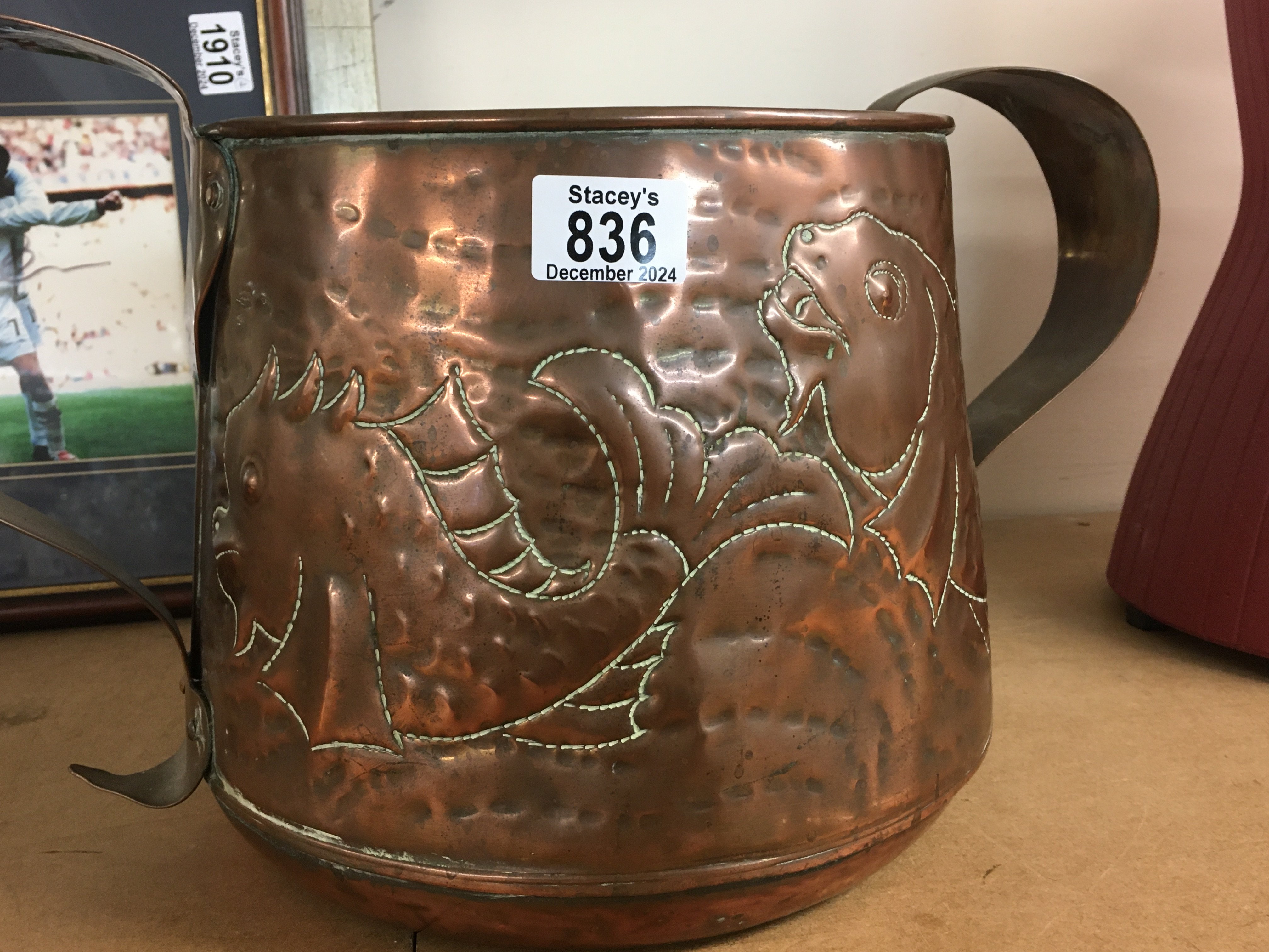 A Newlyn style copper jardiniere with twin arts and crafts handles decorated with fish . 23 cm height .
