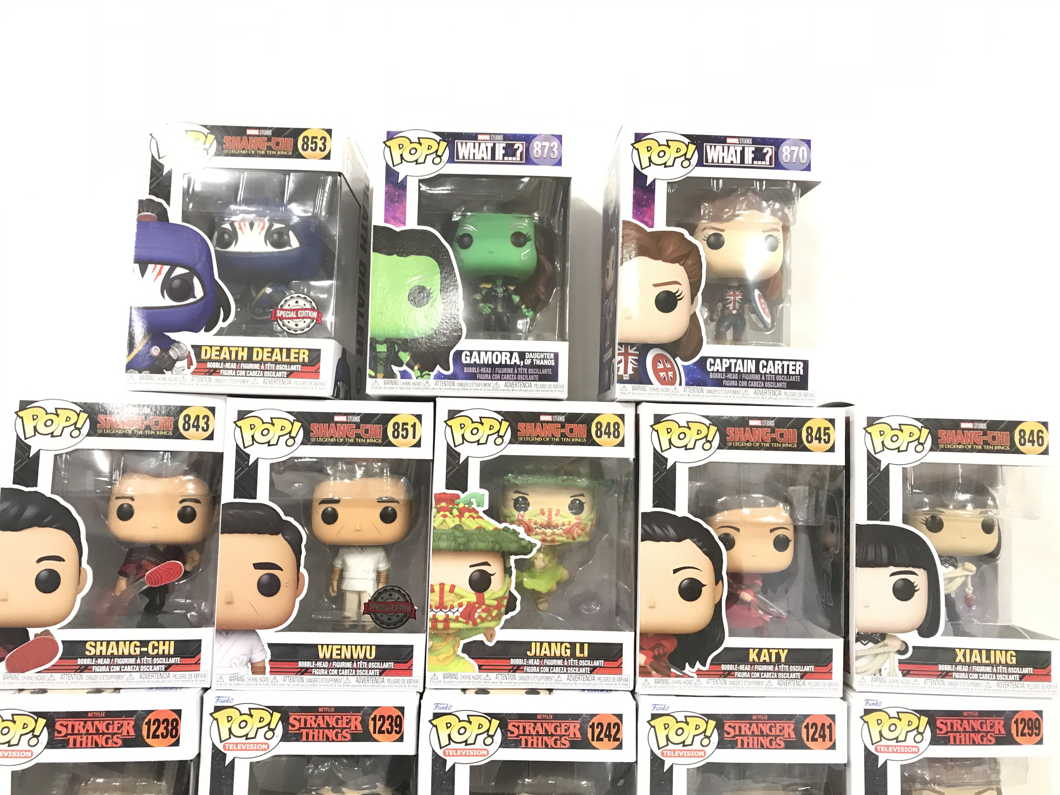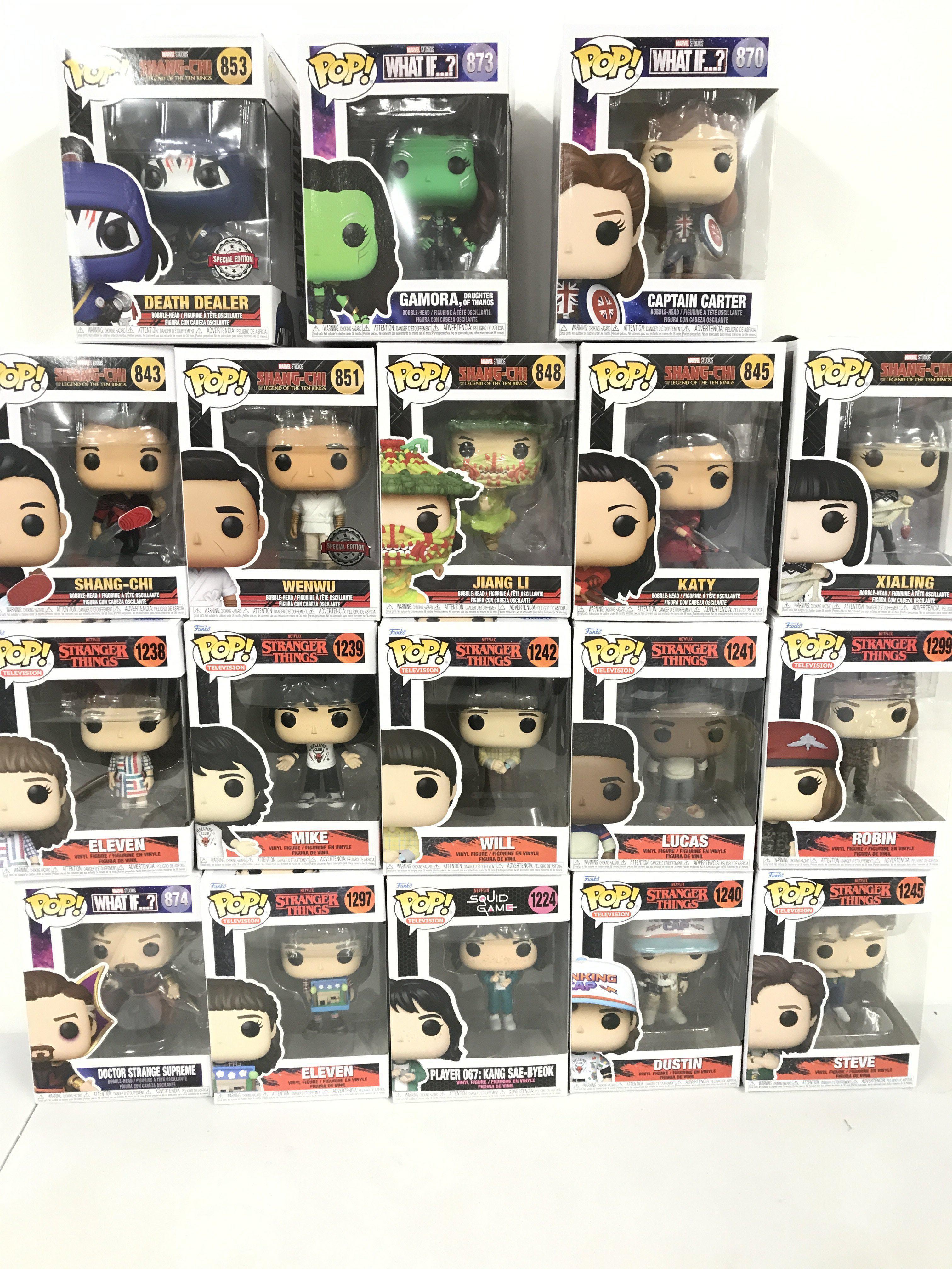A Collection of Boxed Funko Pop Figures Including Marvel. Stranger Things and Squid Games.