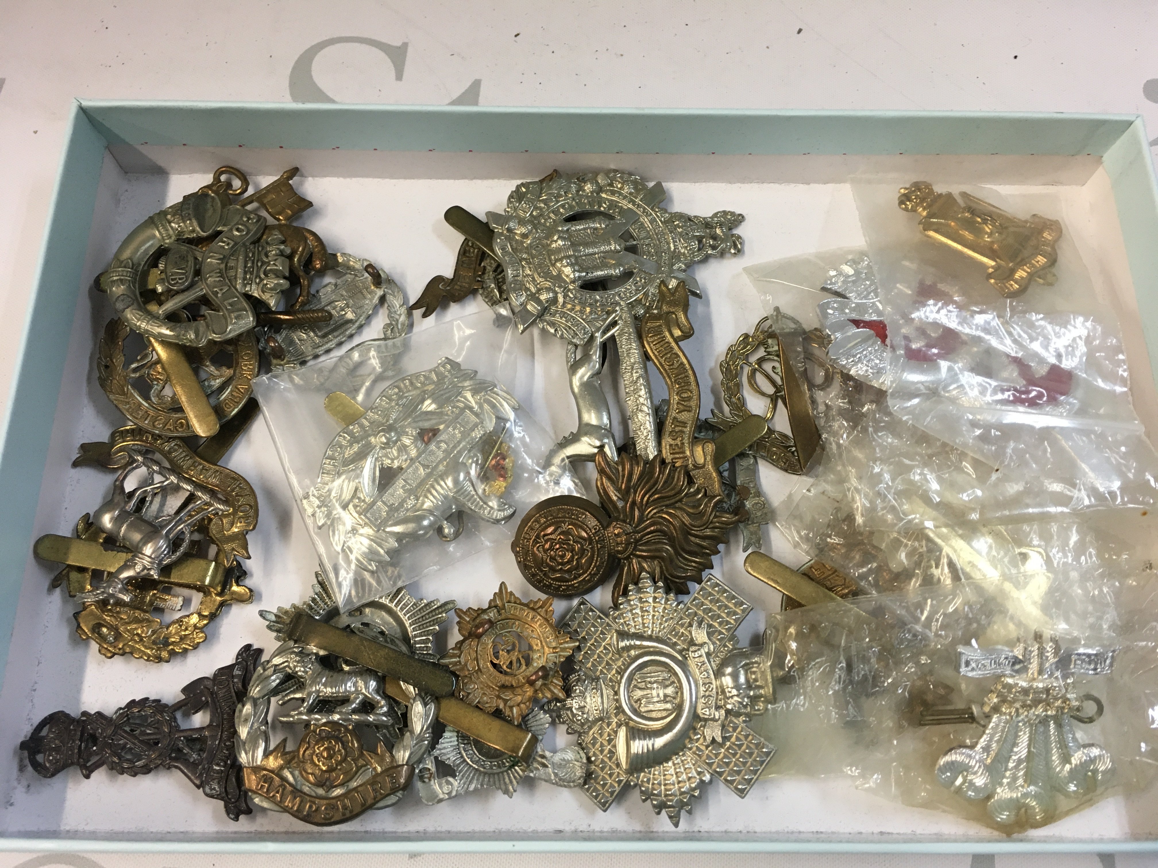 A Collection of various cap badges including Royal Sussex Reg, Hampshire, Cornwall 1st vb etc