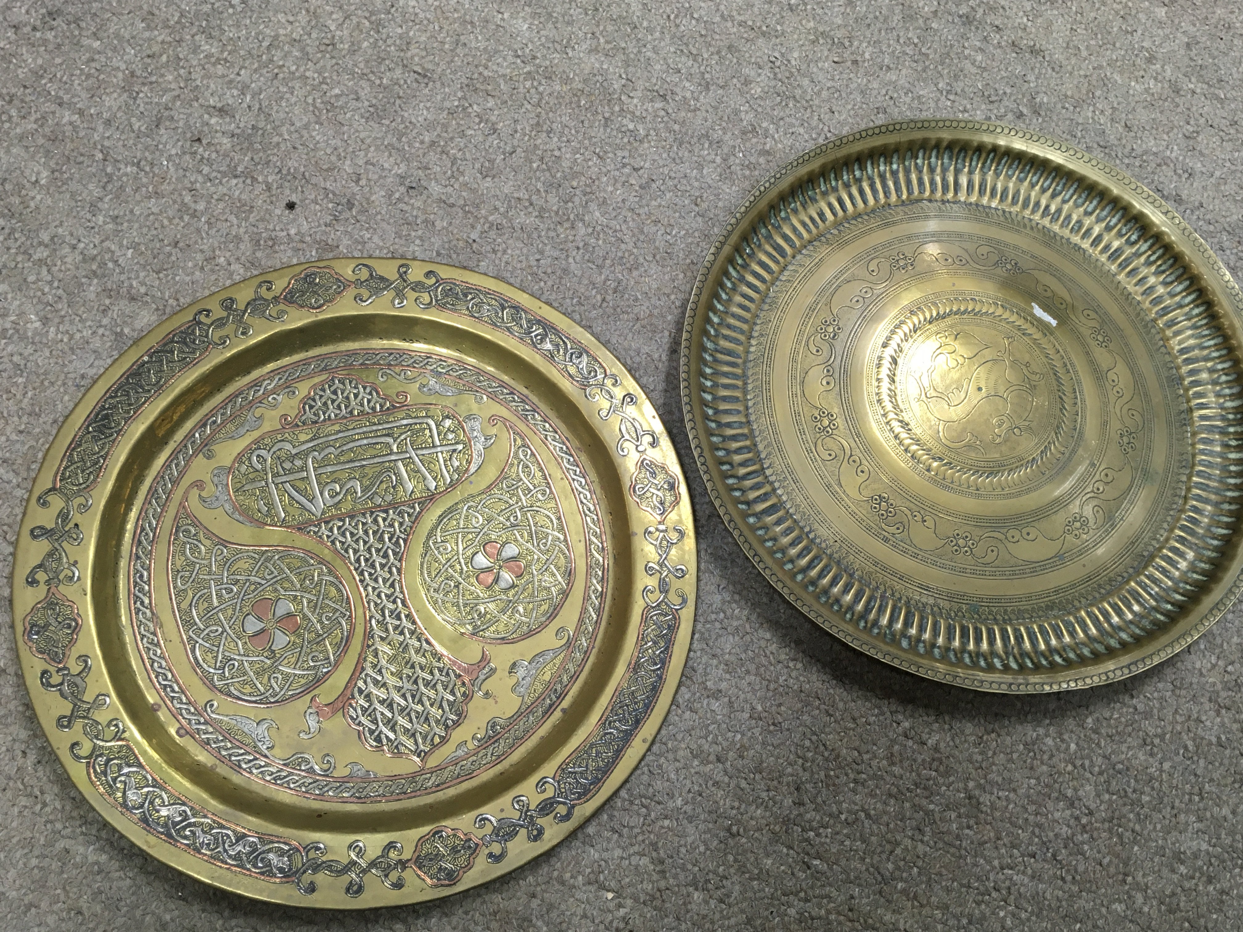 A large glass pink lamp shade with hand painted floral decoration , Indian ware brass dish