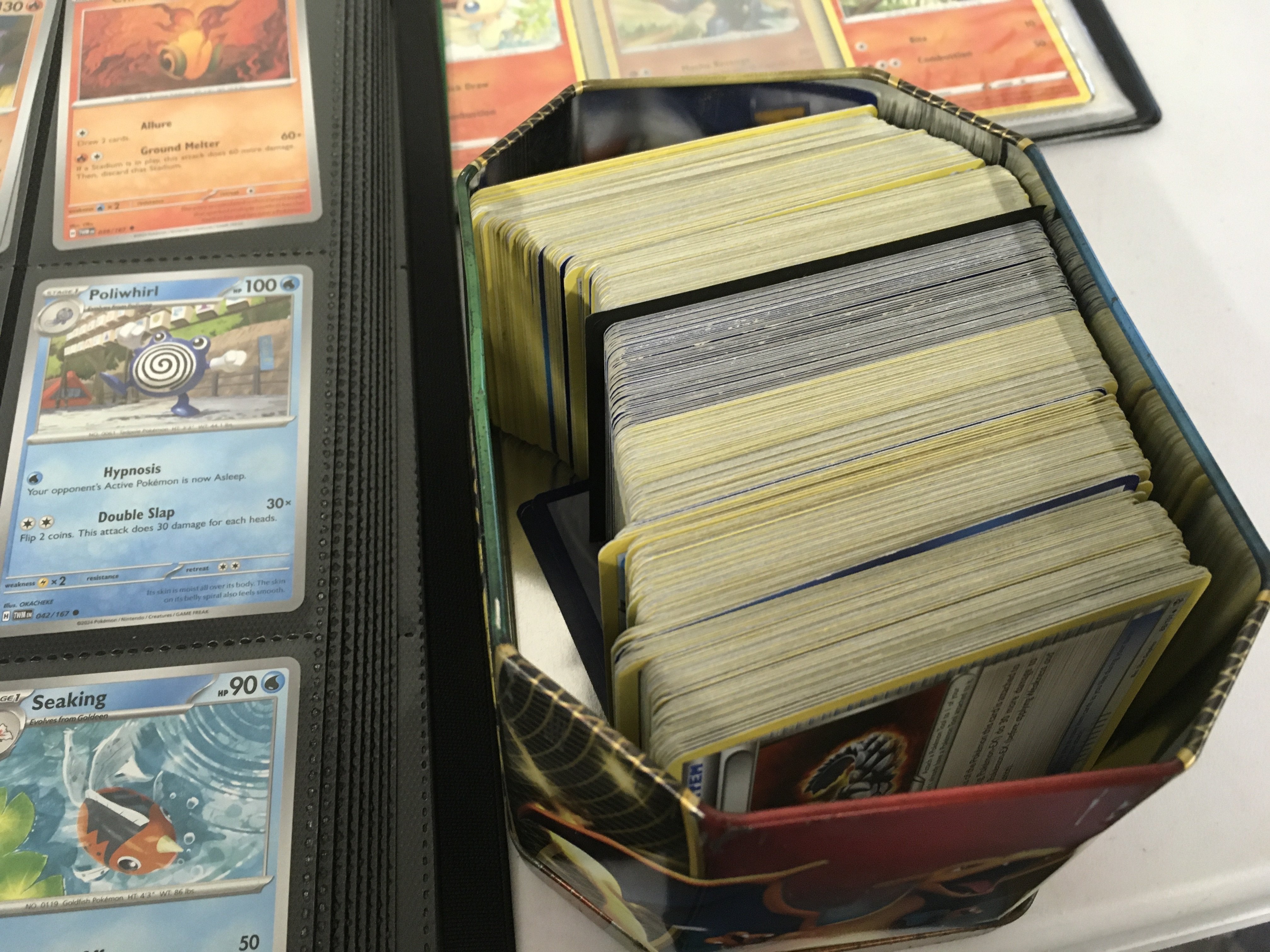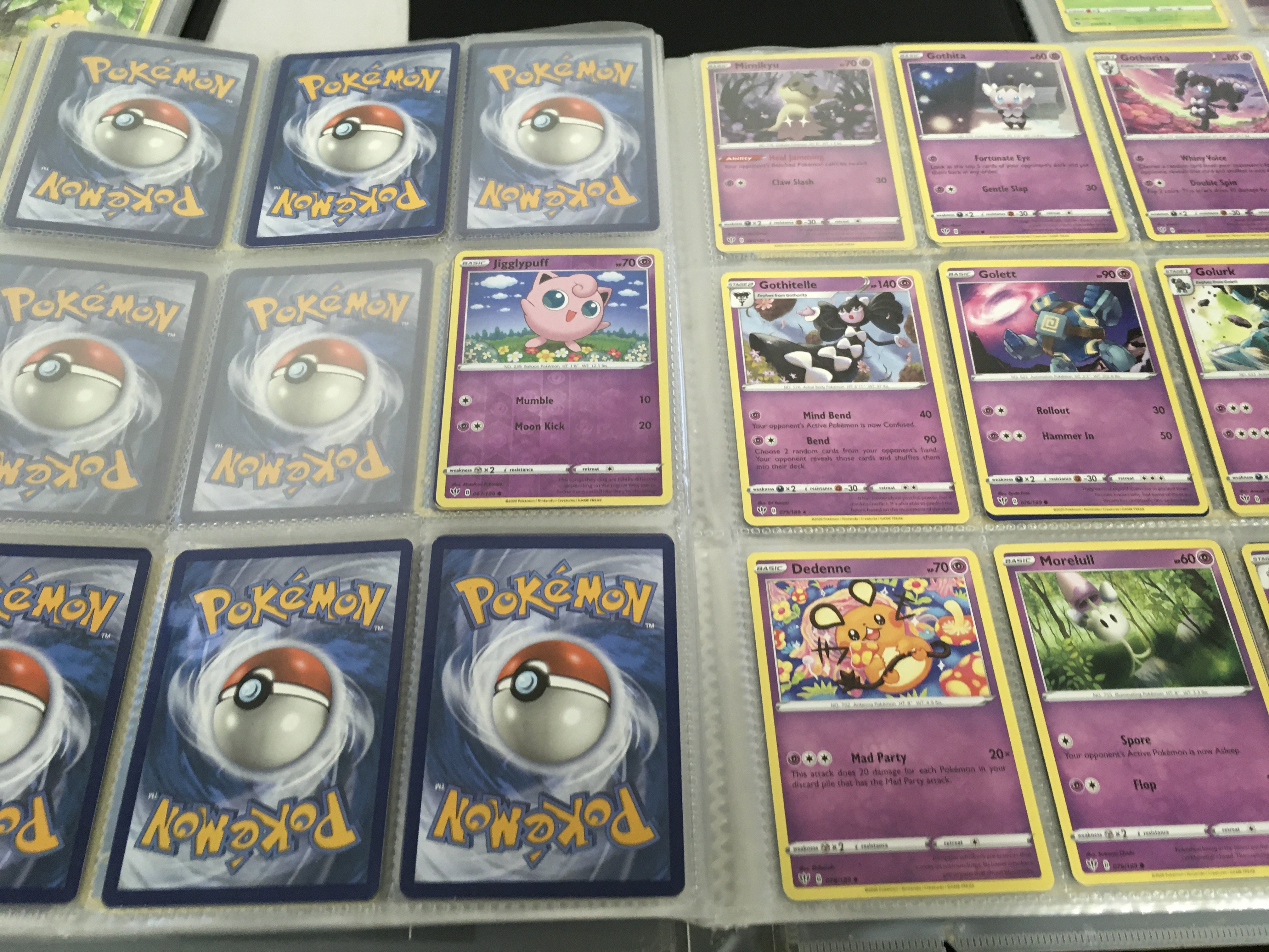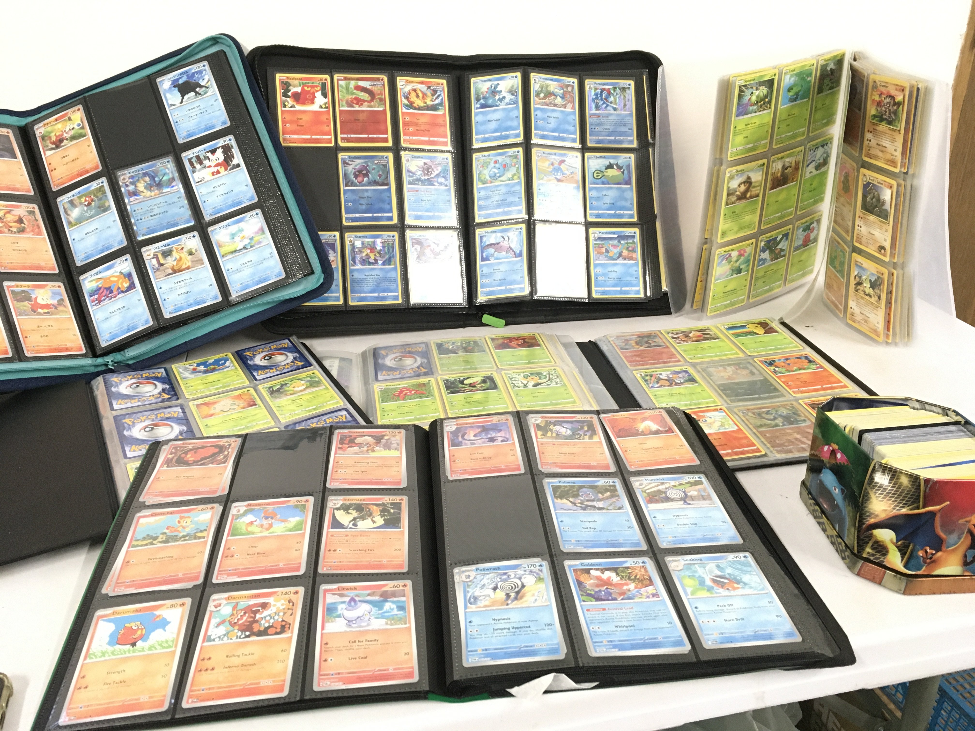 A collection of modern pokemon cards, in 7 albums and a tin.