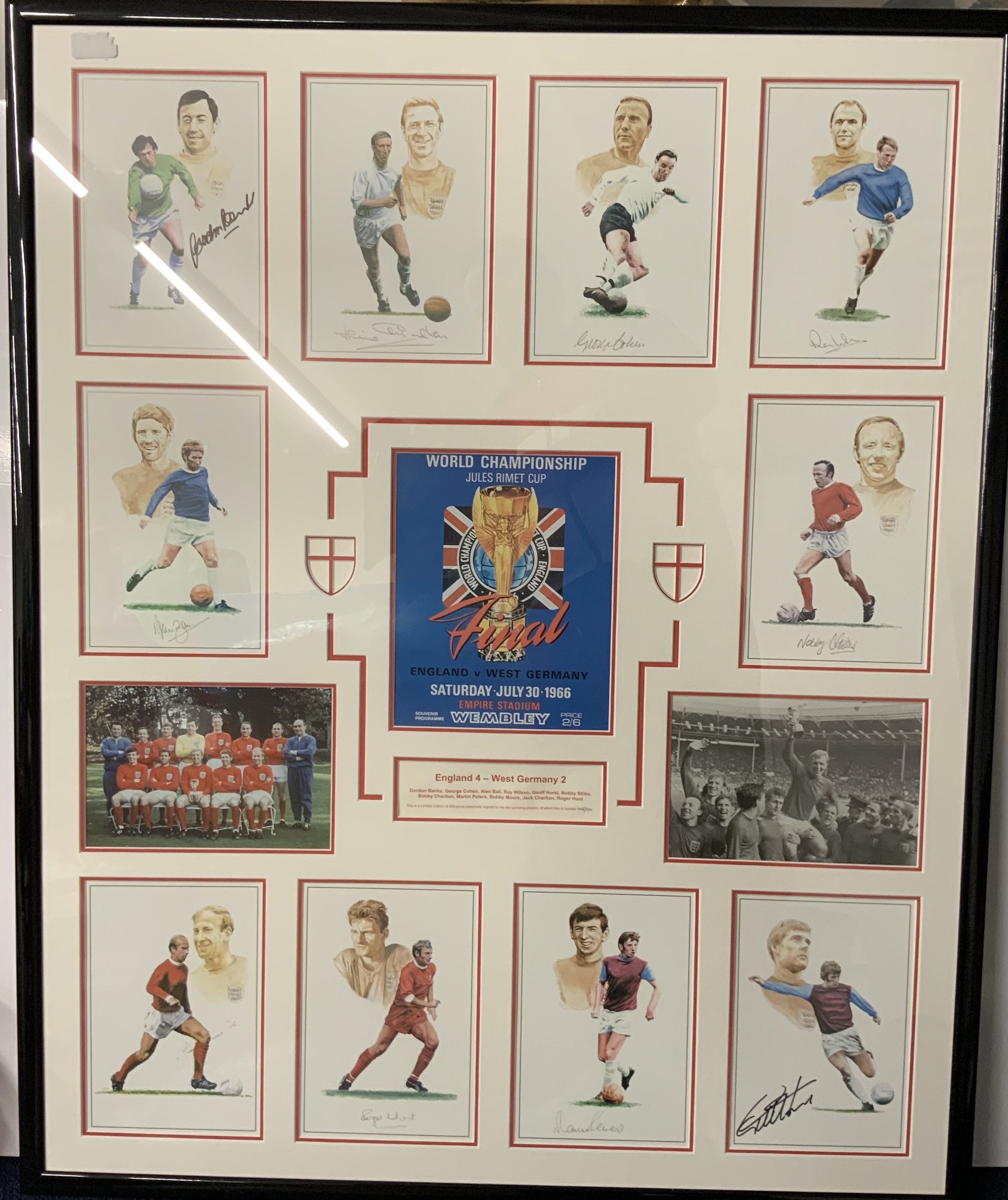 England 1966 World Cup Winners Signed Football Display: Massive genuine quality framed display of the 10 winning players in their club kit on a print individually hand signed without dedication. Expensively framed with picture of the final programme and 2 pictures including a team group. Only lacking Bobby Moore who had died before this series was made. Measures 33 x 41 inches. Not for posting.