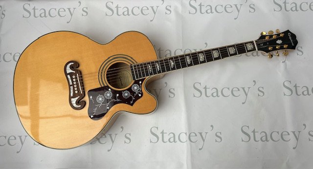 An Epiphone EJ 200 Electro-Acoustic Guitar with built in pickup and Epiphone Sonic 2 system. Come with gold plated parts and in very good + condition. Very light playwear and fret-wear. Comes with gig bag. Click Here to Register to bid