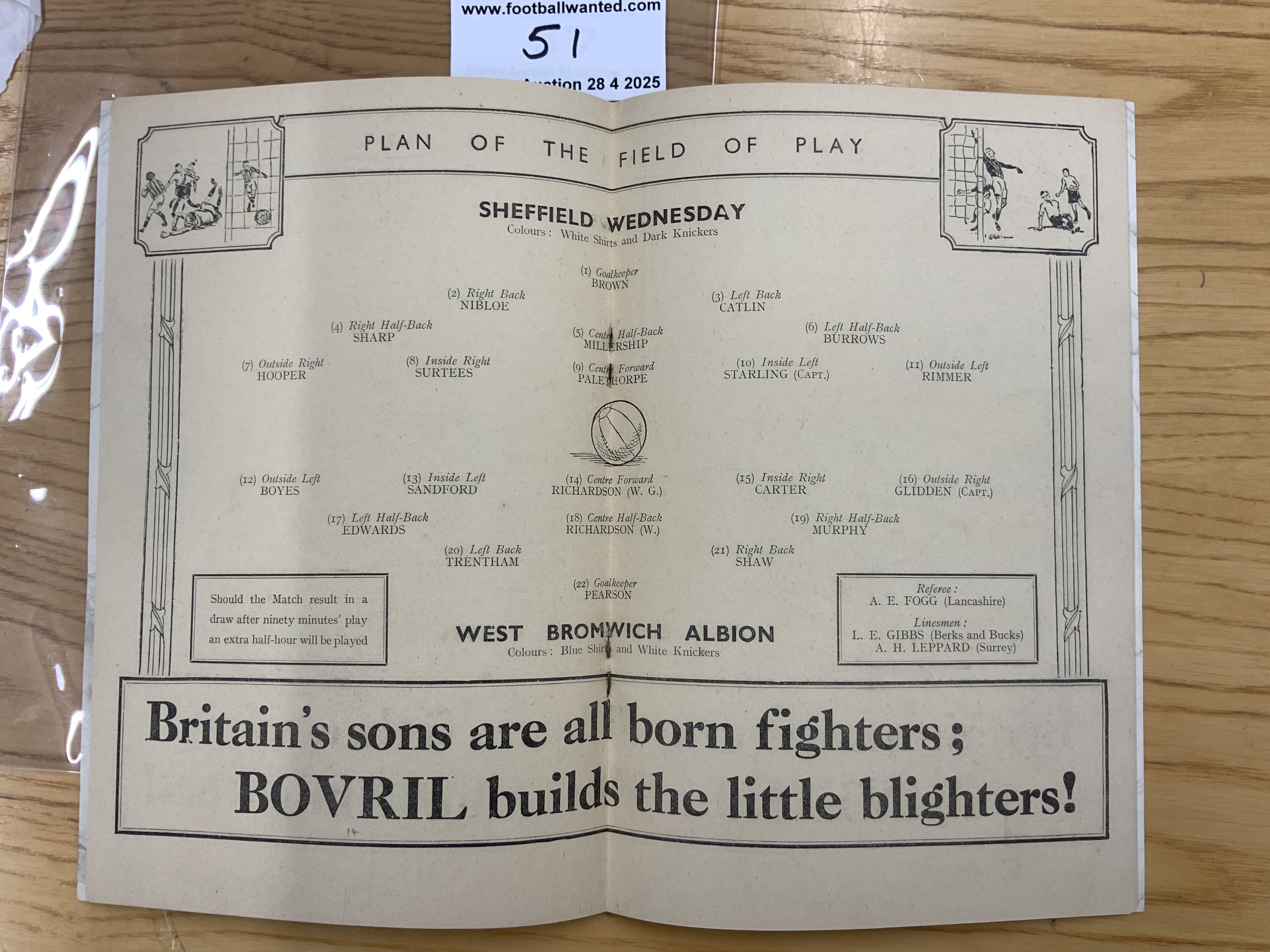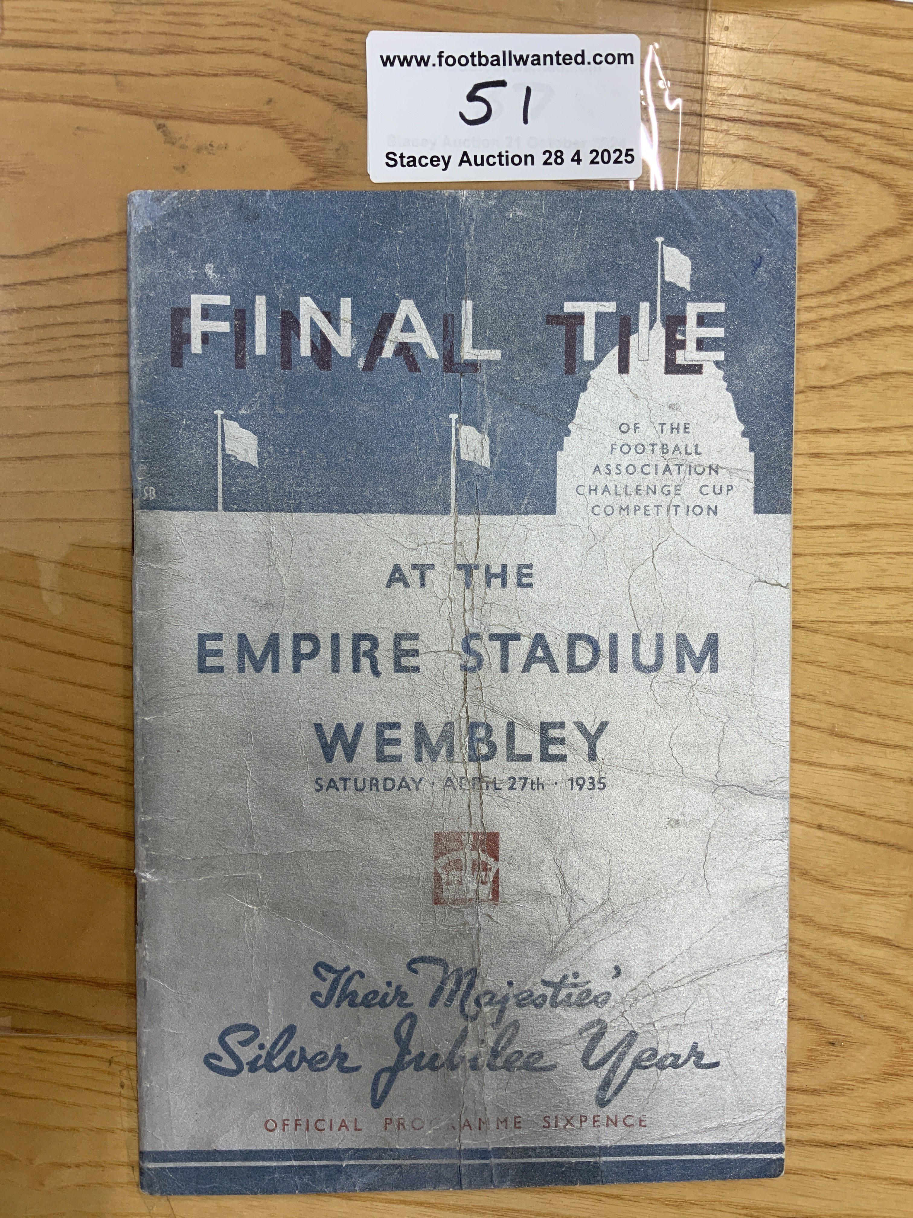 1935 FA Cup Final Football Programme: Sheffield Wednesday v West Brom in good condition with no team changes. The jubilee cover has had a fold which tends to stay in this style of paper this year. Professional clean and repair to spine.