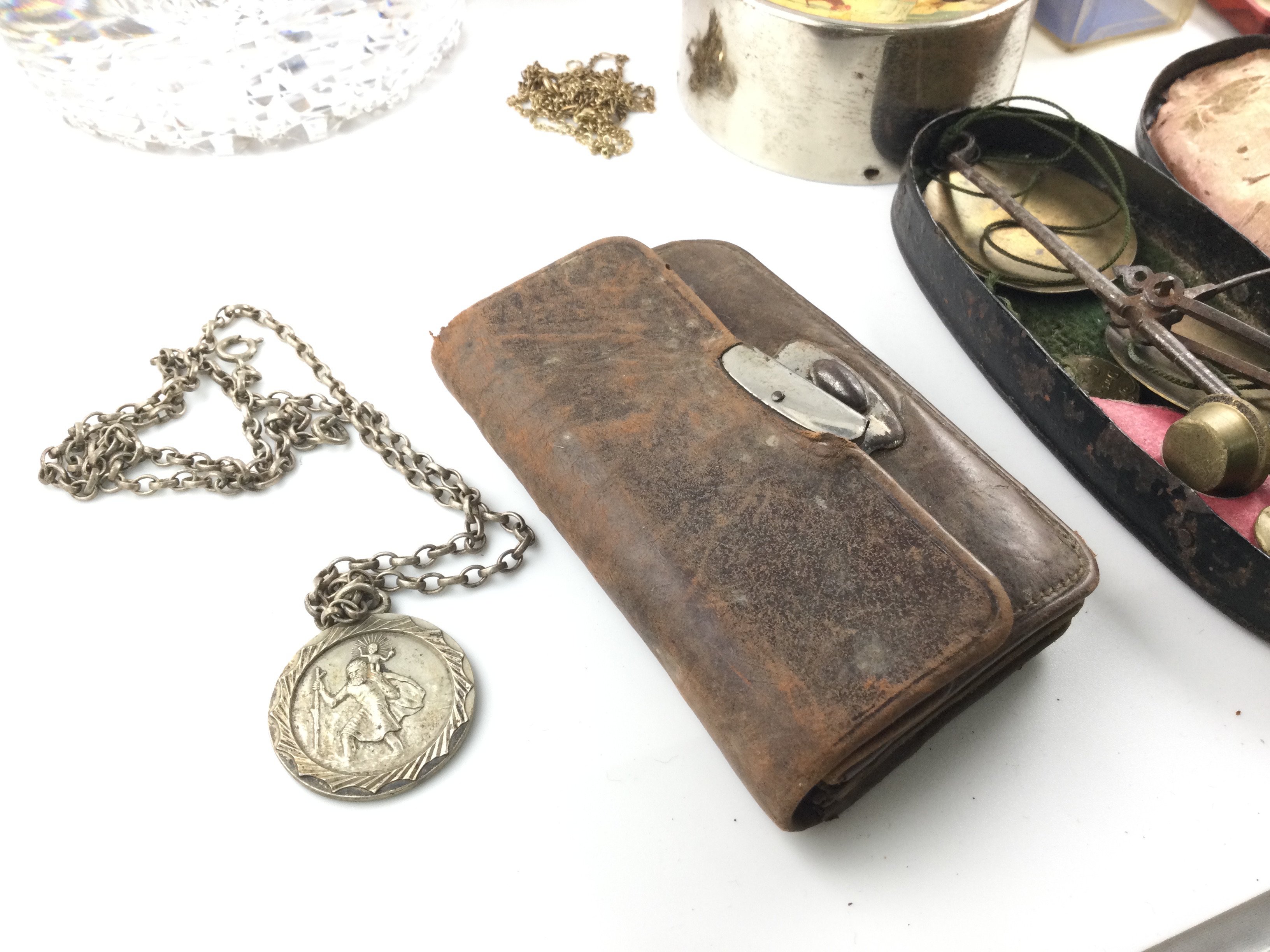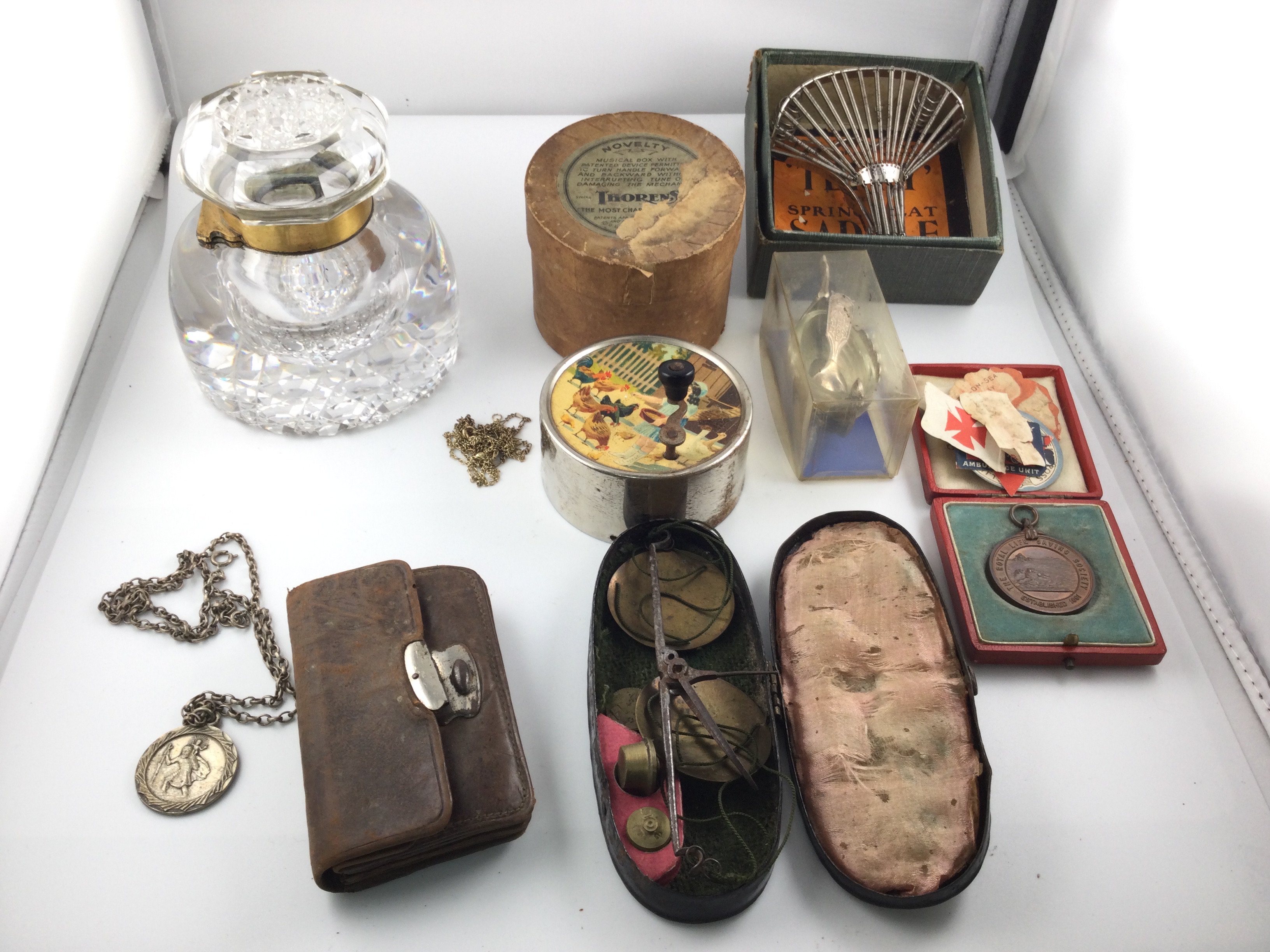 A mixed lot including a Terry Sprung seat a set of sovereign scales silver medallion on chain an ink well etc. Postage B