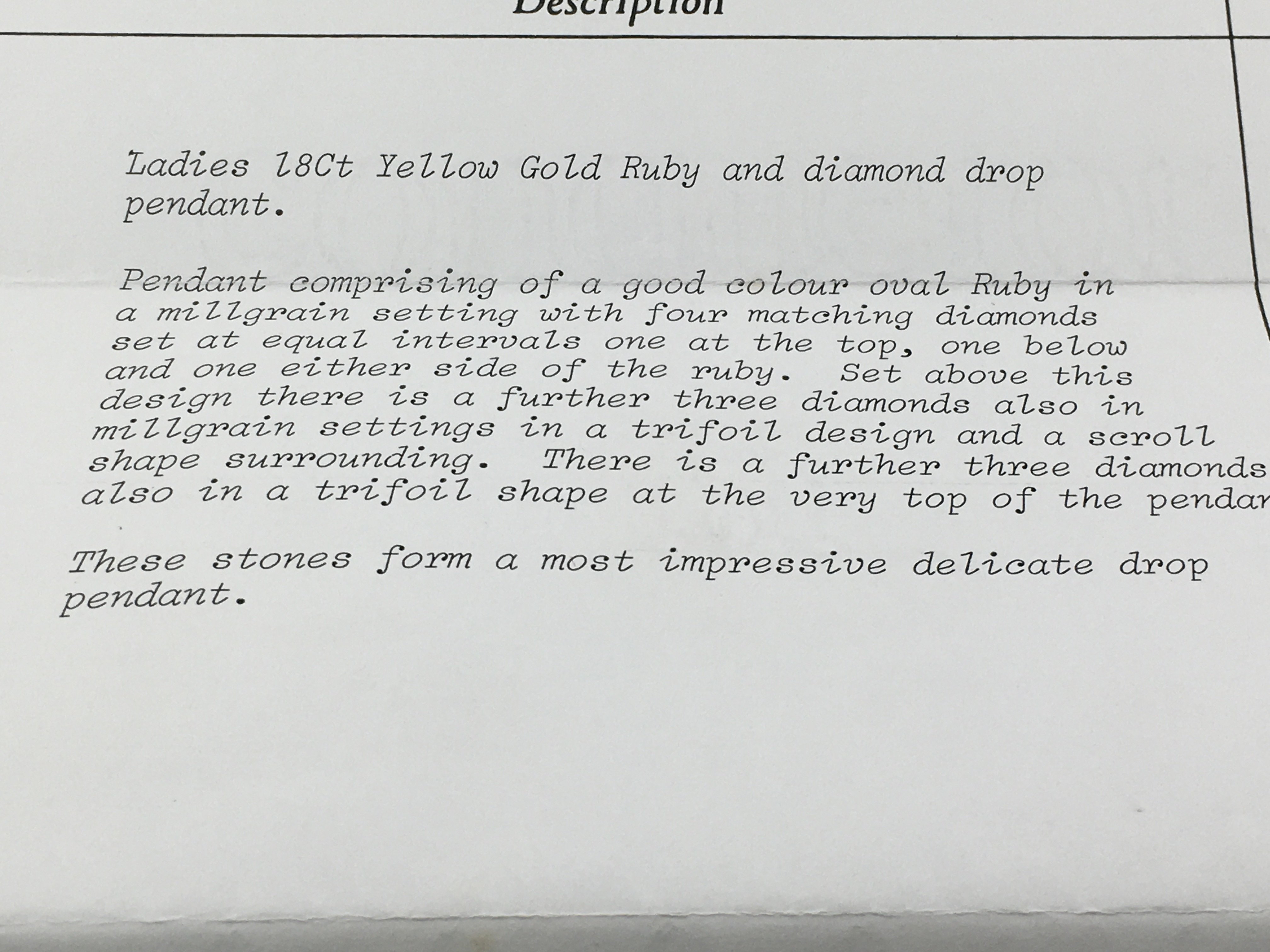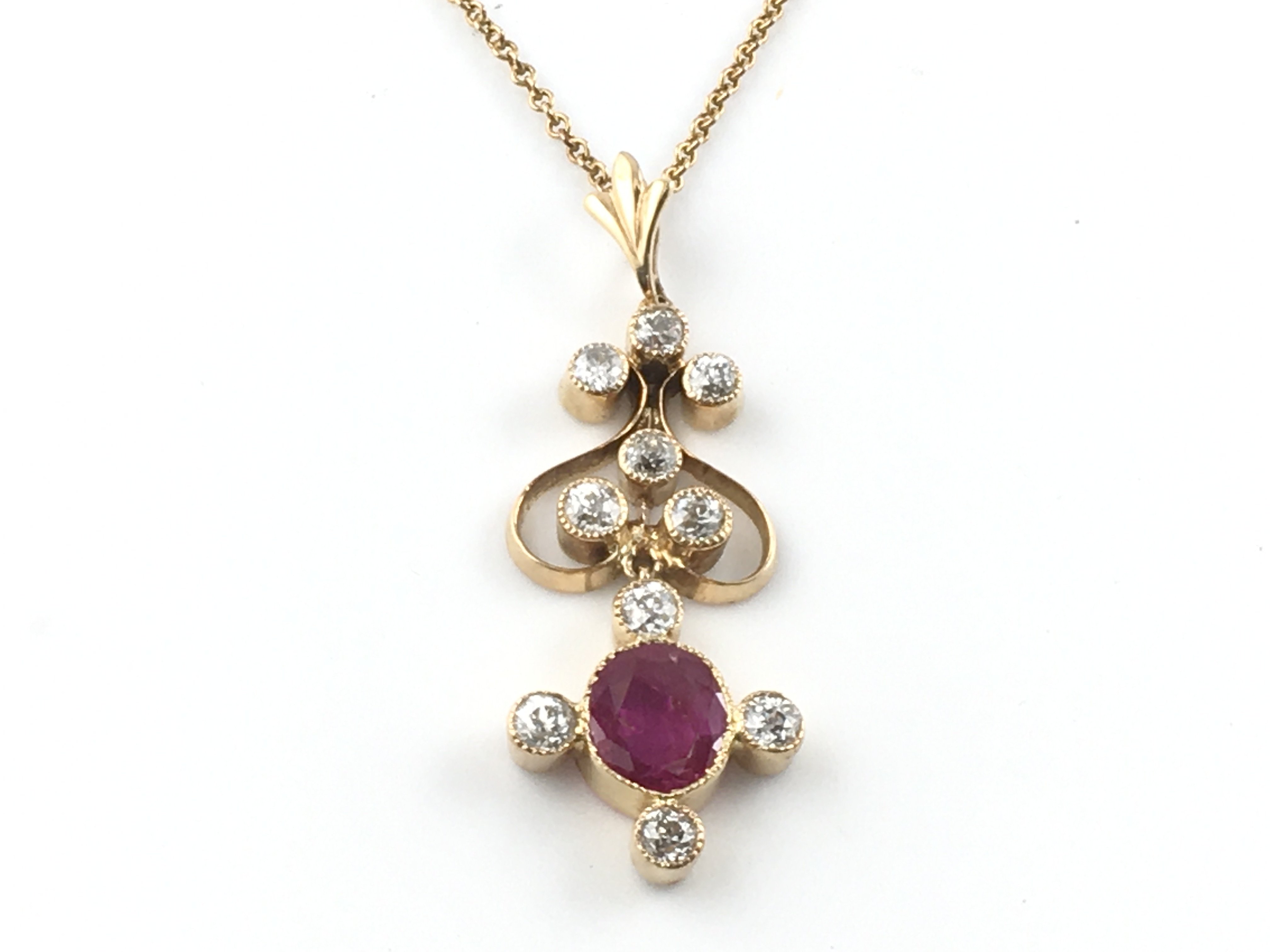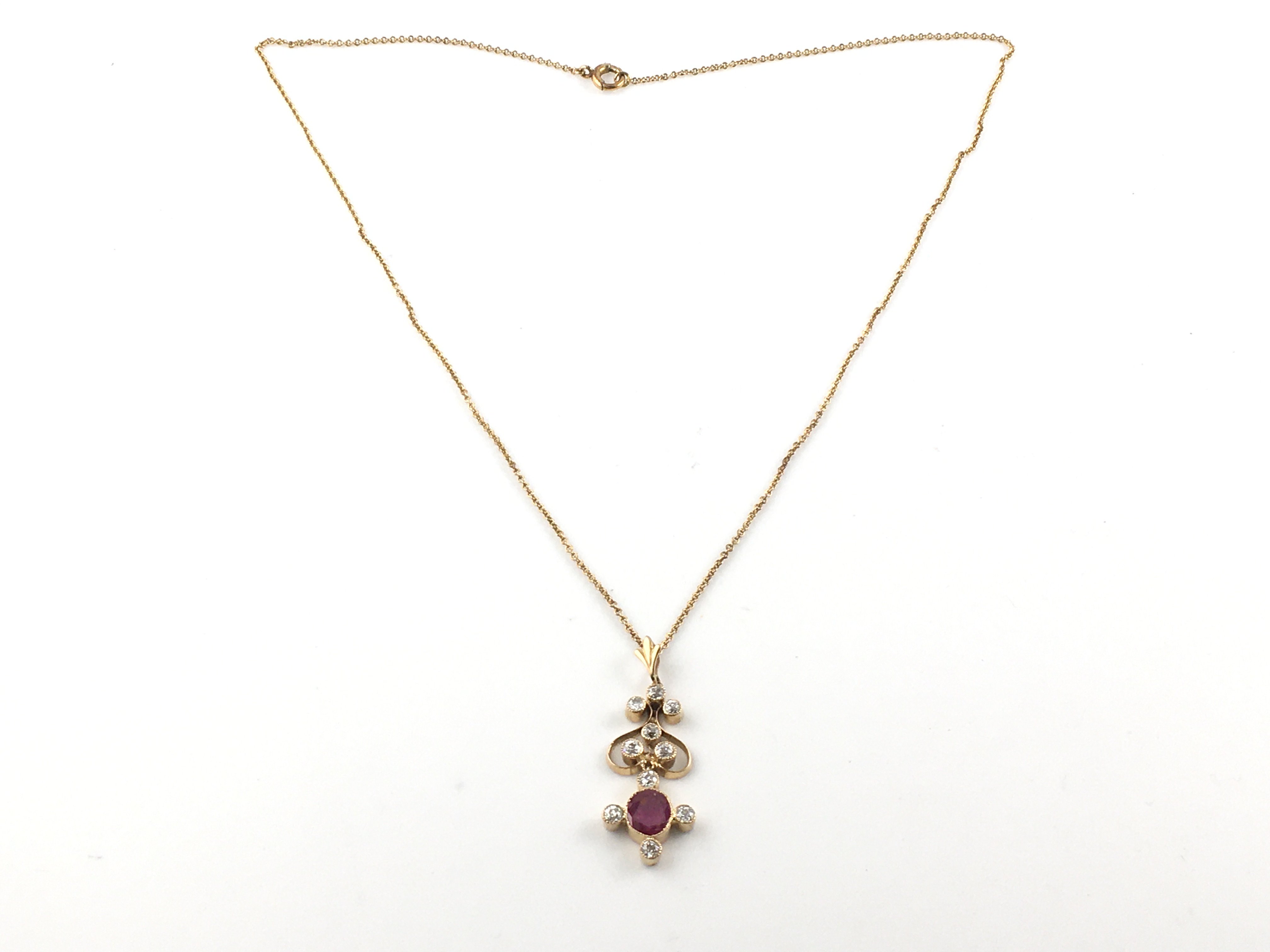 An 18ct Ruby and diamond Edwardian style drop pendant and 14ct gold chain.4.39g total.