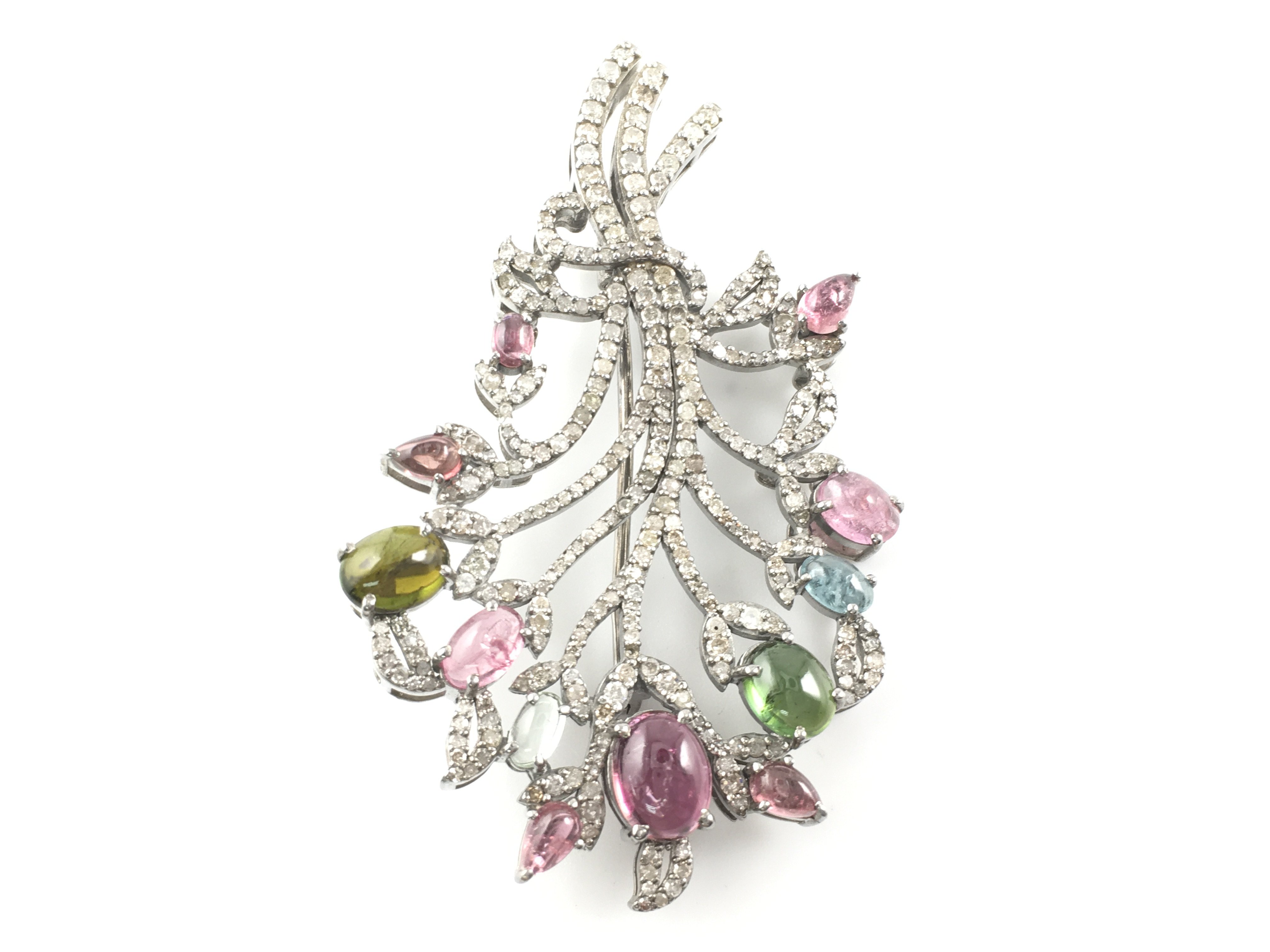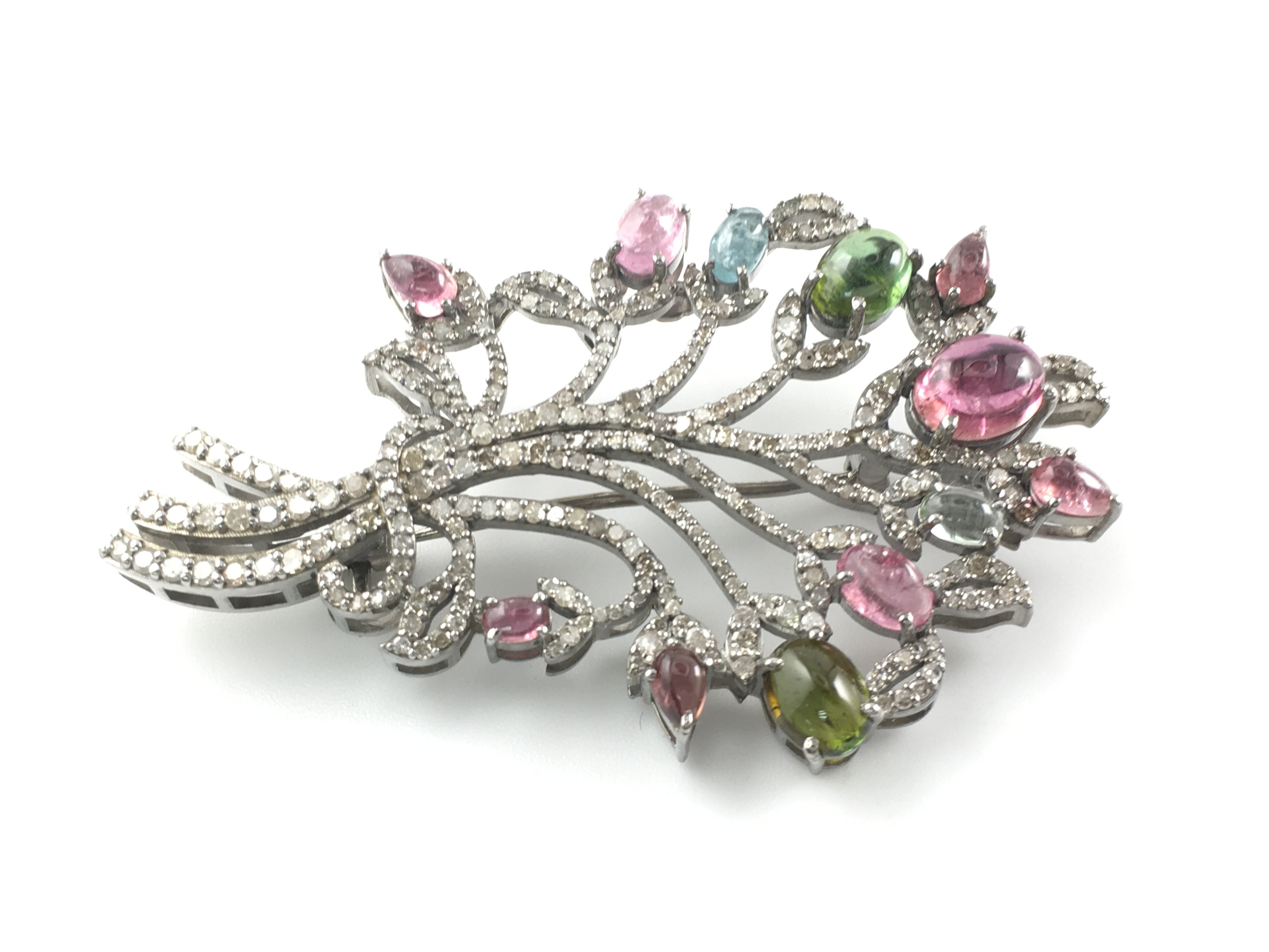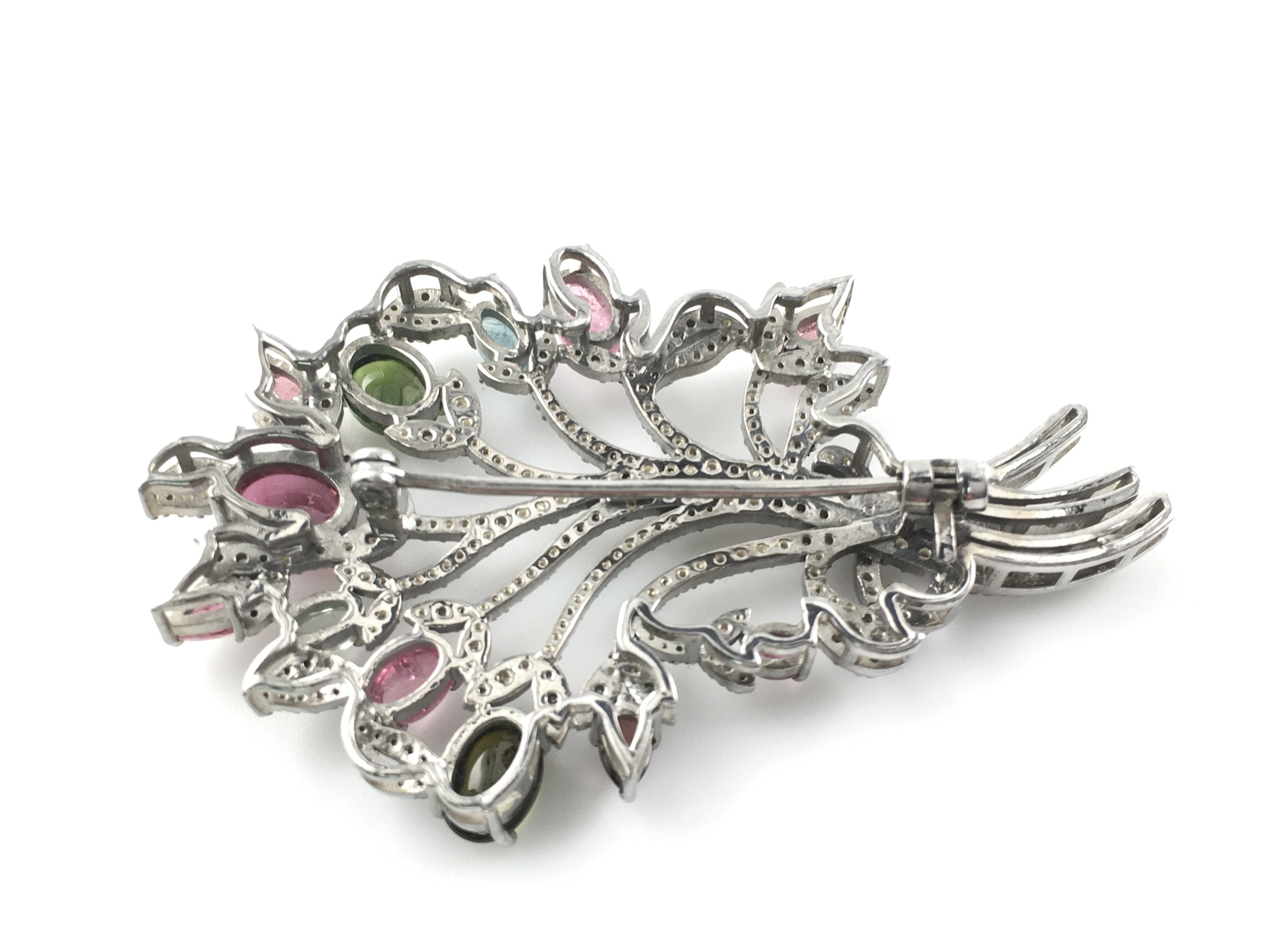 Tree of life style pin bar brooch set with multicoloured tourmalines and diamonds set in silver.Tourmalines 5.30ct and diamonds 2.40ct. Approximately 40mm by 70mm.Postage A