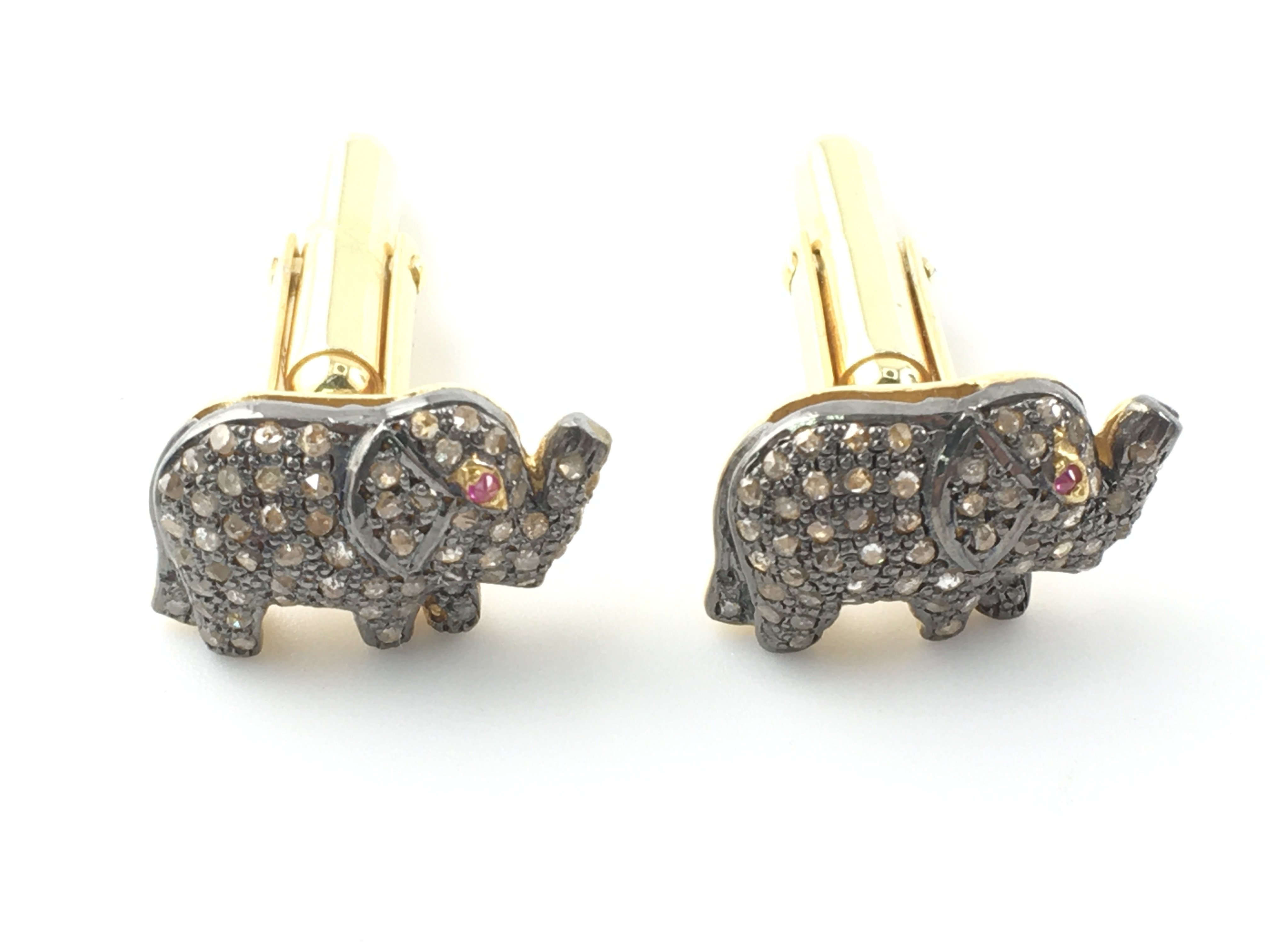 A pair of silver gilt diamond set elephant cufflinks with ruby eyes. Diamonds approx 0.70ct and ruby 0.03ct
