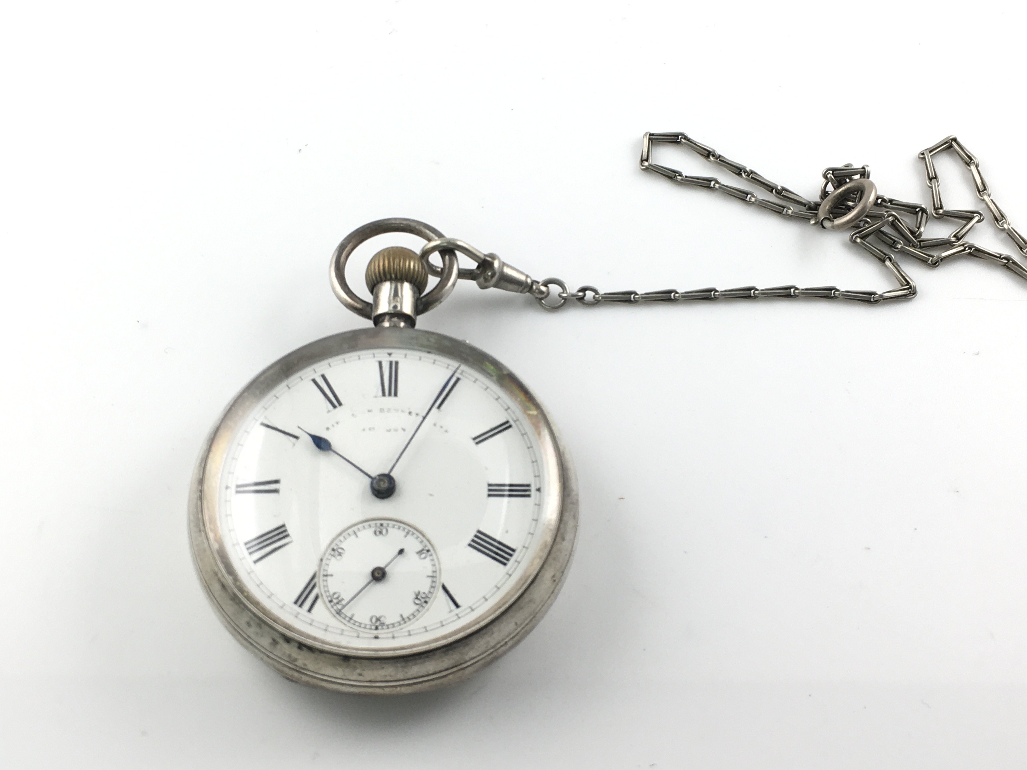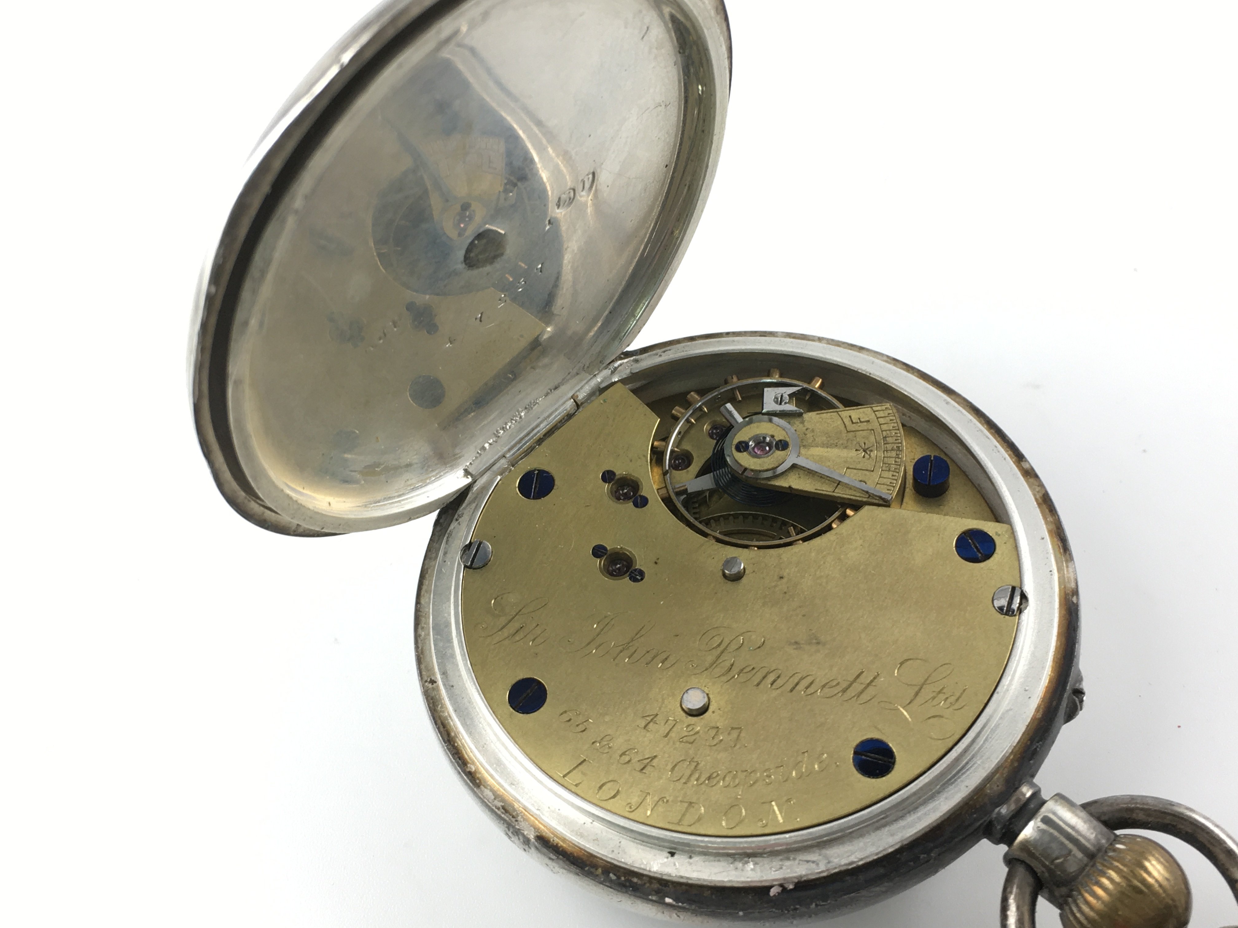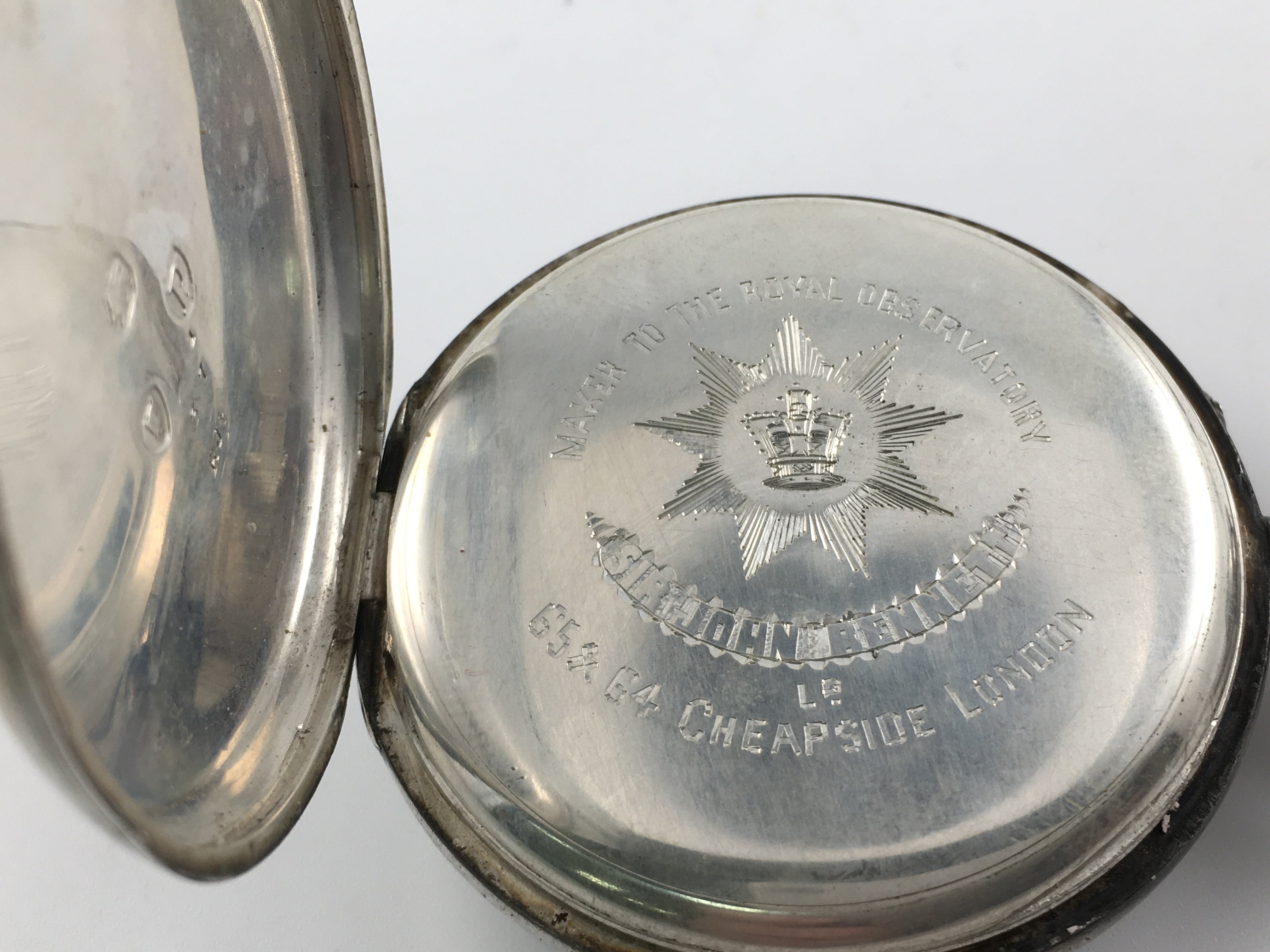 A silver pocket watch. Not seen running. 106g total weight. Approx 50mm case diameter. Postage B