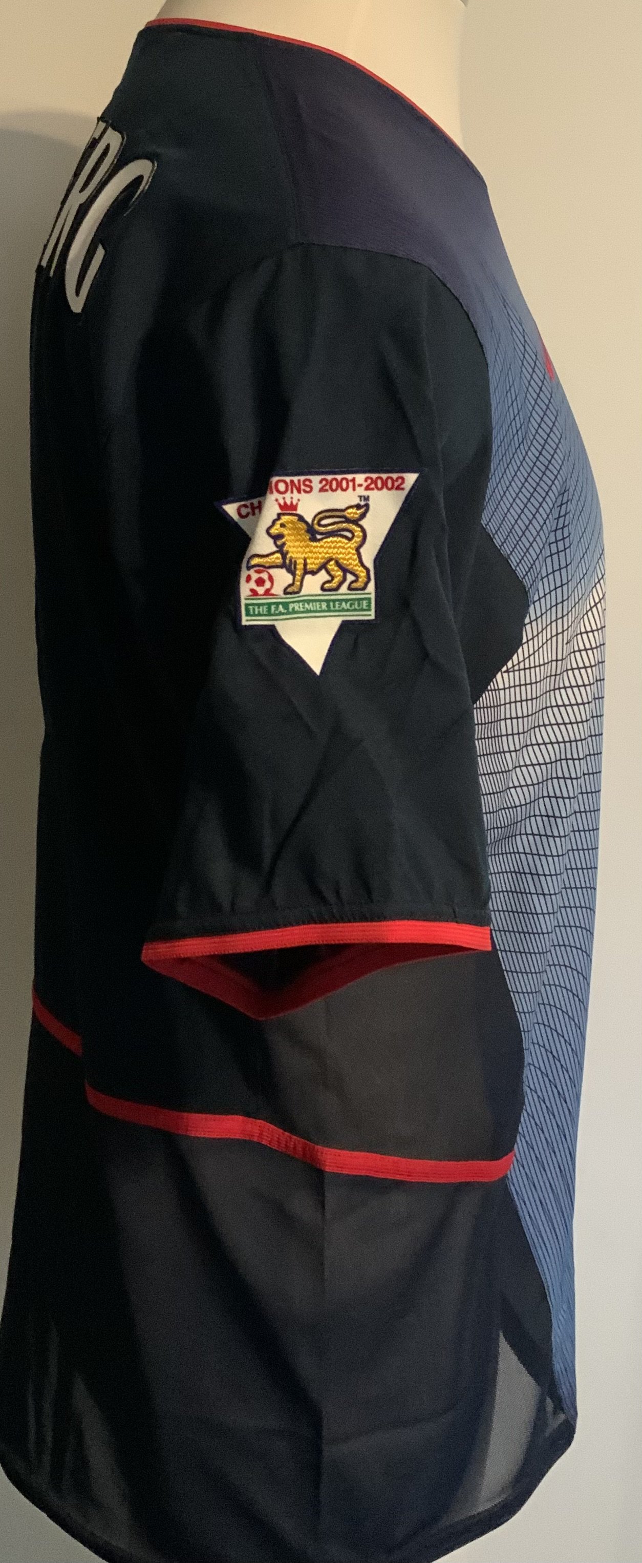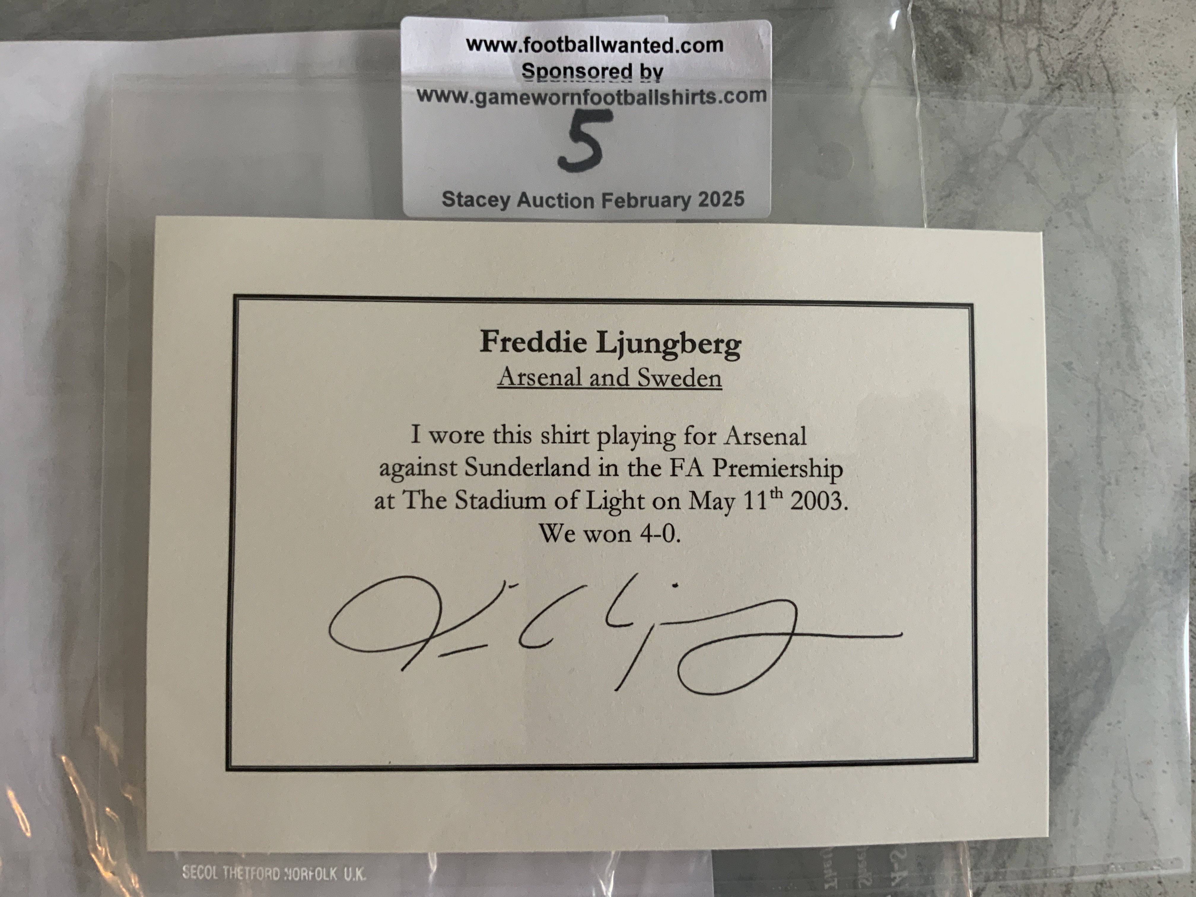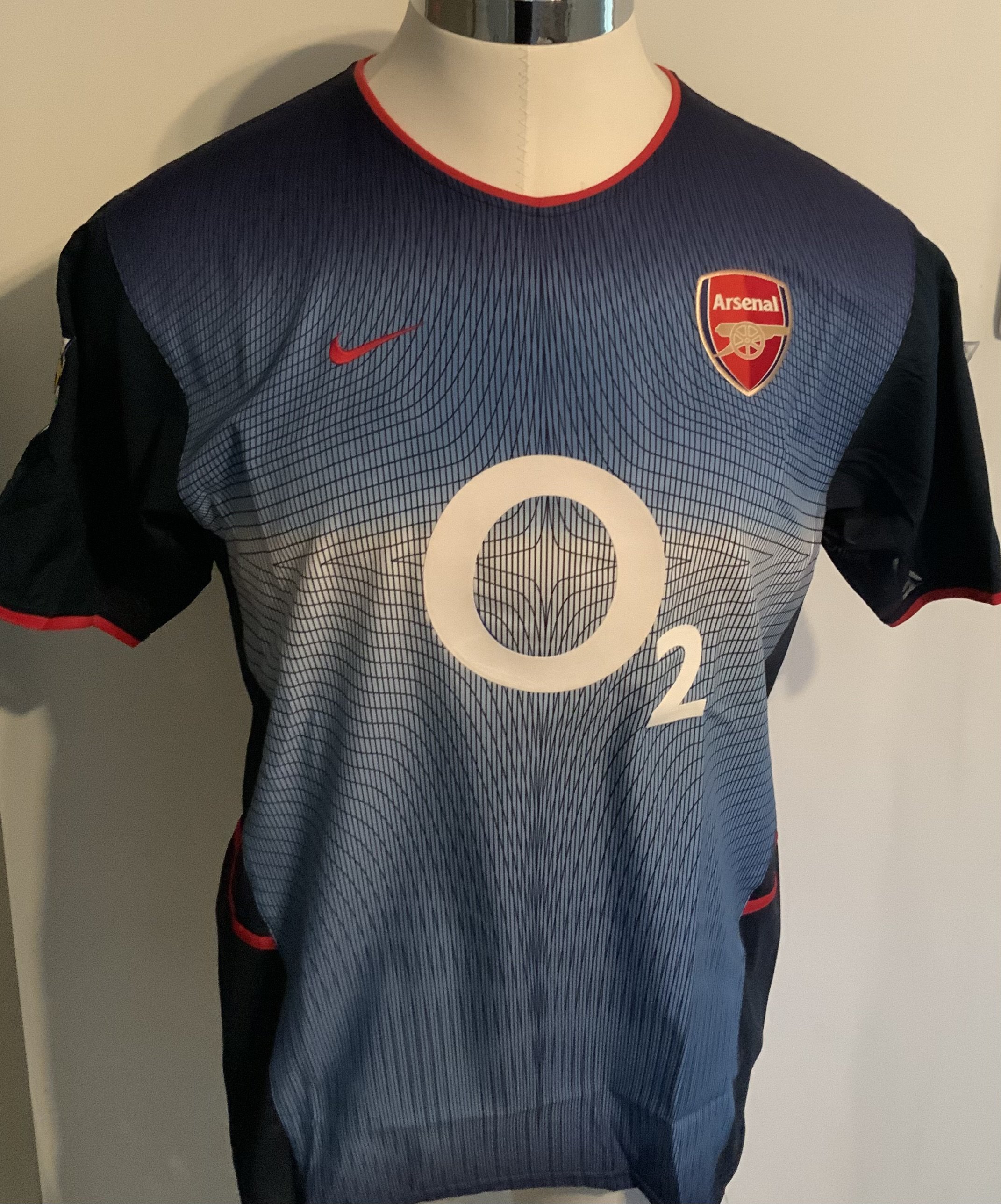 Arsenal 2002 - 2003 Away Match Worn Football Shirt: Blue short sleeve Nike shirt with Premier League Champions 2001 - 2002 badging to sleeves. Ljunberg 8 to rear. Worn v Sunderland on 11 May 2003. Comes with signed COA from the player who scored 3 goals in the match.