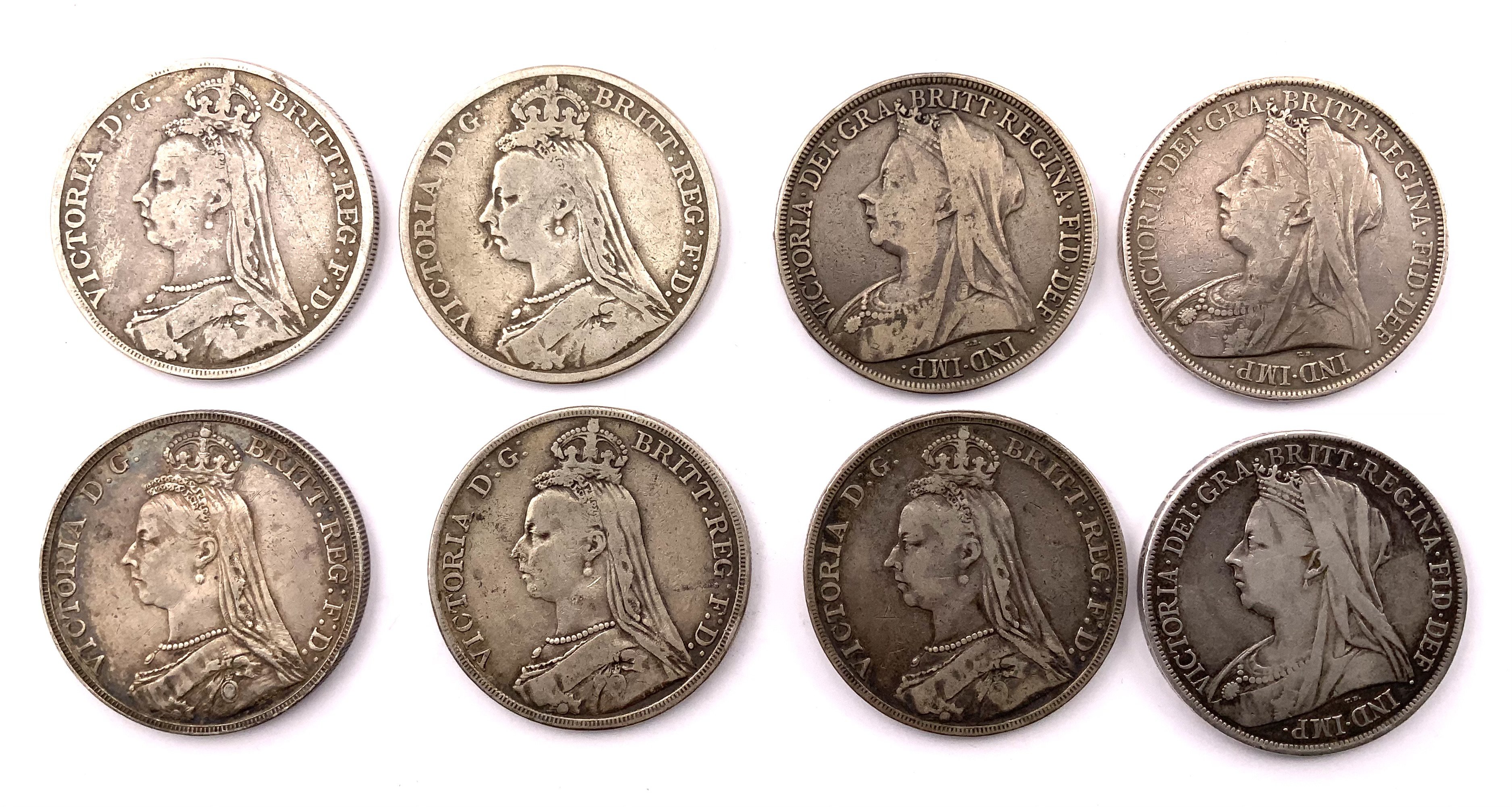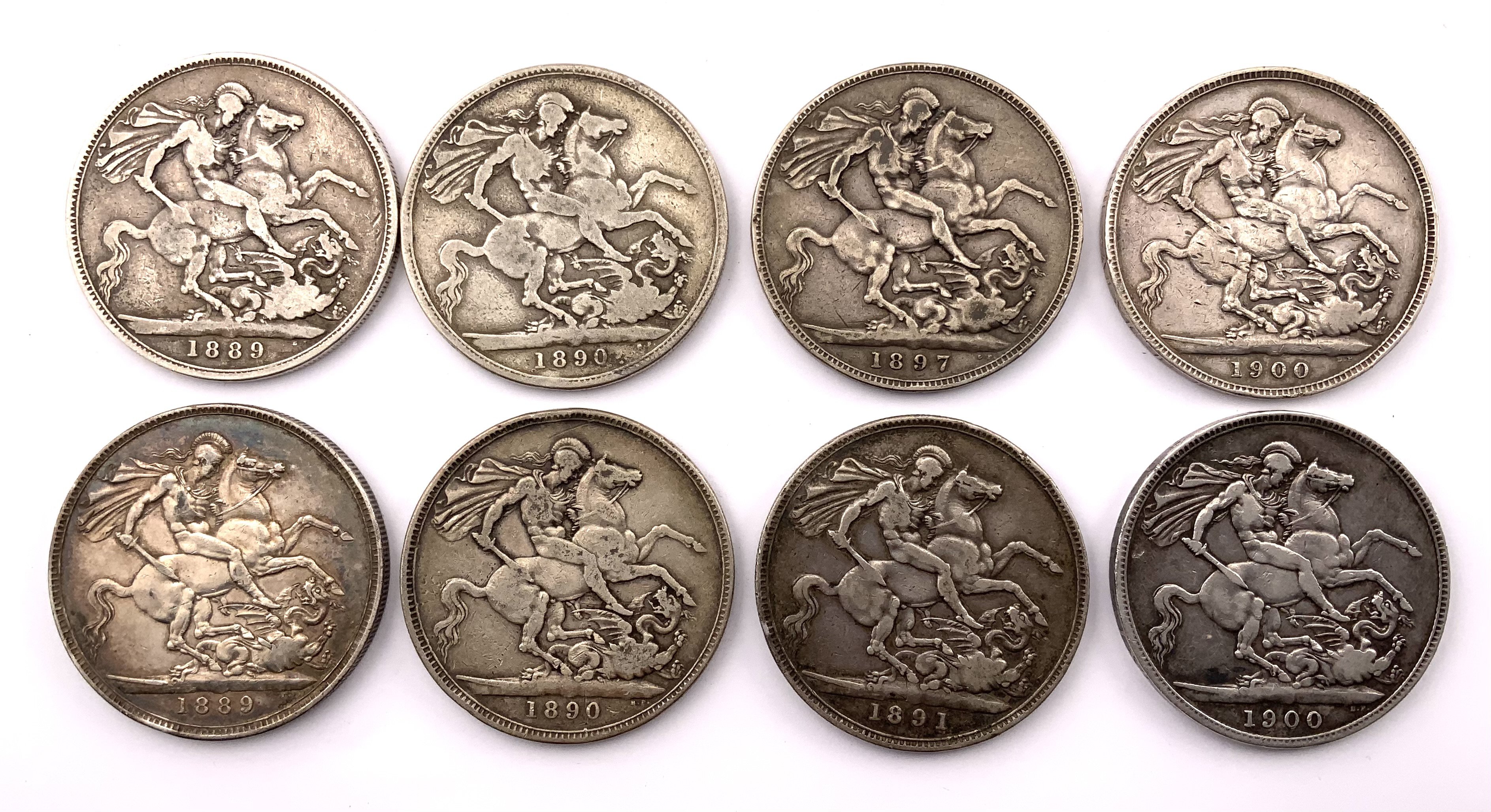 8 Queen Victoria crowns to include. 2 1890, 1891, 1897, 2 1889, 2 1900. All XF. (A)