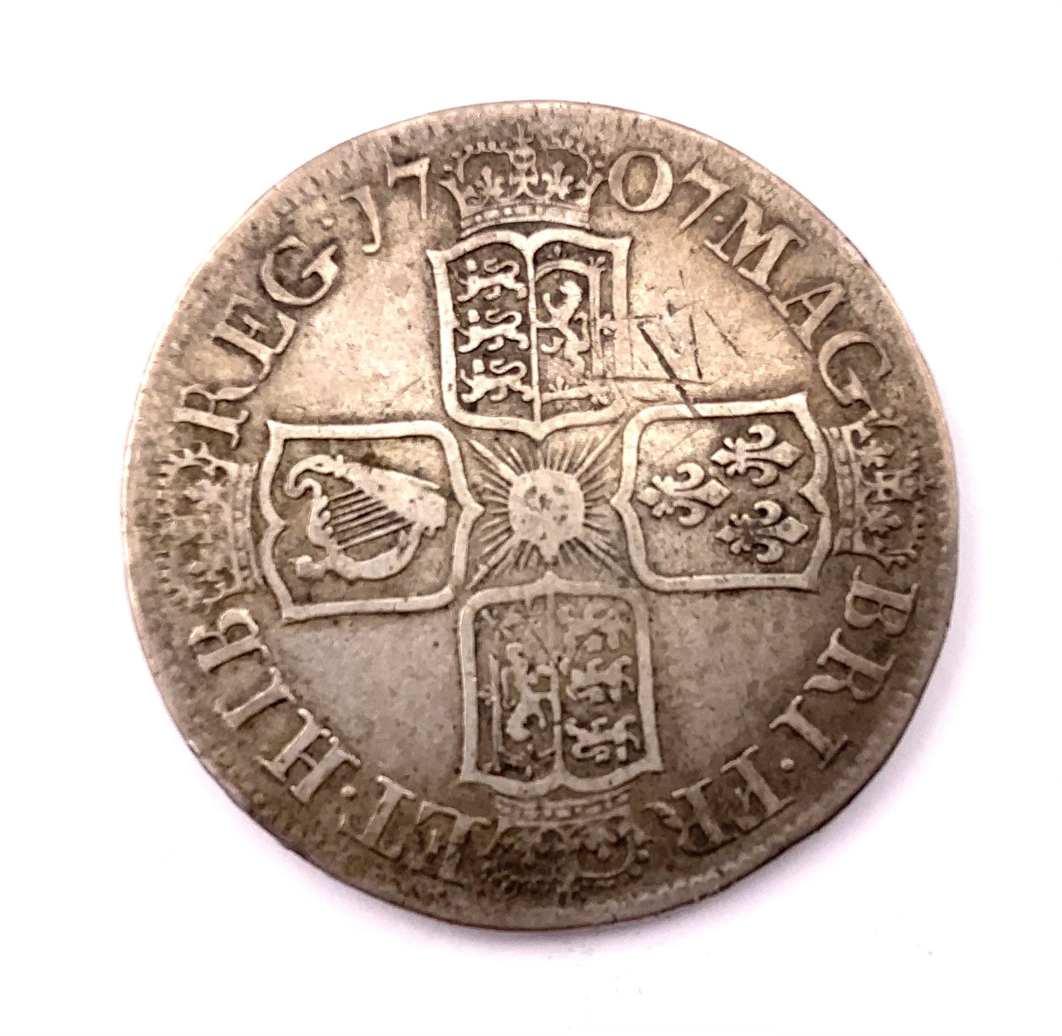 Anne 1707 E Halfcrown, Edinburgh Mint, Fine.