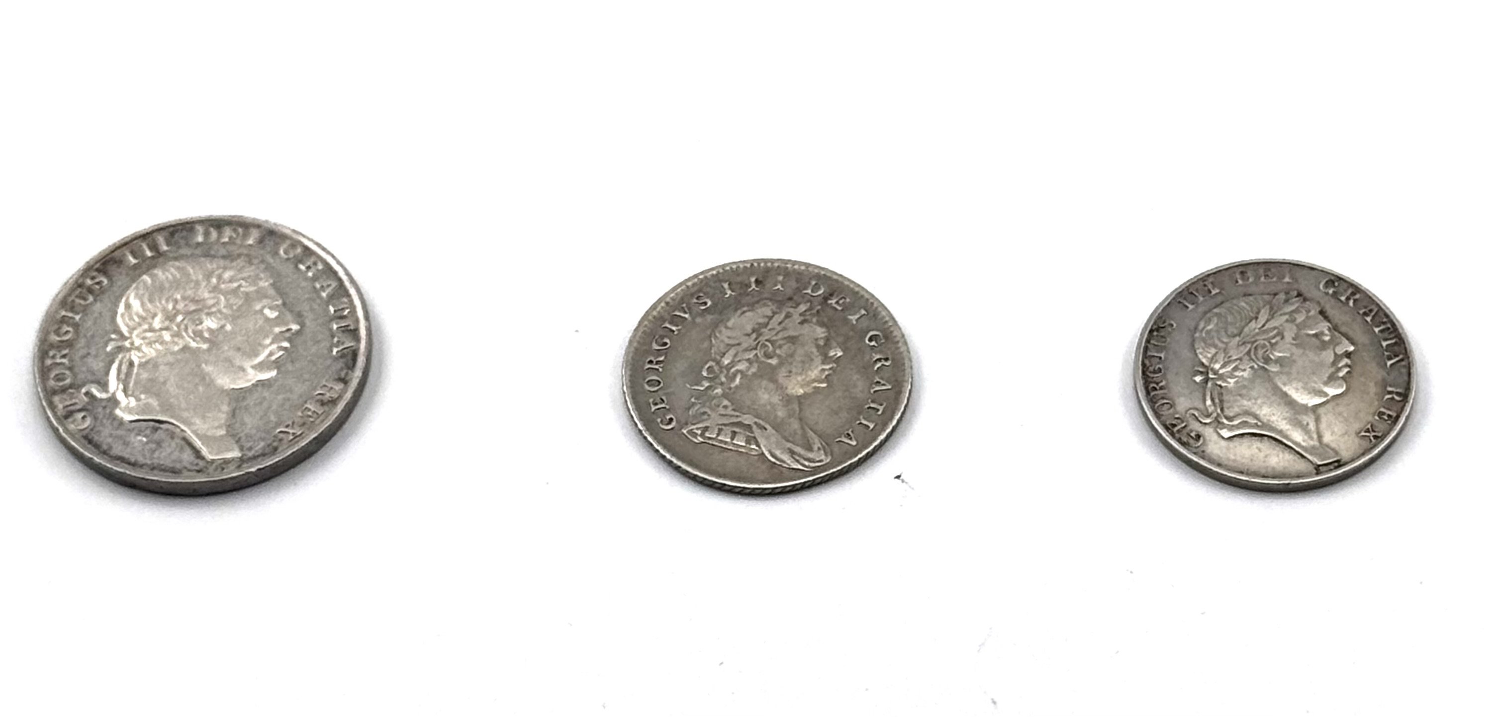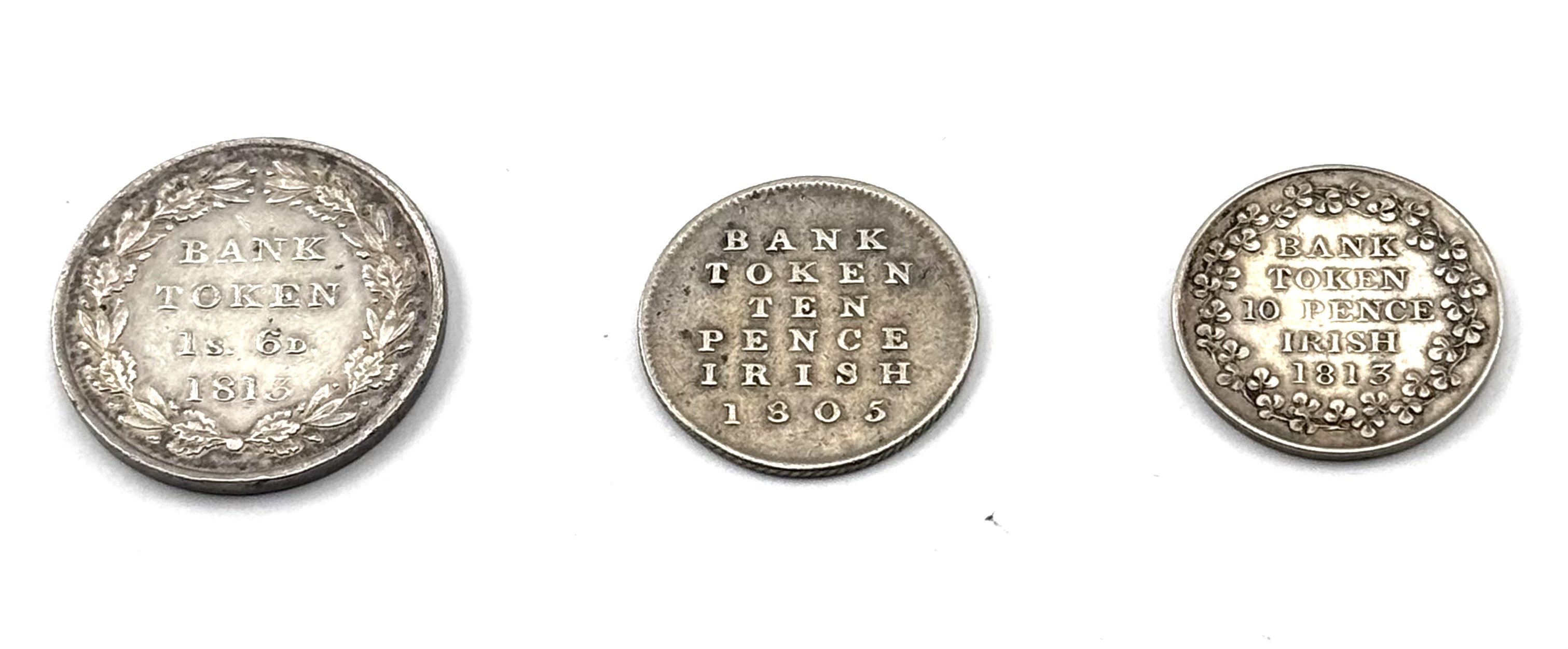 George III, 1813 1 Shilling 6d Bank Token together with an Irish 10 pence, and a 1803 Irish 10 Pence.