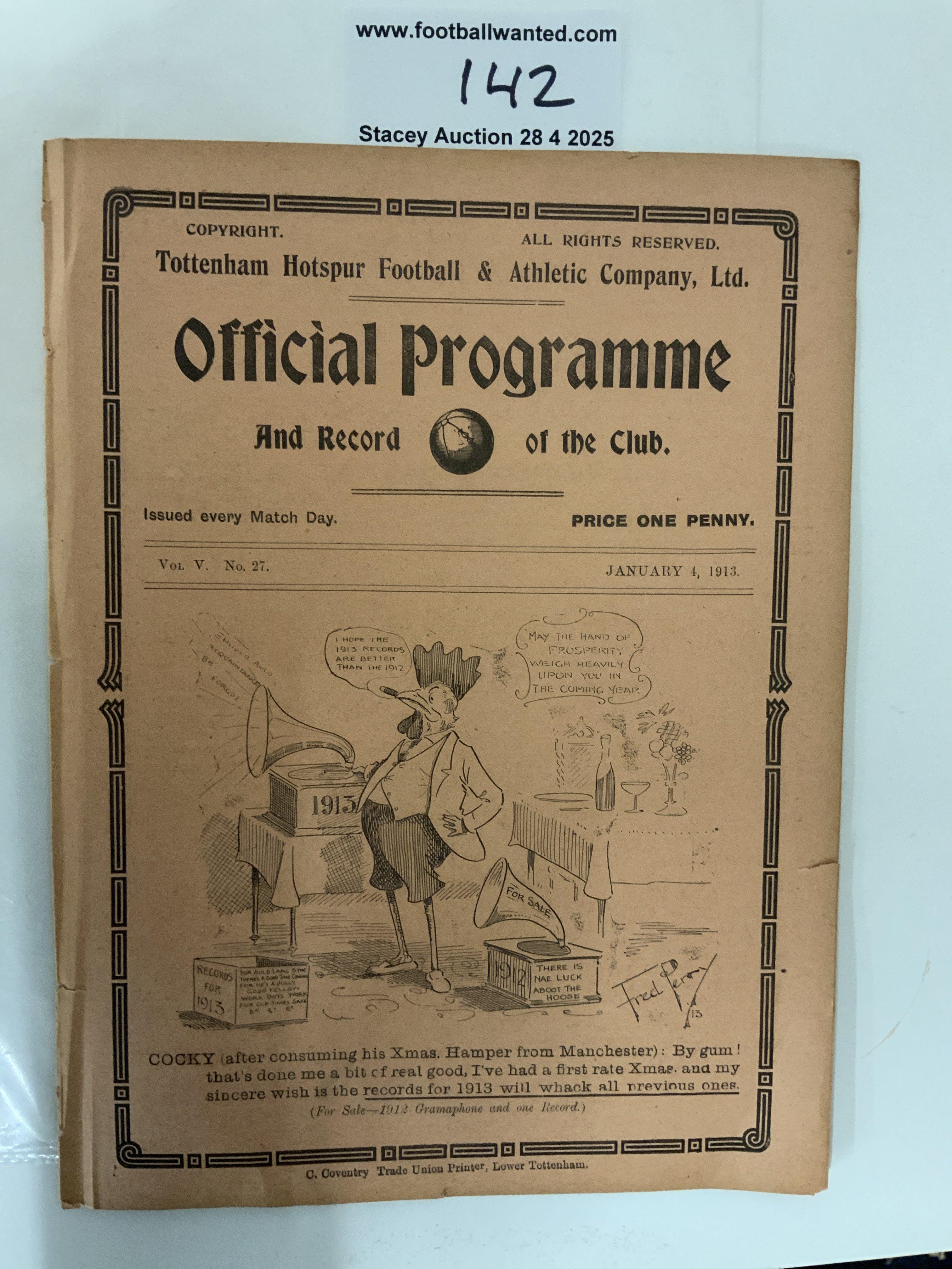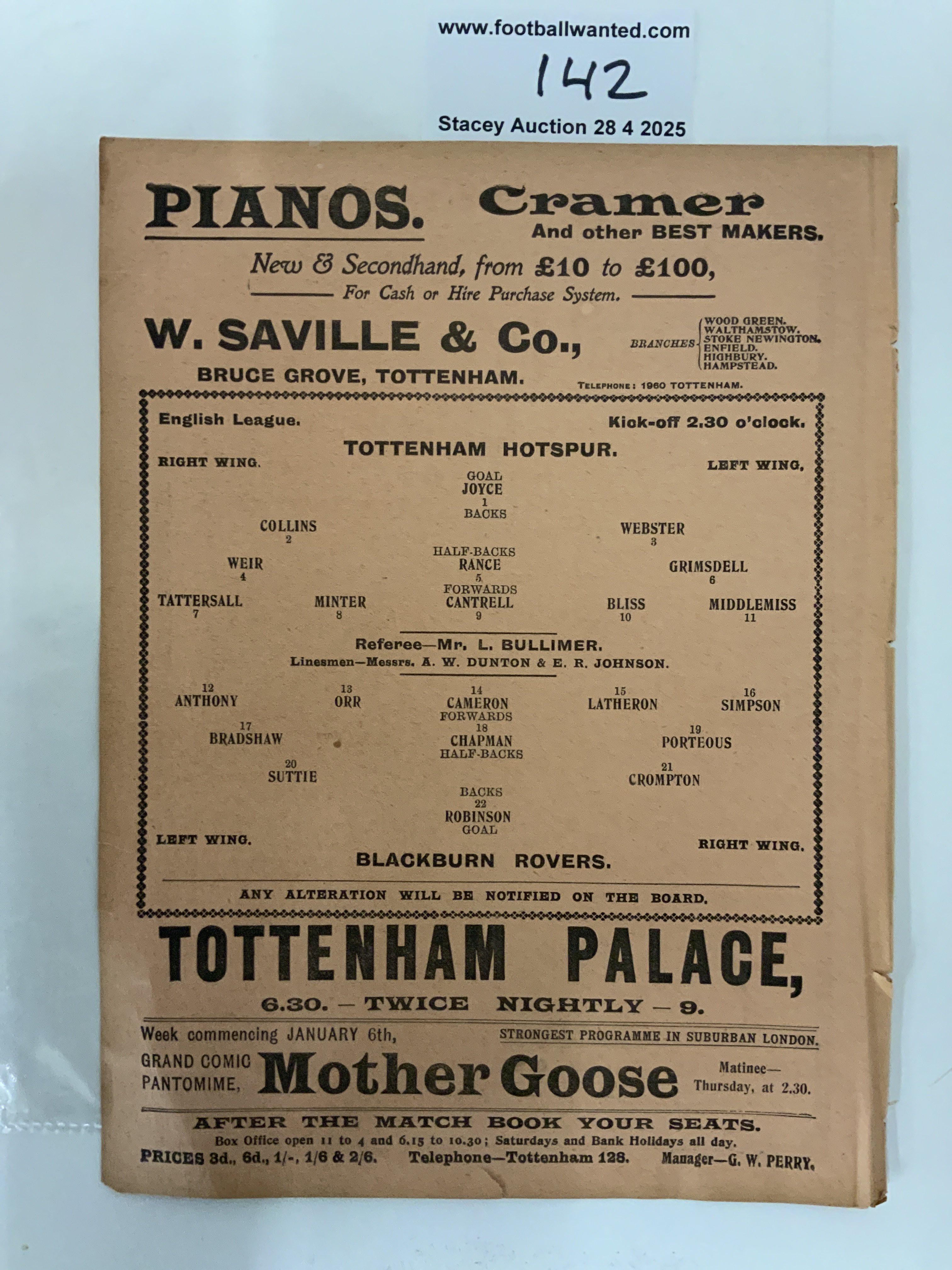 1912 - 1913 Tottenham v Blackburn Rovers Football Programme: First division match dated 4 1 1913. Excellent condition ex bound with covers. No writing.