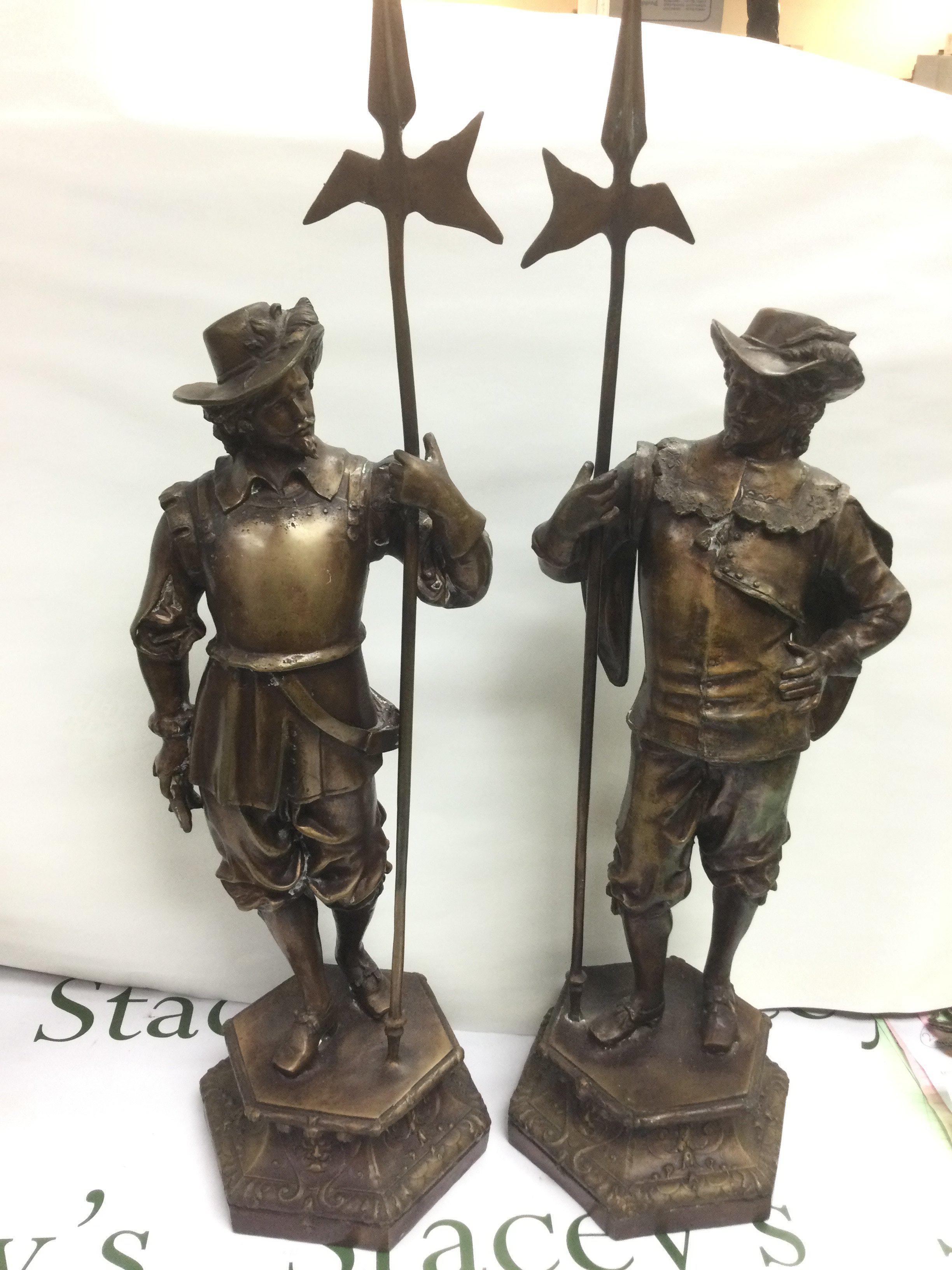 A pair of heavy resin figures of cavaliers holding pikes and raised on hexagonal bases, approx height 66cm. Shipping category D.