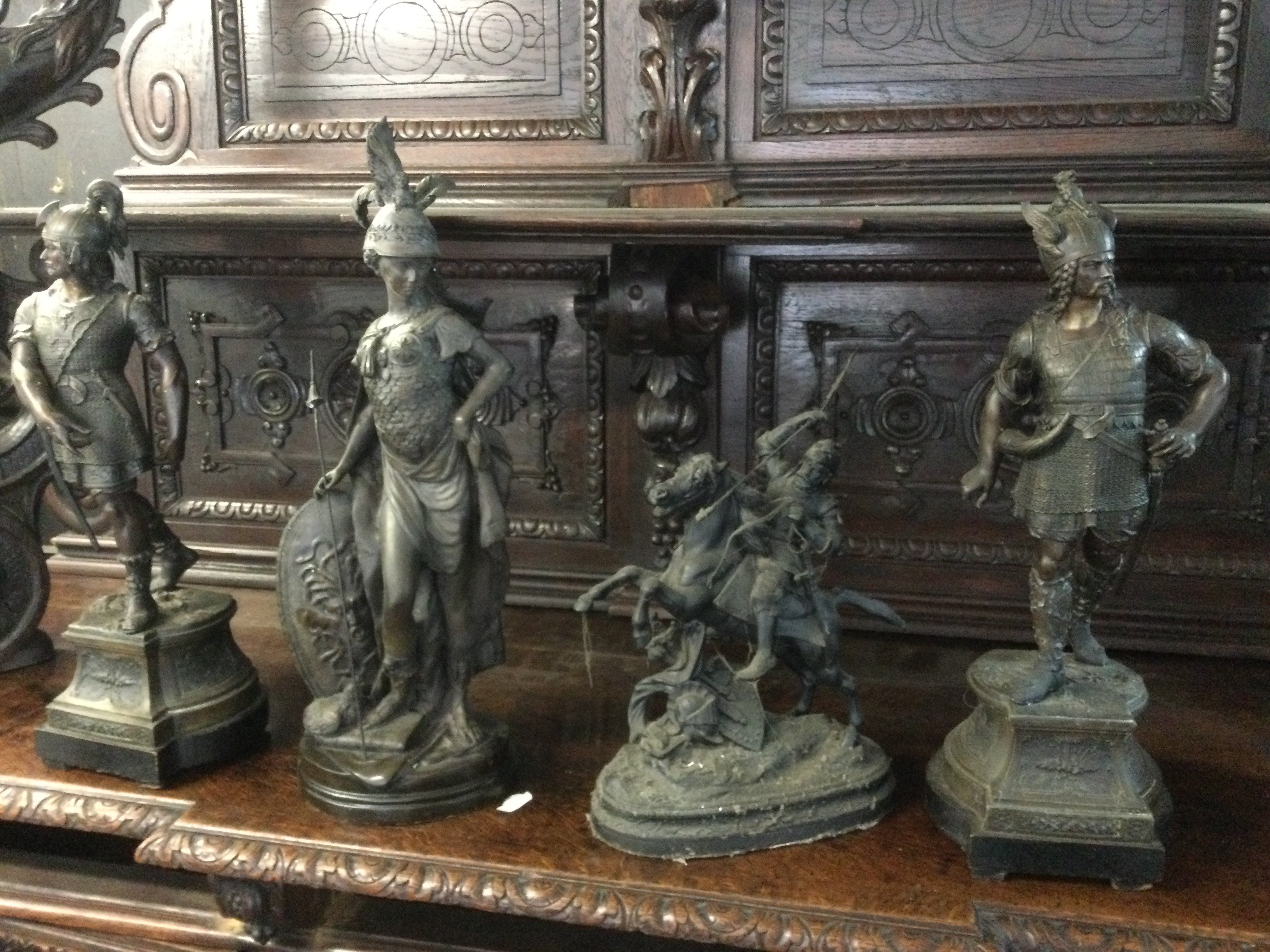 A bronzed figure of a female warrior plus three spelter figures of warriors, largest approx height 61cm. Shipping category D.