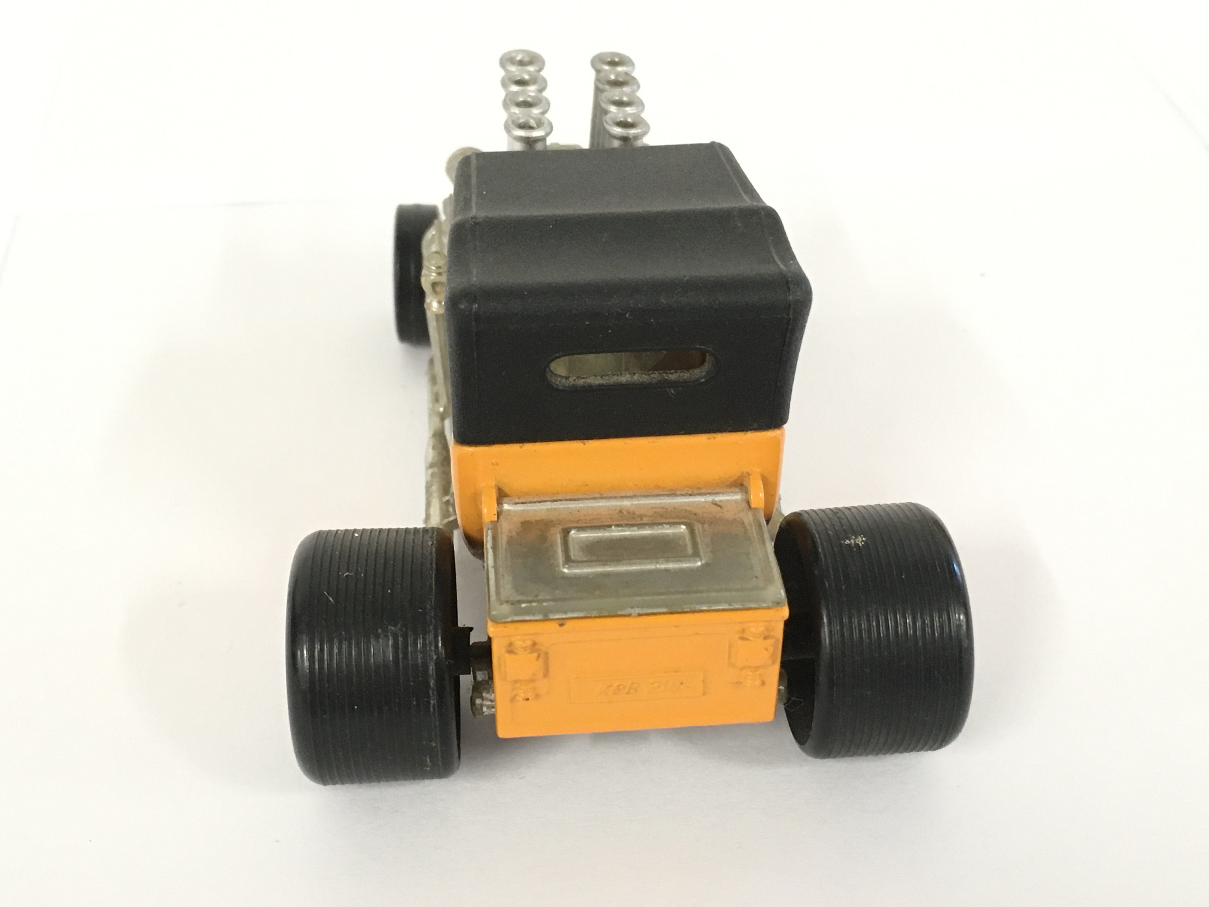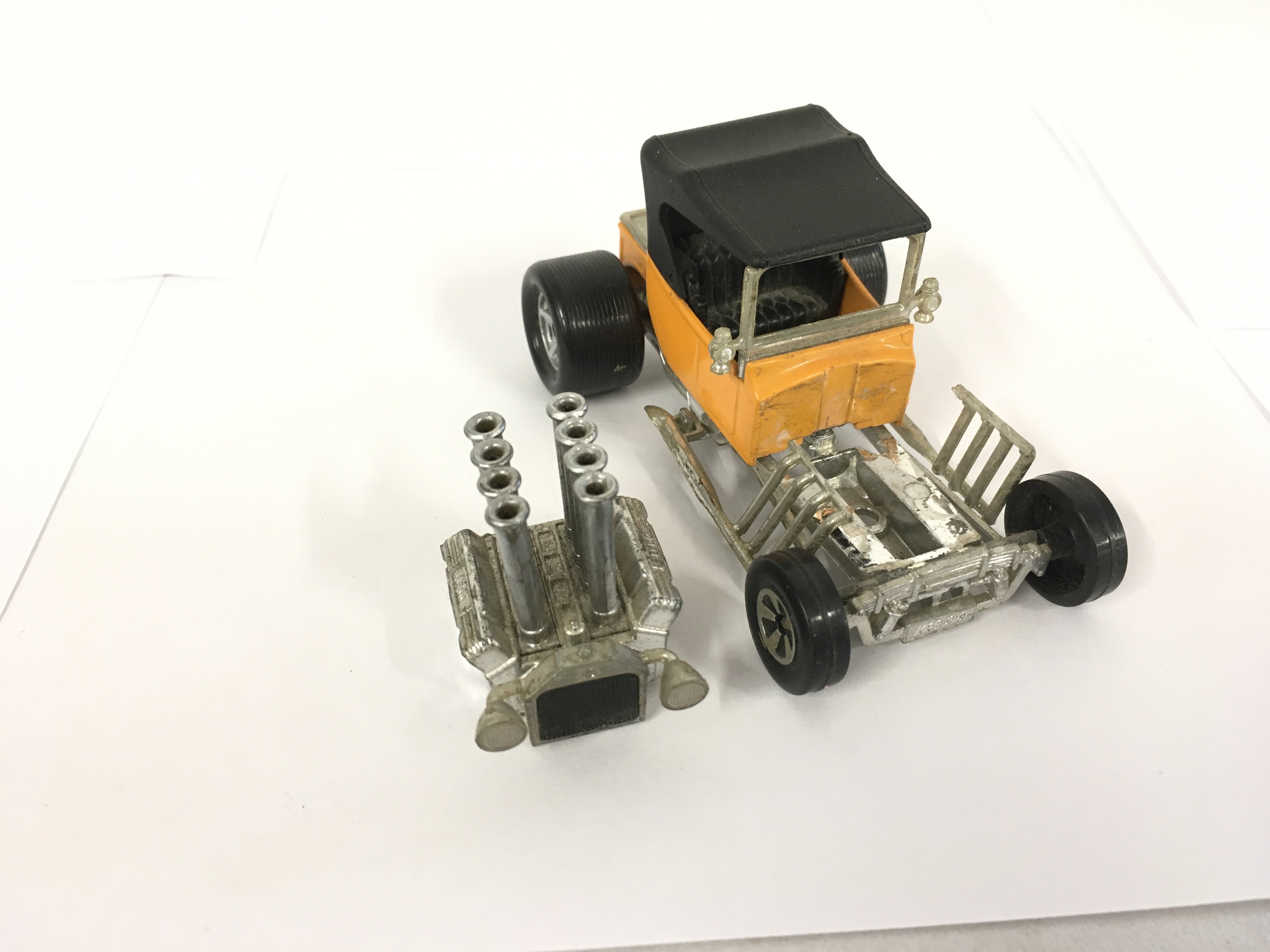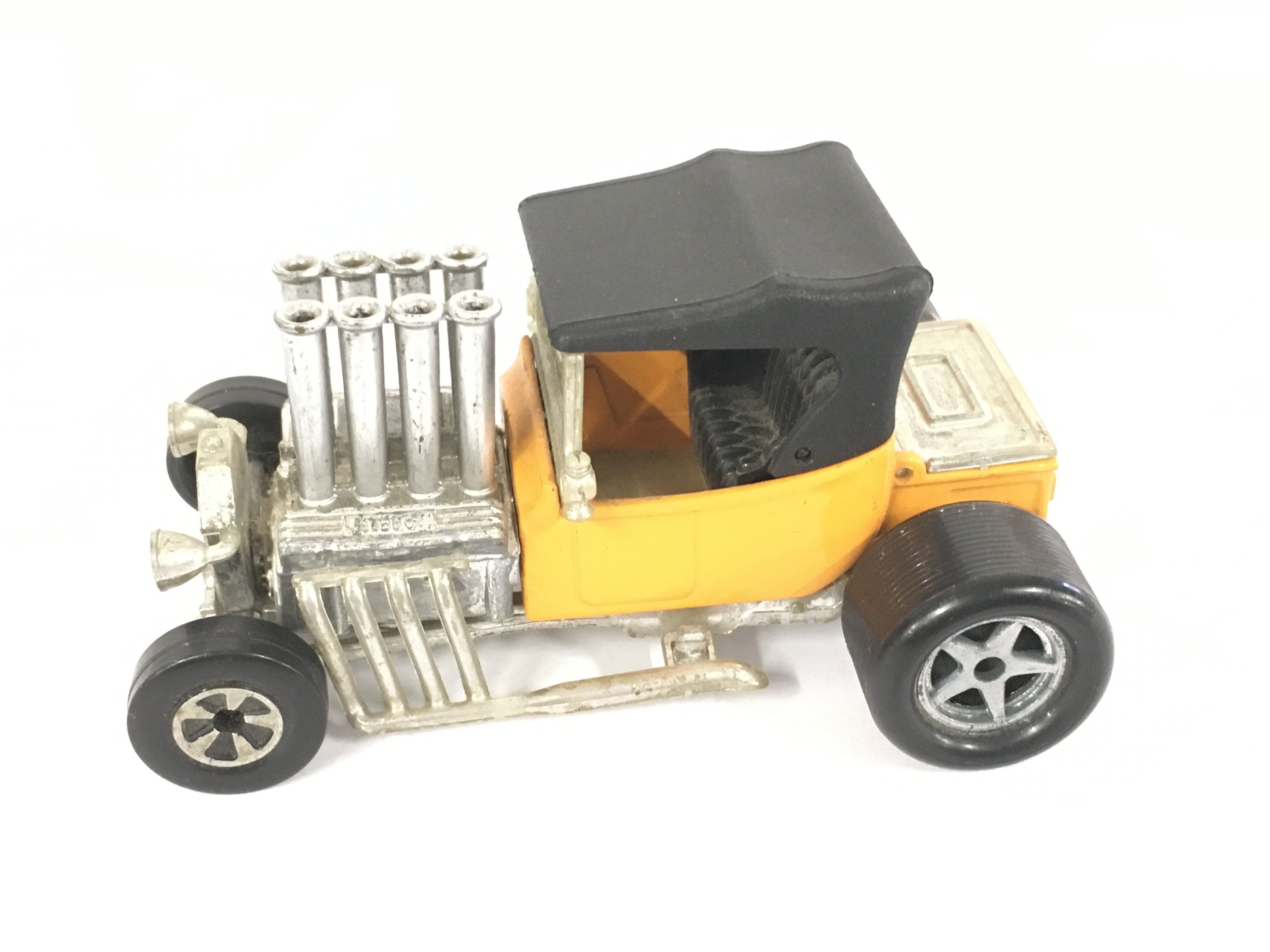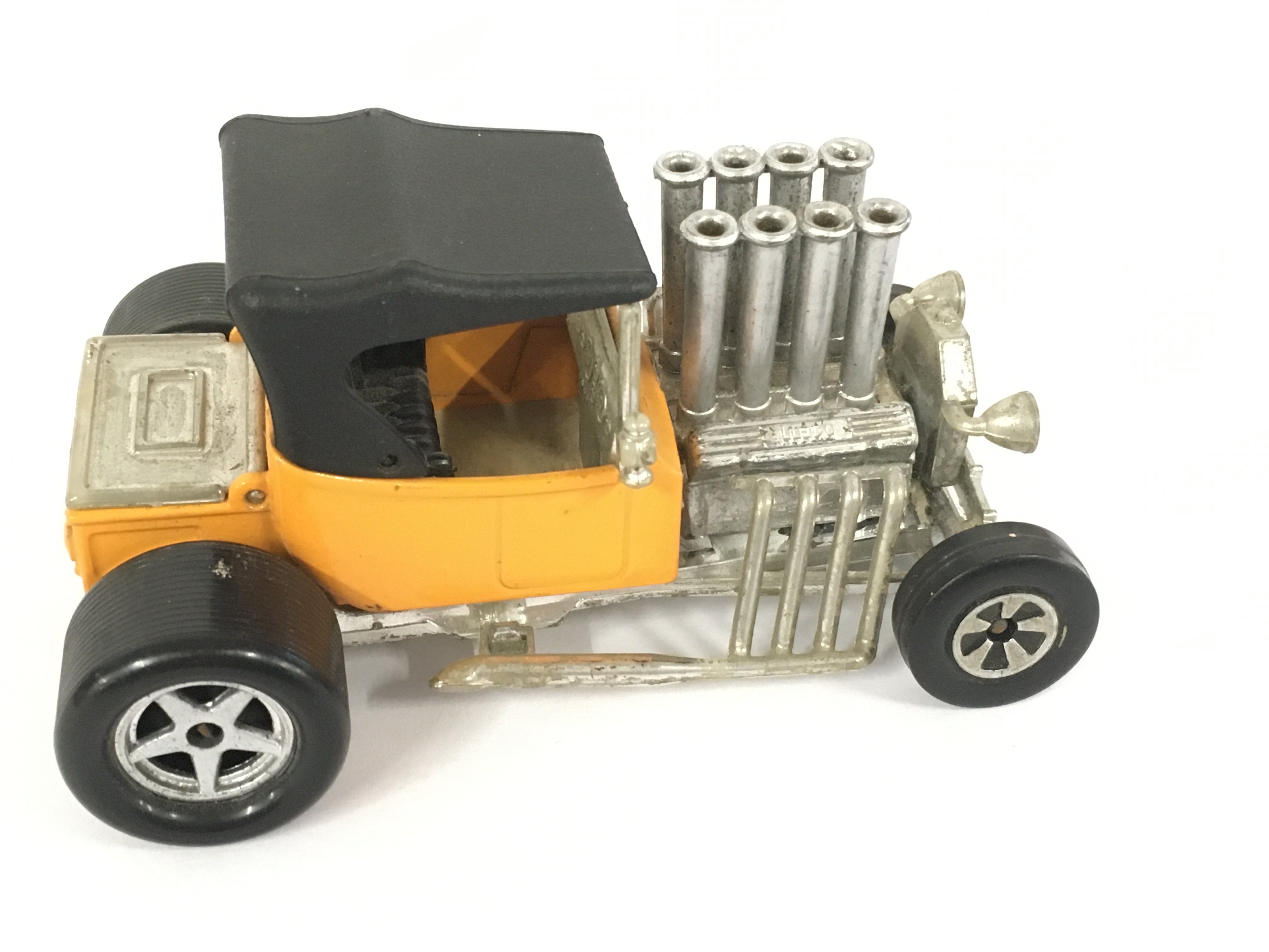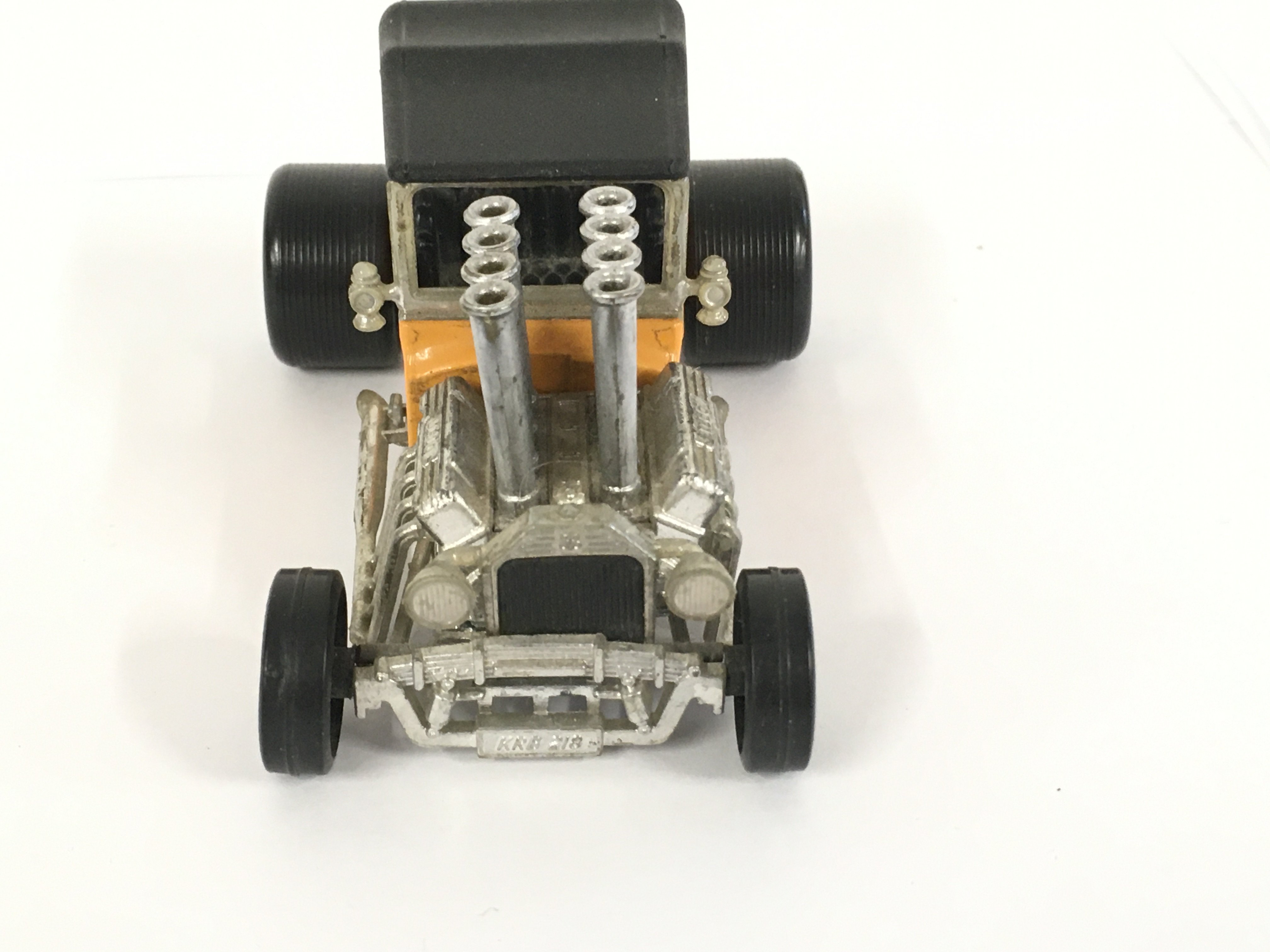 A Matchbox Superkings pre production model T hotrod in orange livery a black roof and no decals.