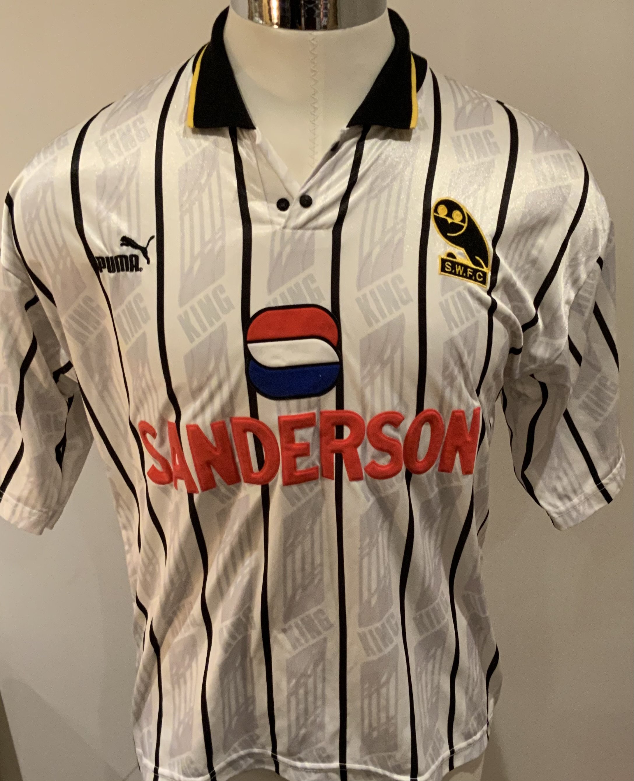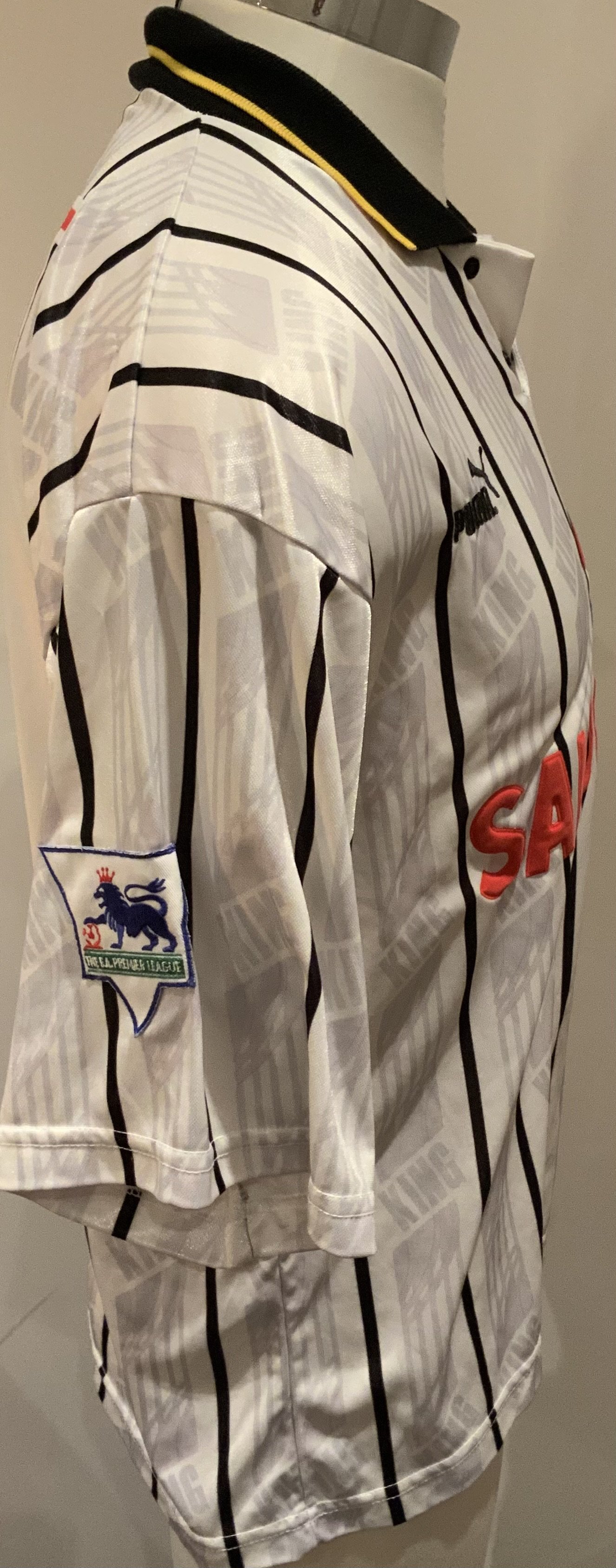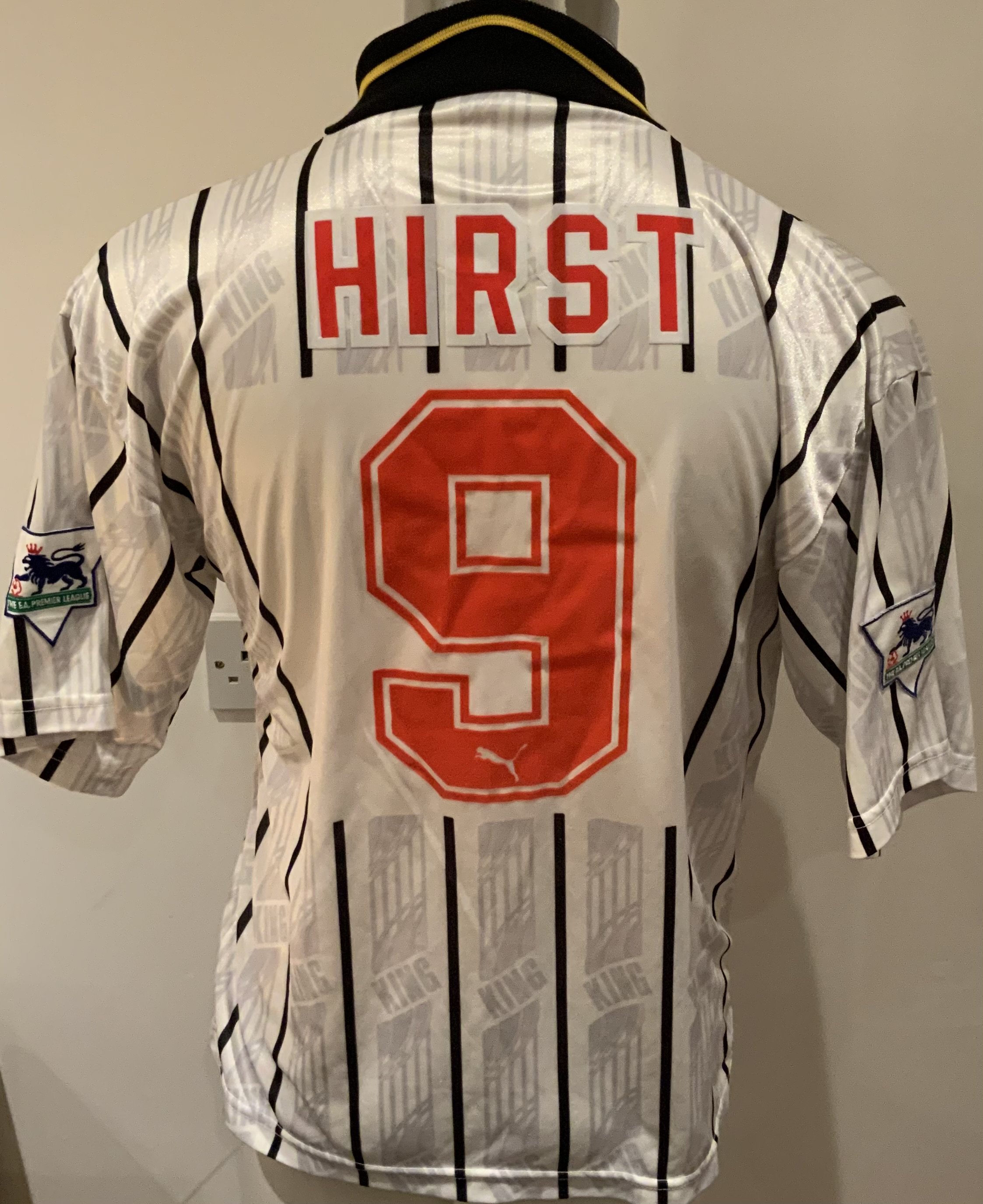 Sheffield Wednesday 1993 - 1994 Match Issued Football Shirt: White with black stripes short sleeve shirt with Premier League badging to sleeves. Hirst 9 to rear. Rare fourth shirt from the season