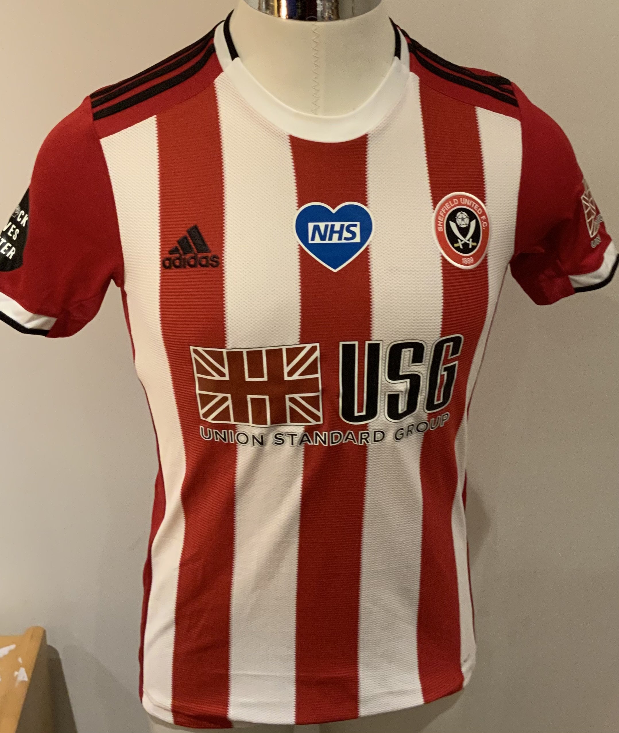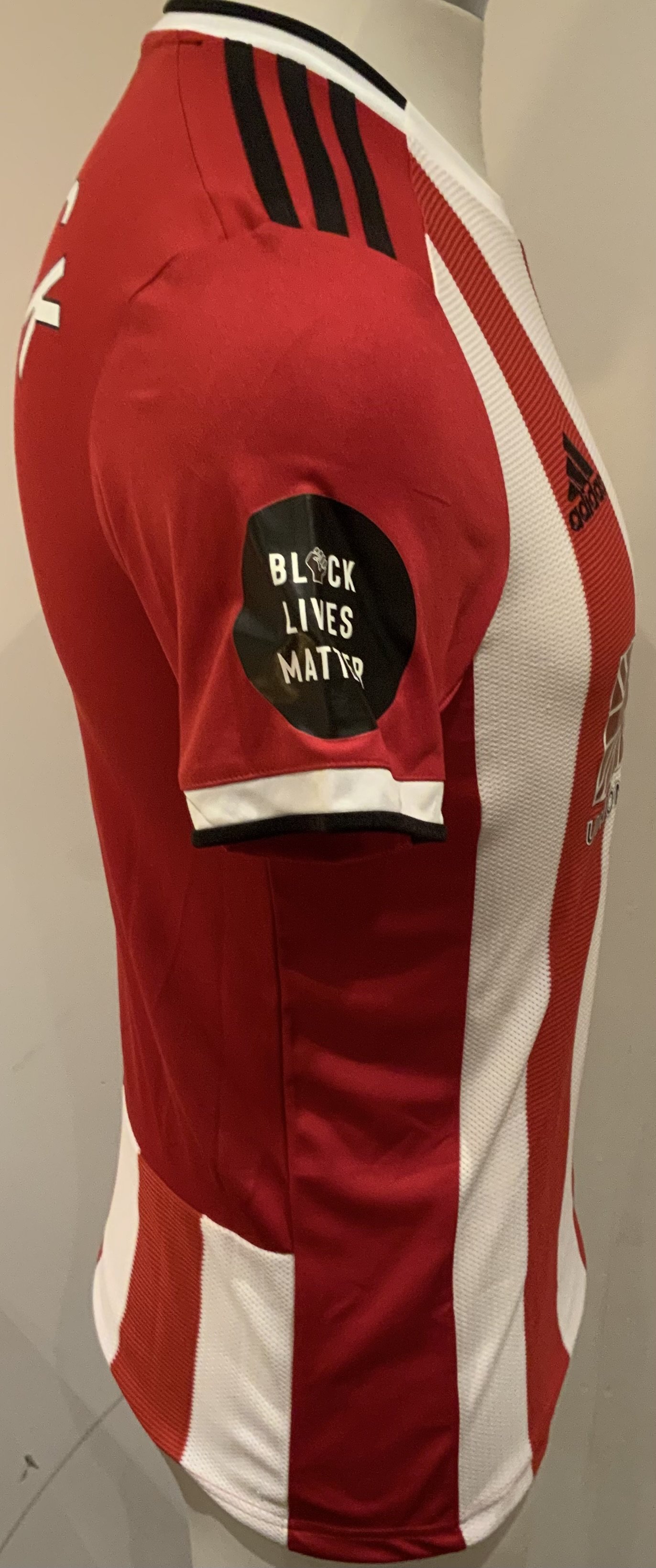 Sheffield United 2020 - 2021 Match Worn Football Shirt: Red and white short sleeve shirt with Black Lives badge to sleeve. Baldock 2 to rear. Worn v Tottenham on 2 May 2021.