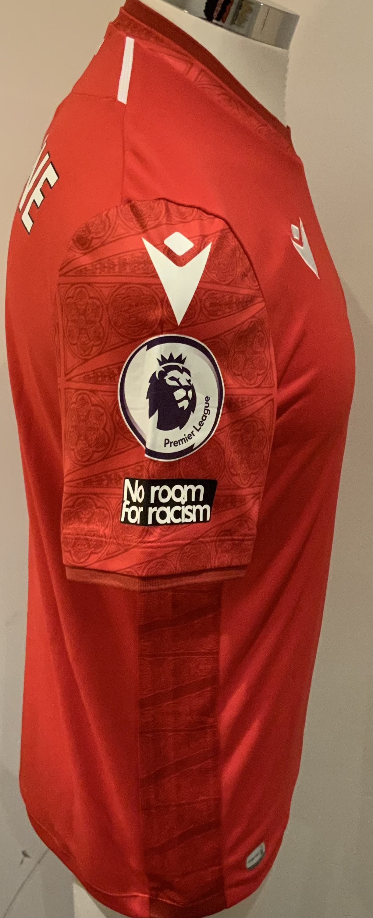 Nottingham Forest 2022 - 2023 Match Issued Football Shirt: Red short sleeve shirt with Premier League badge to sleeves. Biancone 2 to rear. Issued v Tottenham on 28 August 2022
