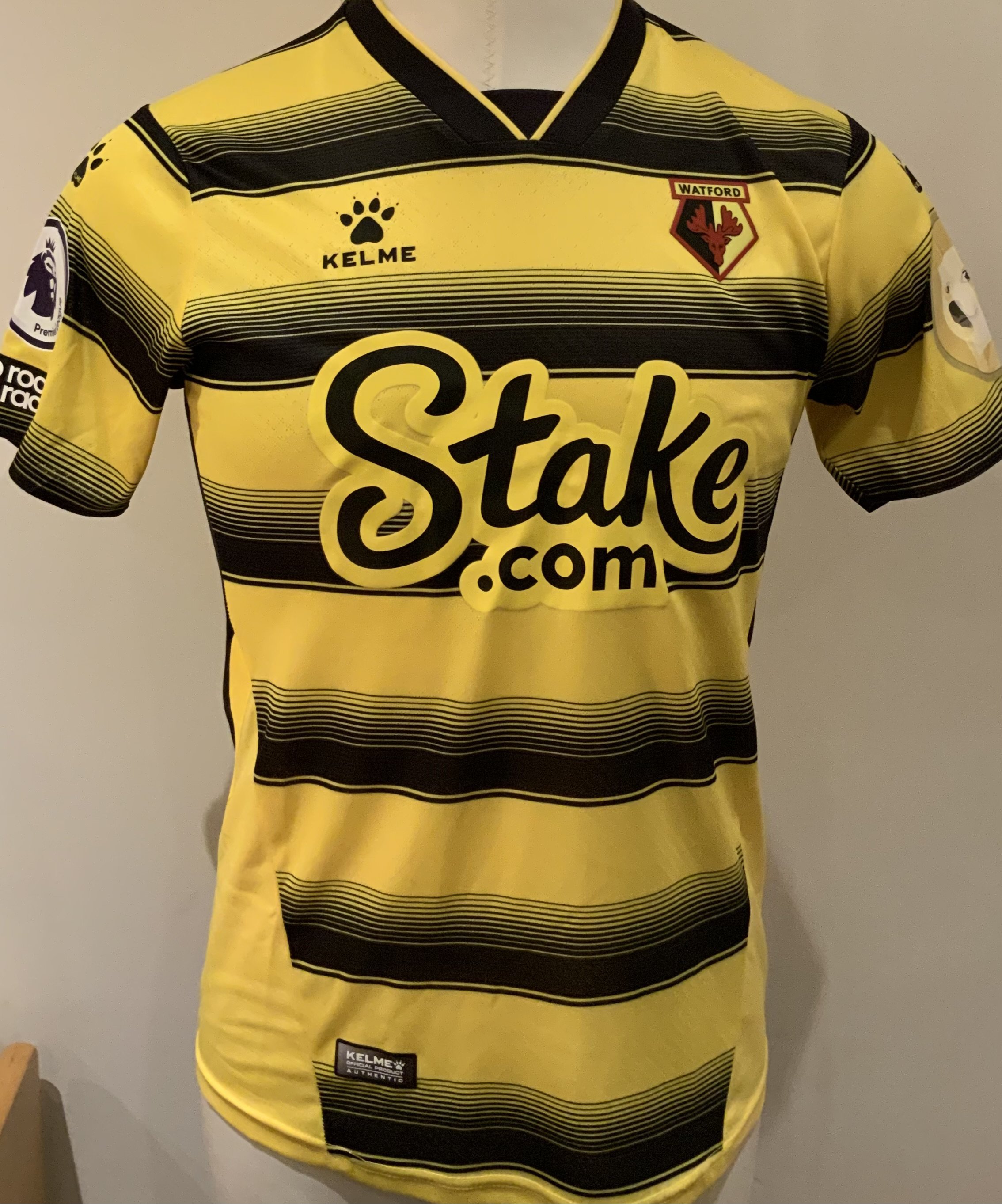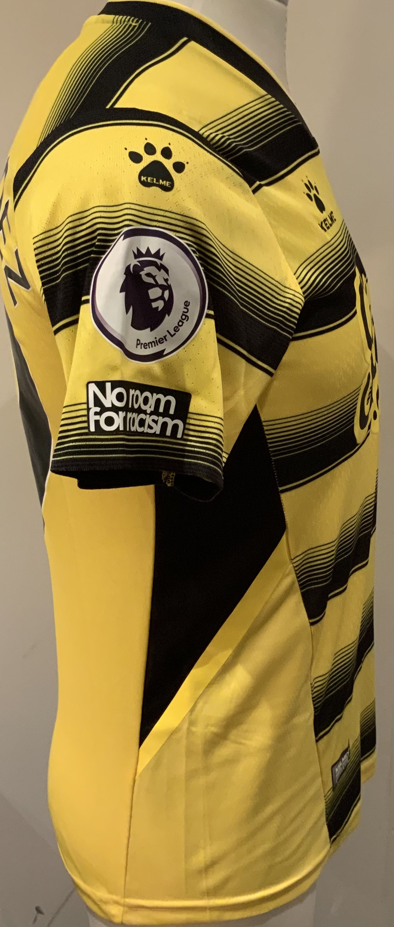 Watford 2021 - 2022 Match Worn Football Shirt: Black and yellow short sleeve shirt with Premier League badge to sleeves. C Hernandez 29 to rear. Worn v Tottenham on 1 January 2022 when player was a second half substitute.