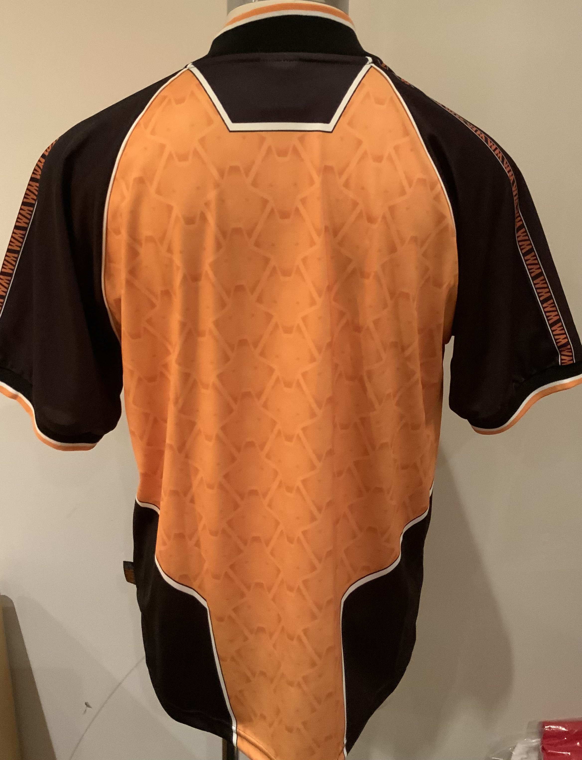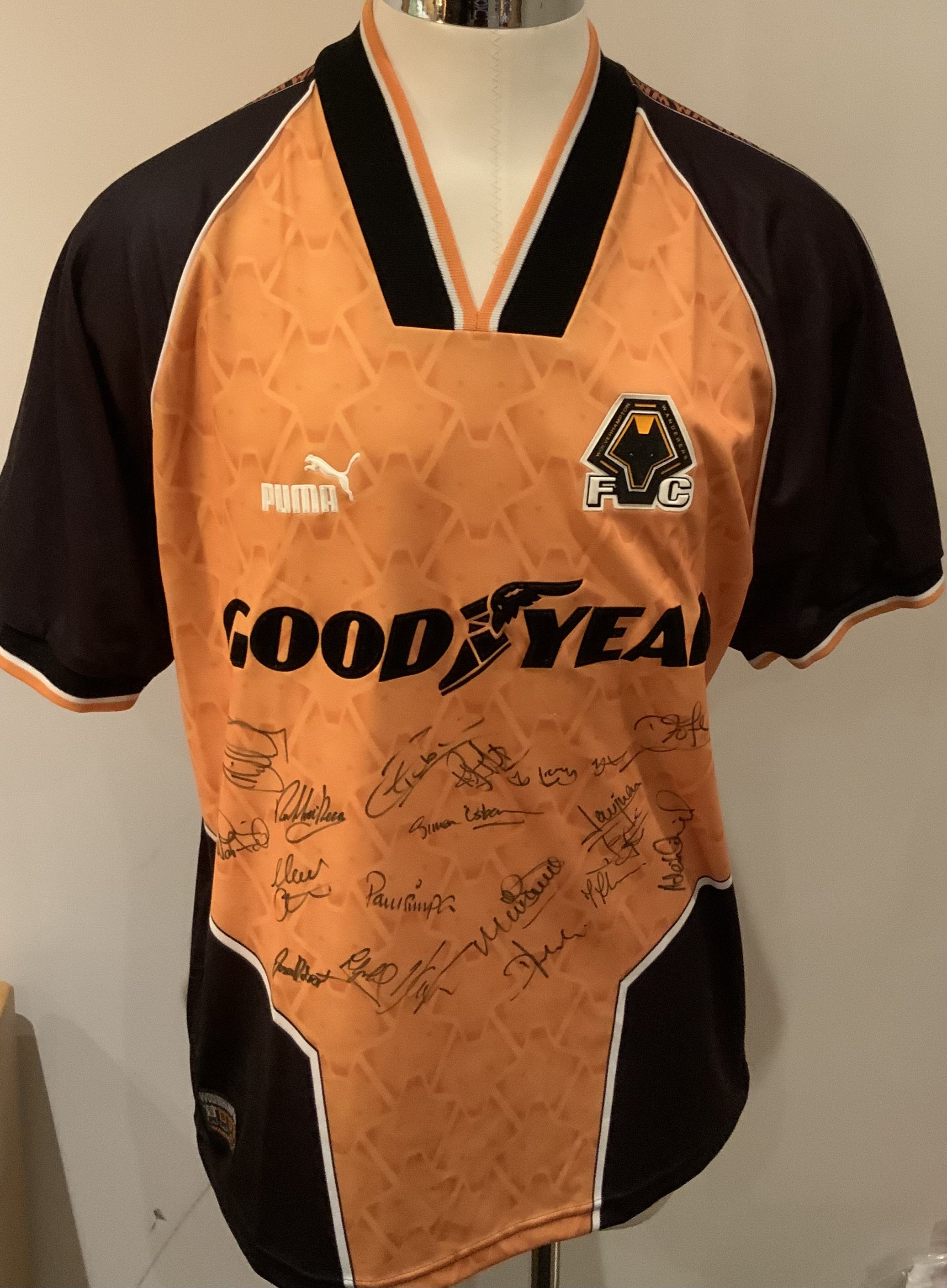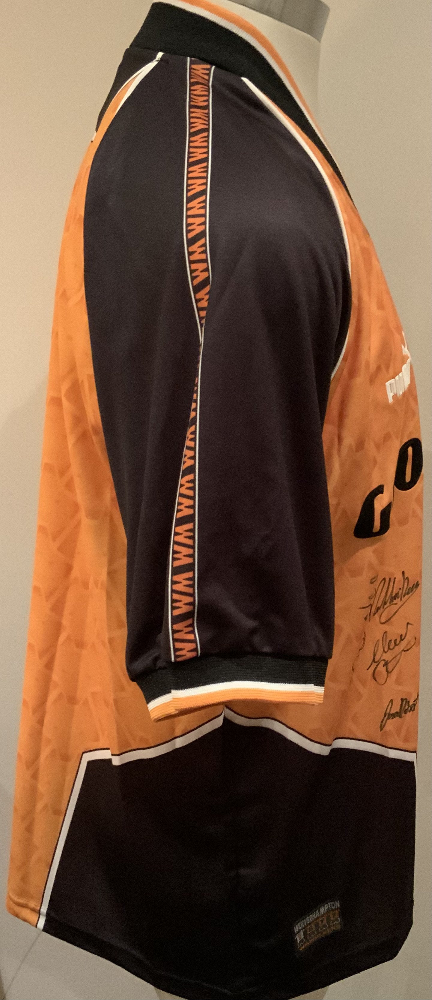 Wolves 1997 - 1998 Squad Signed Football Shirt: Black and gold large short sleeve shirt which has 18 player signatures to the front of the shirt.