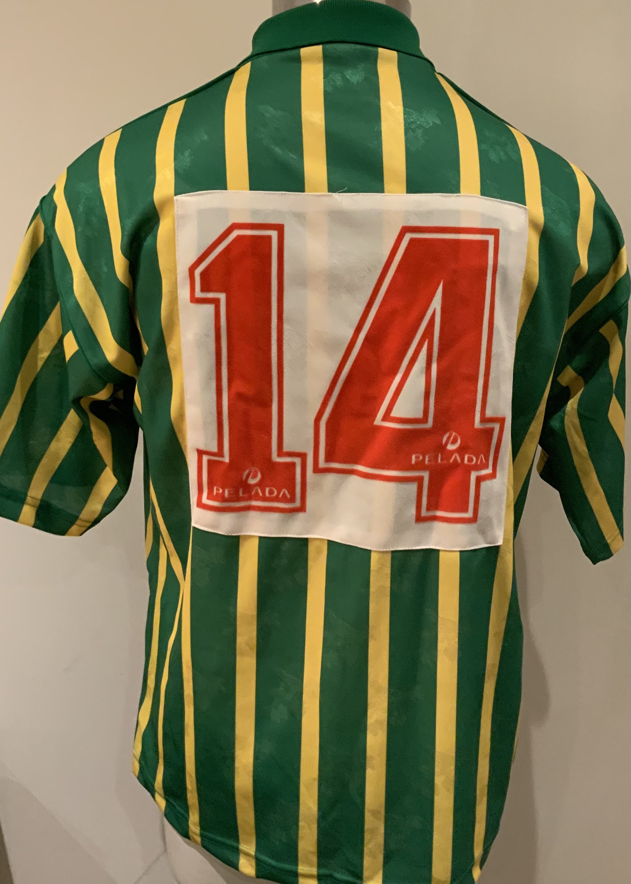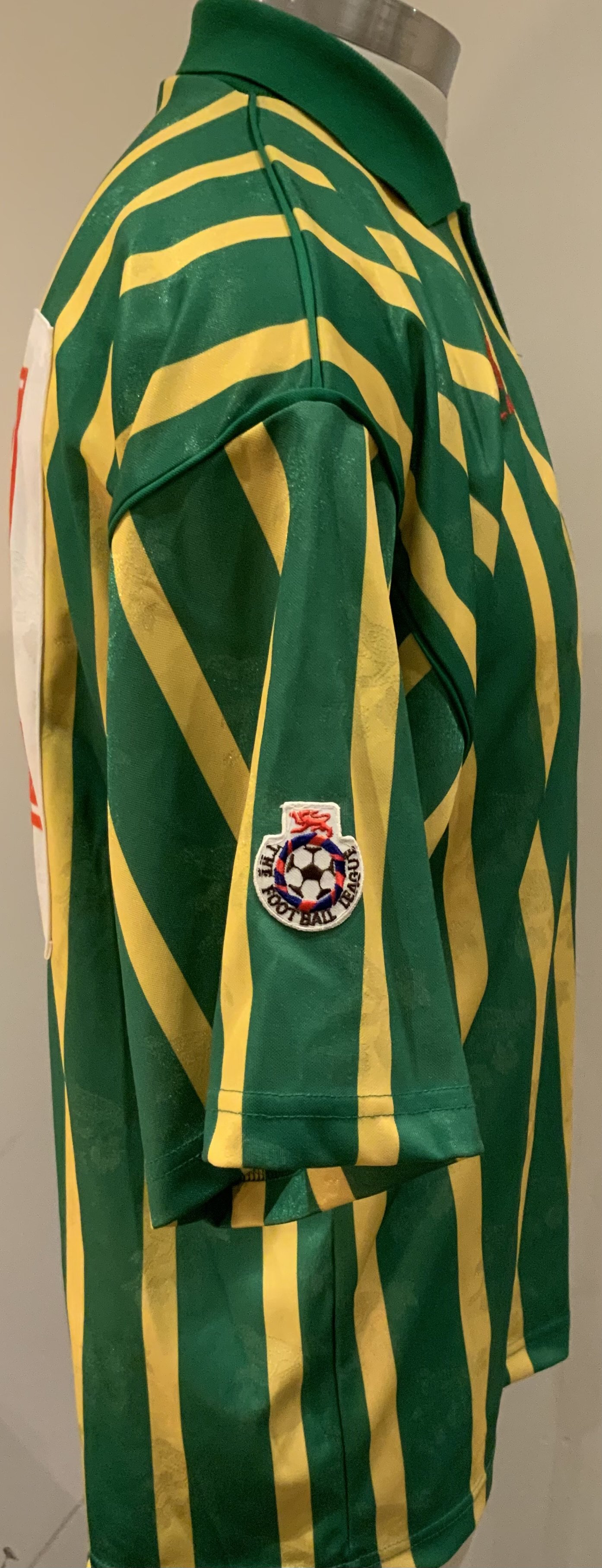 West Brom 1993 - 1994 Match Worn Football Shirt: Green and yellow short sleeve shirt with Football League badges to sleeves. Number 14 to rear.