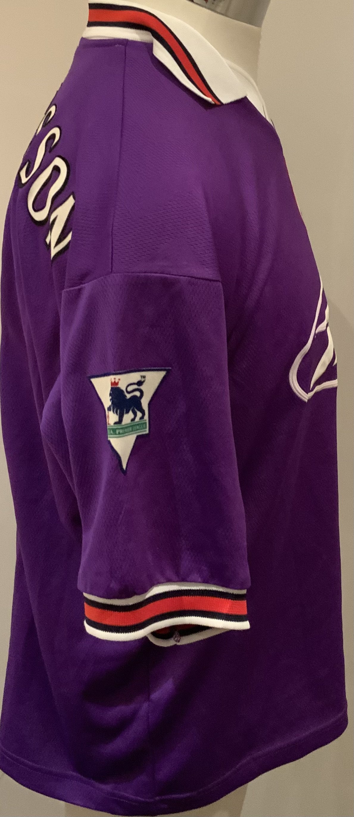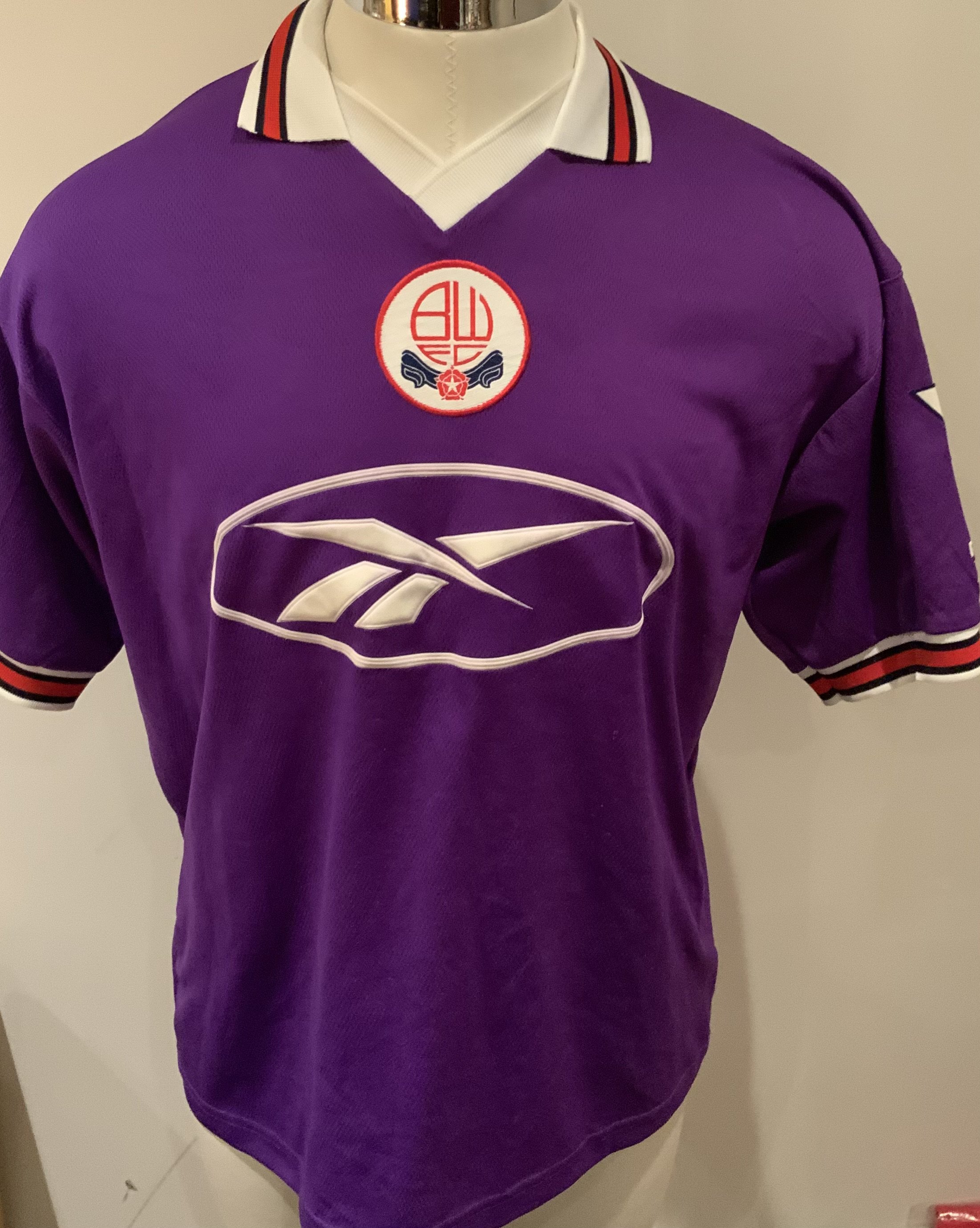 Bolton Wanderers 1997 - 1998 Match Worn Football Shirt: Purple short sleeve shirt with Premier League badges to sleeves. Gunnlaugsson 30 to rear.