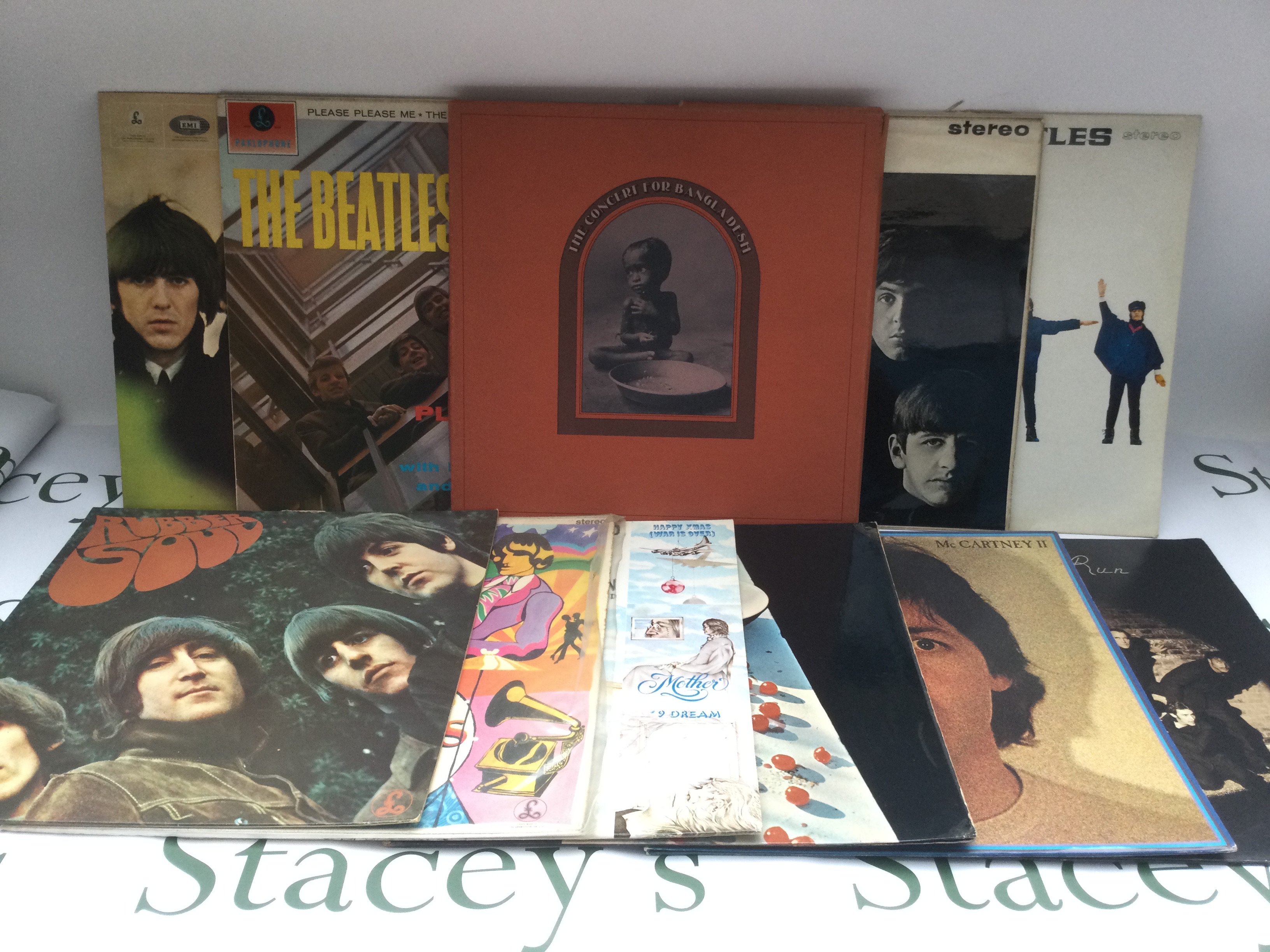 Eleven Beatles and solo LPs comprising 'Please Please Me', 'McCartney', 'The Concert For Bangladesh' and others. Please note all Beatles LPs in this lot are on the later black and silver labels.