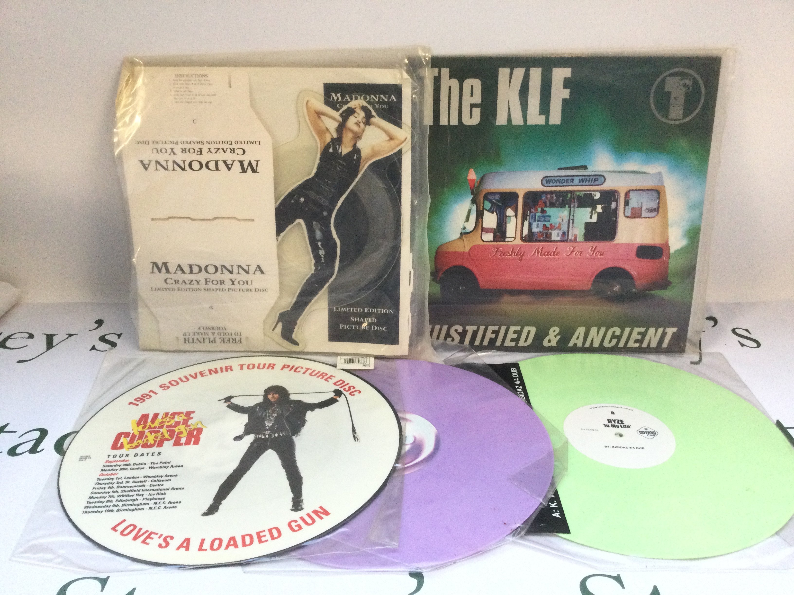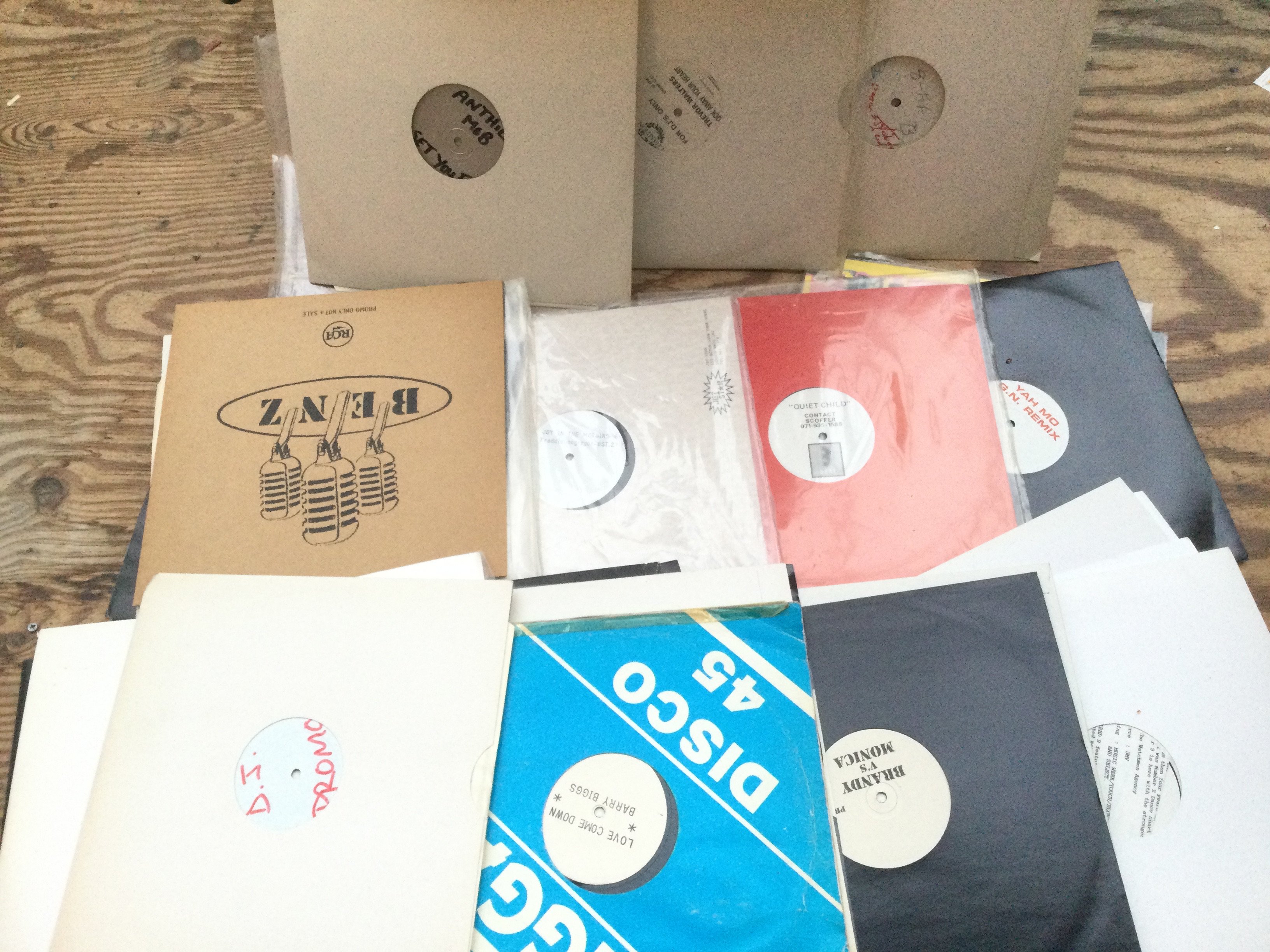 A bag of white label 12" singles, picture discs and coloured vinyl.
