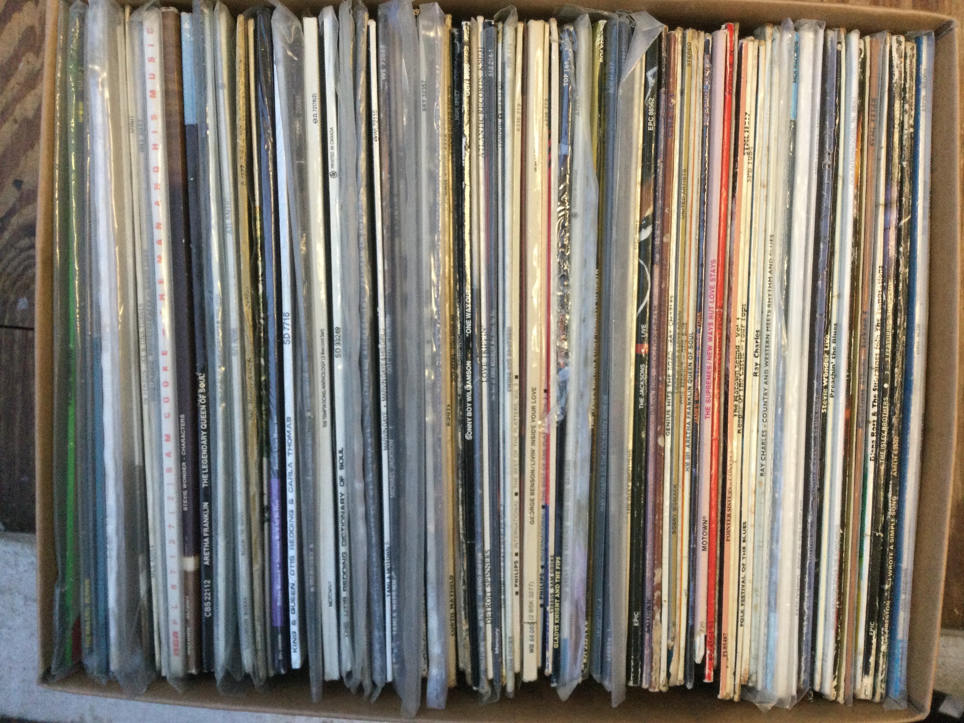 A box of soul, funk and reggae LPs by various artists including James Brown, Otis Redding, The Wailers and many more.