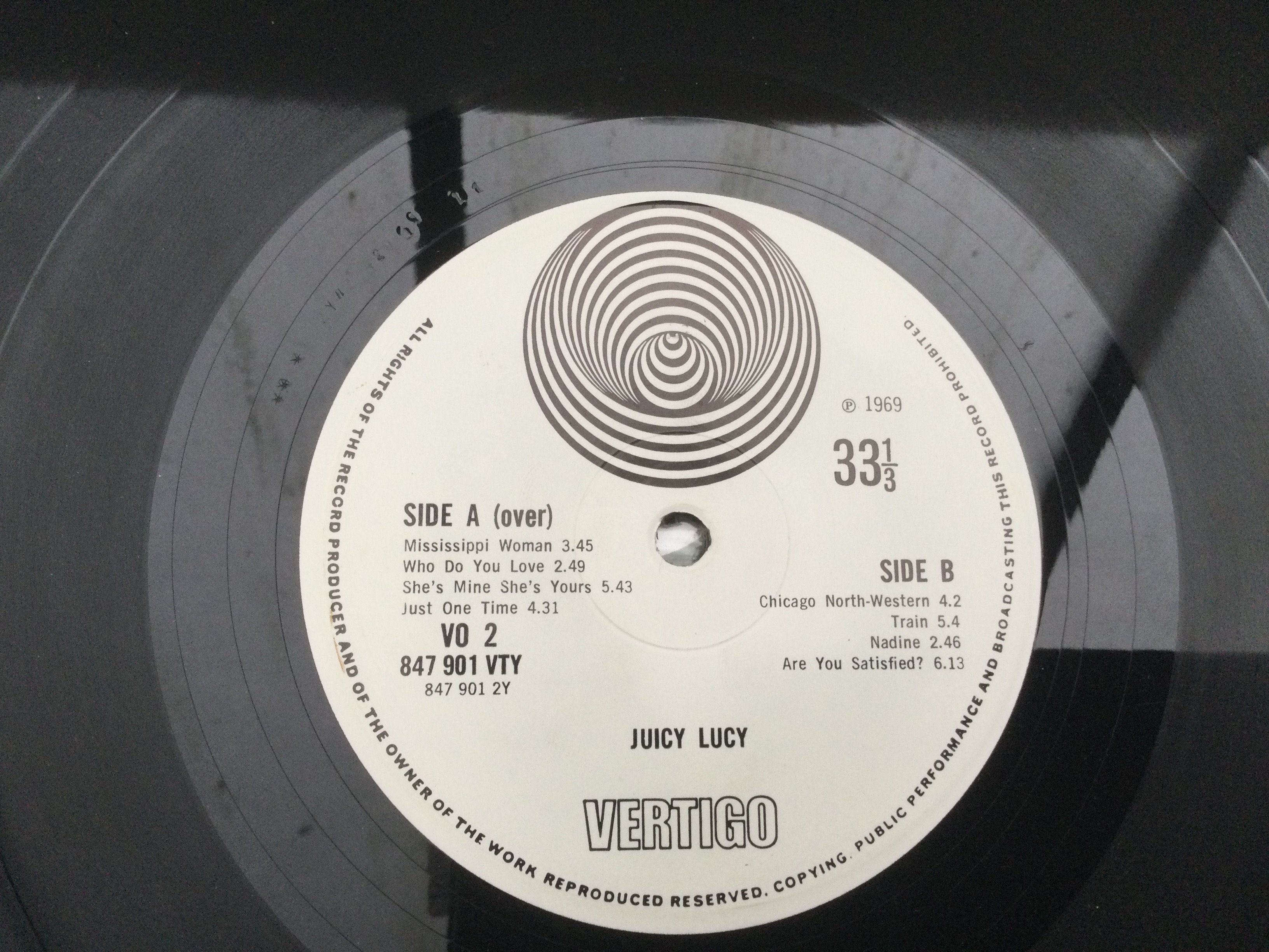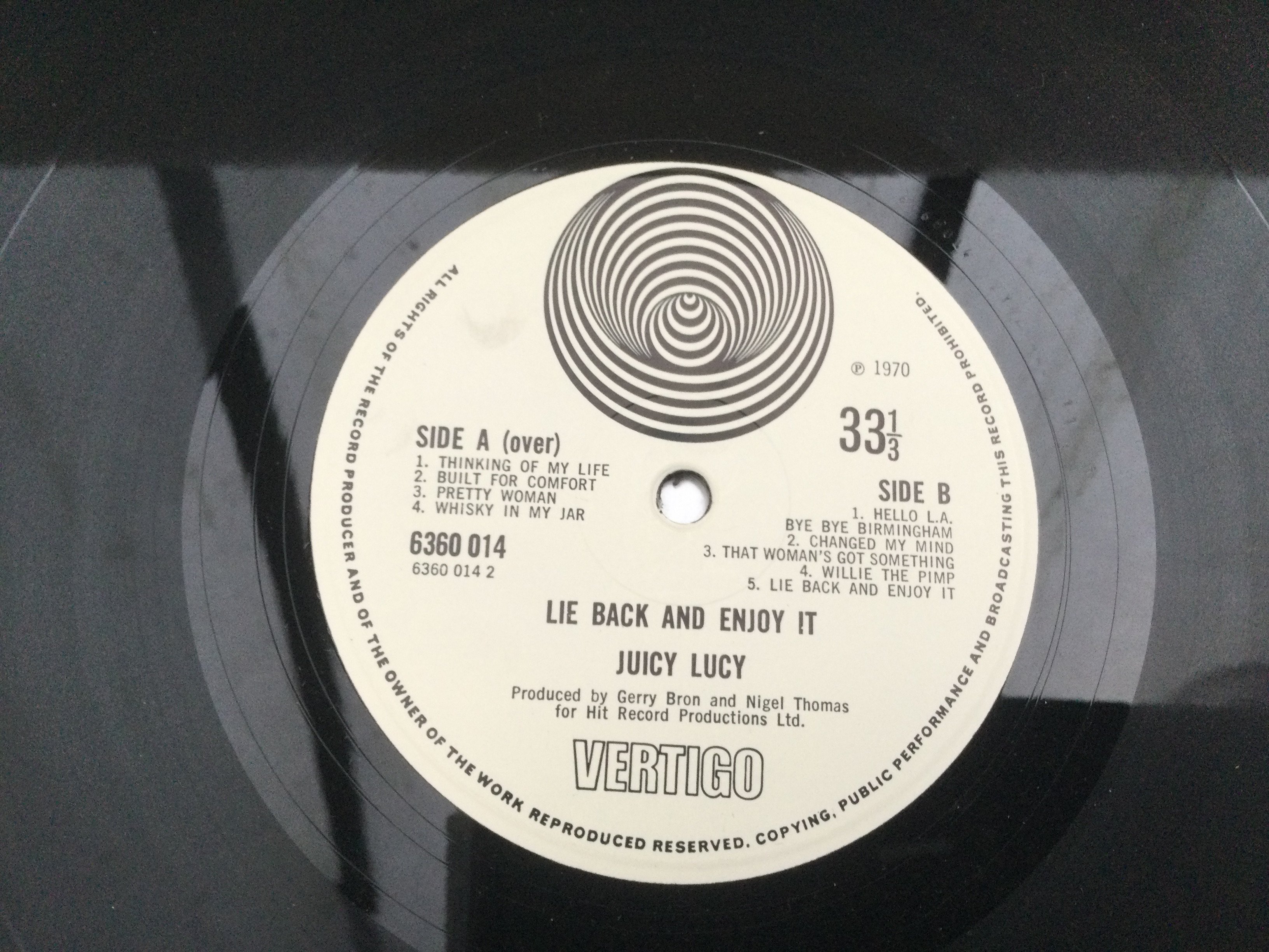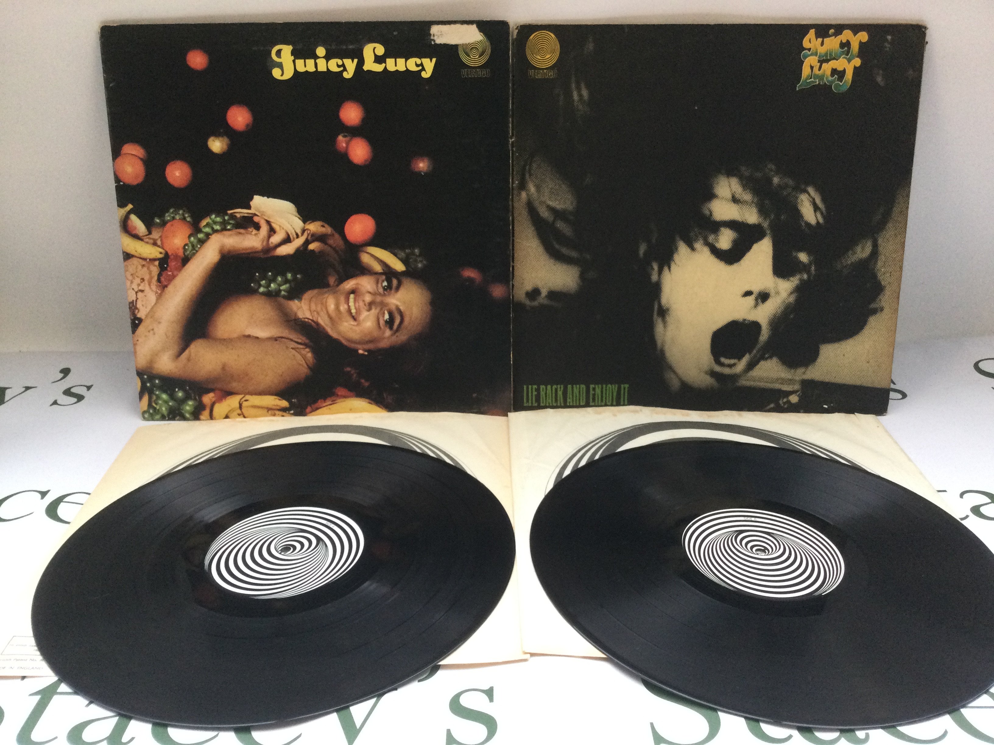 Two early UK pressings of Juicy Lucy LPs comprising the self titled LP and 'Lie Back And Enjoy It'. One feelable scratch on side A of 'Juicy Lucy'.