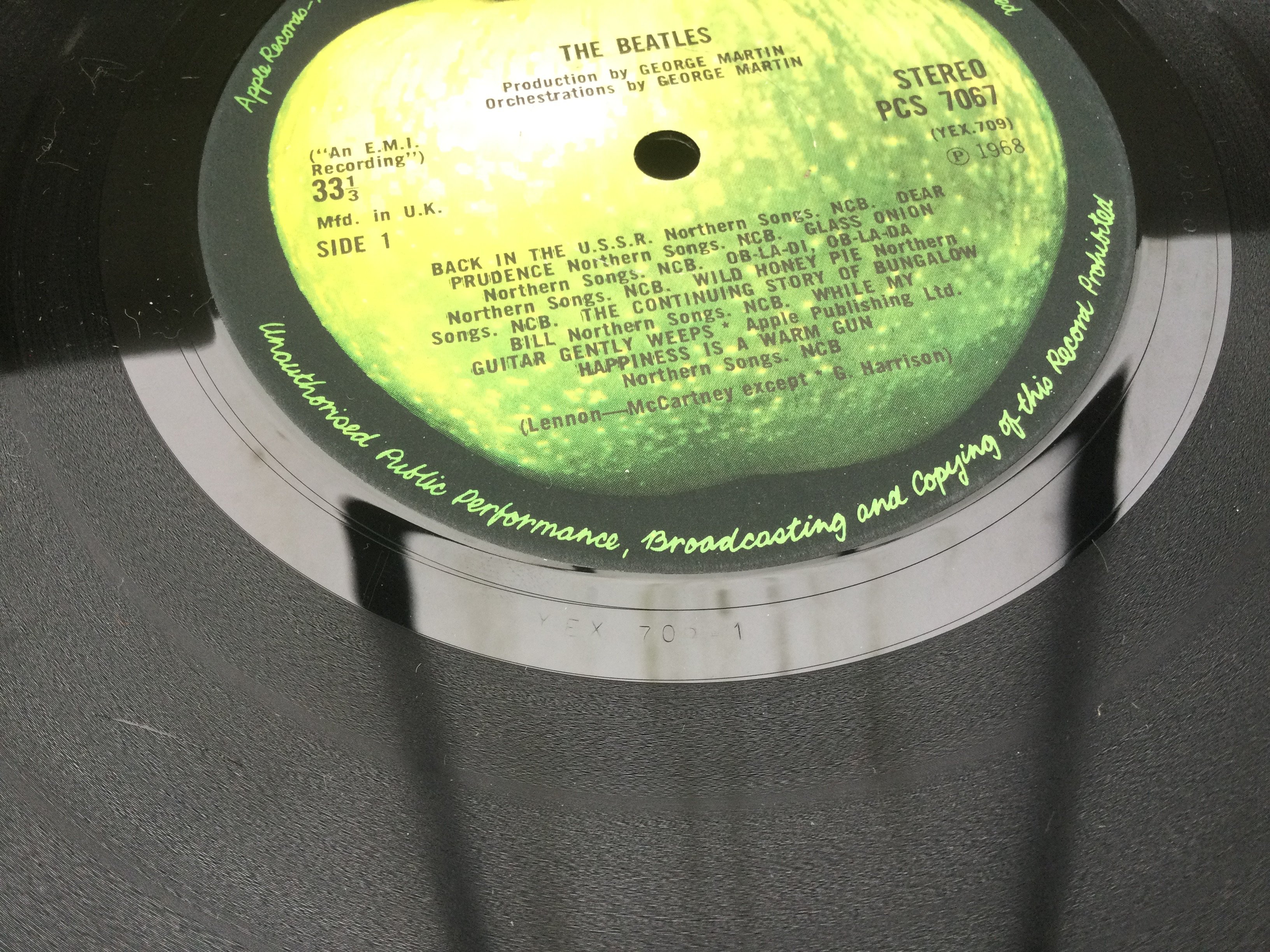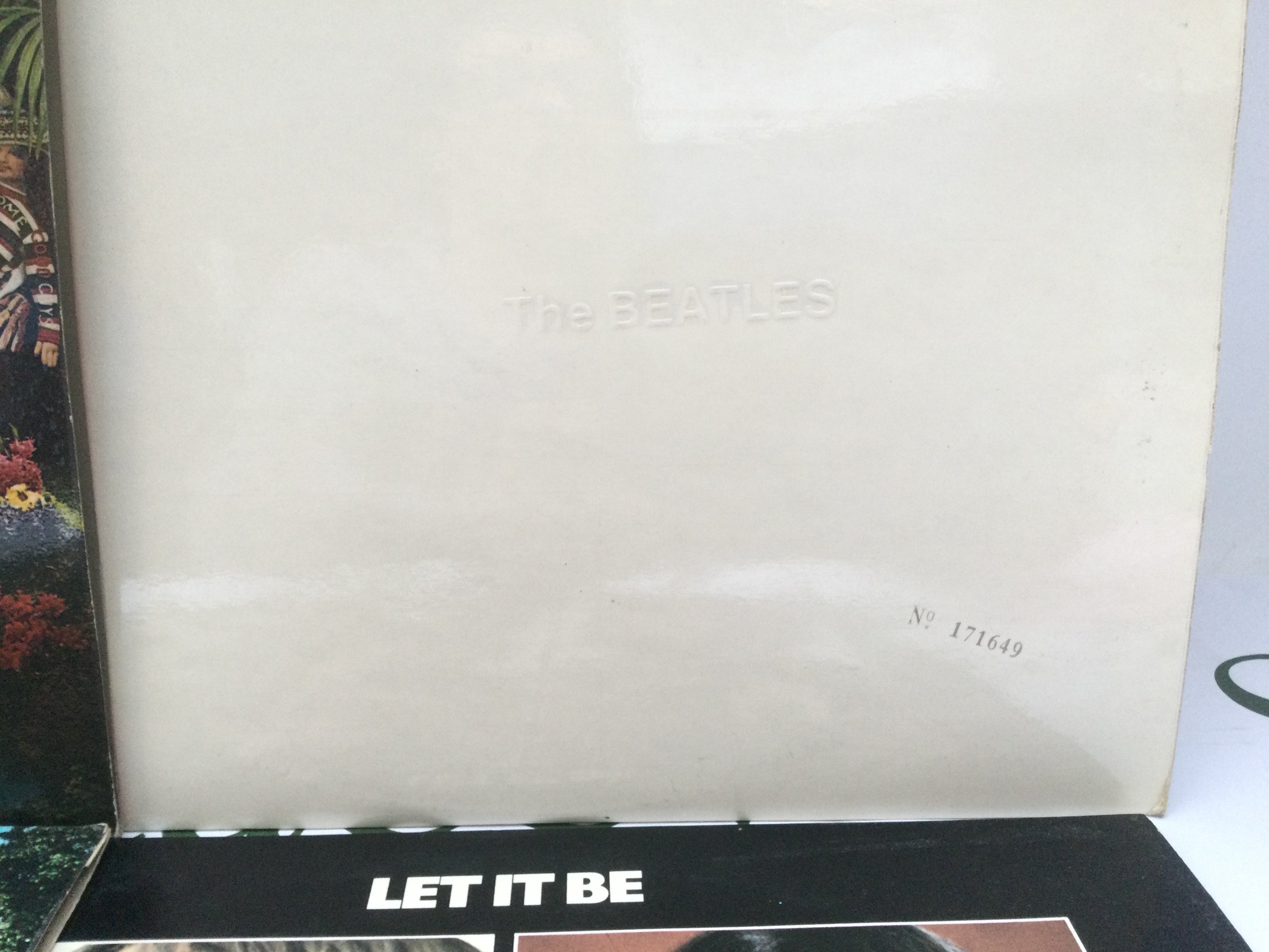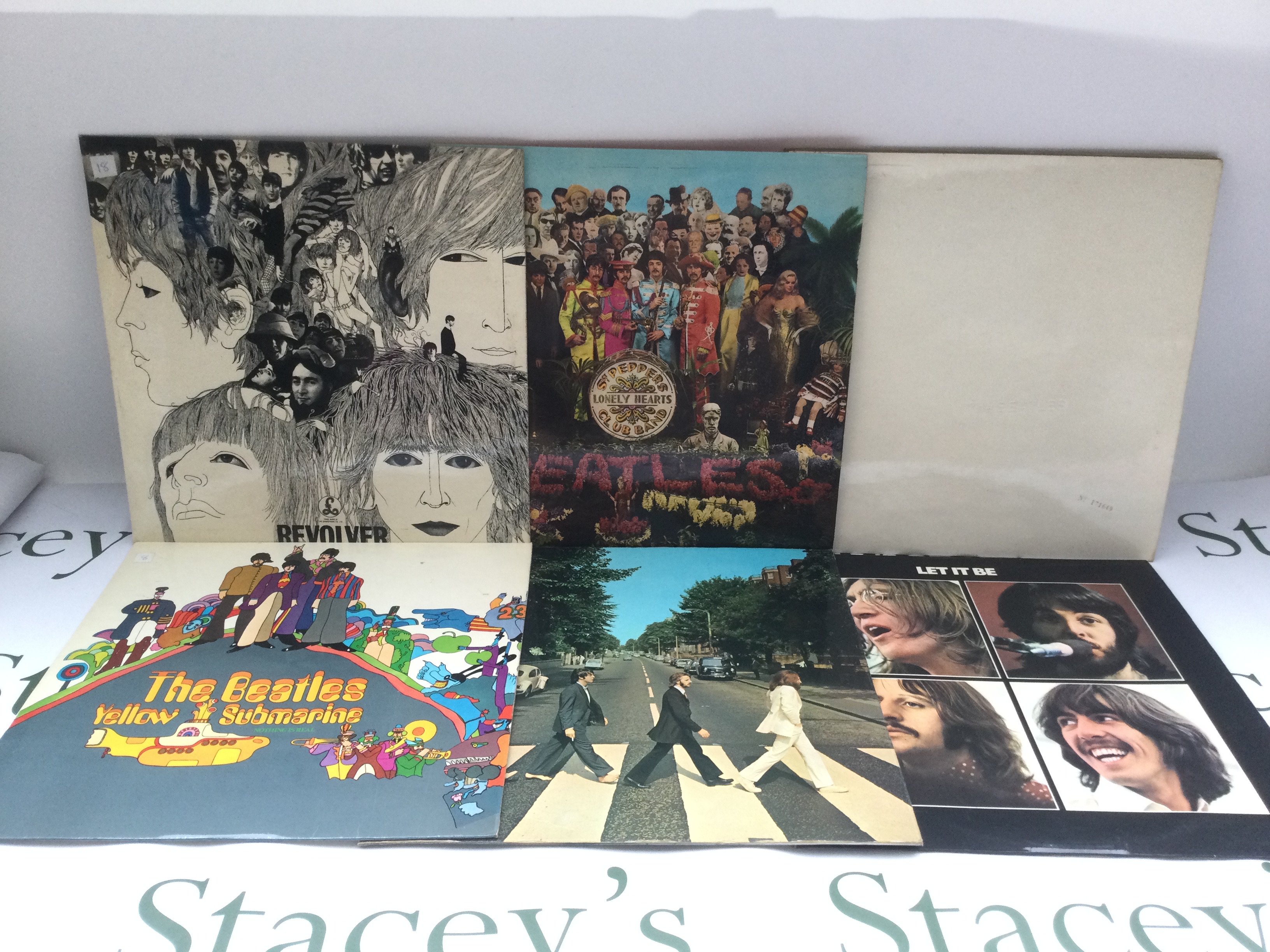 Six Beatles LPs comprising reissues and earlier pressings including a 1970s side loading numbered 'White Album', 'Abbey Road', 'Yellow Submarine' and others.